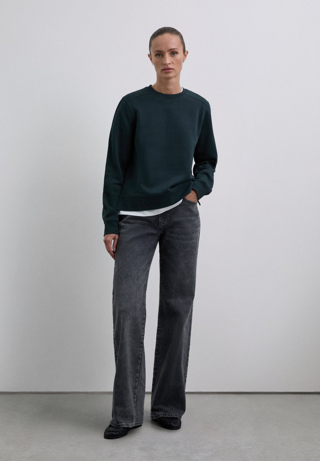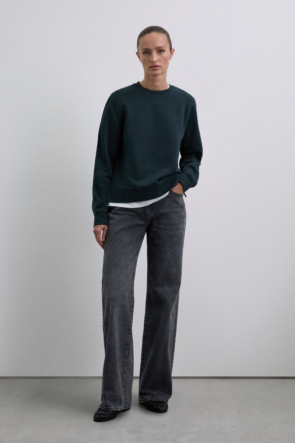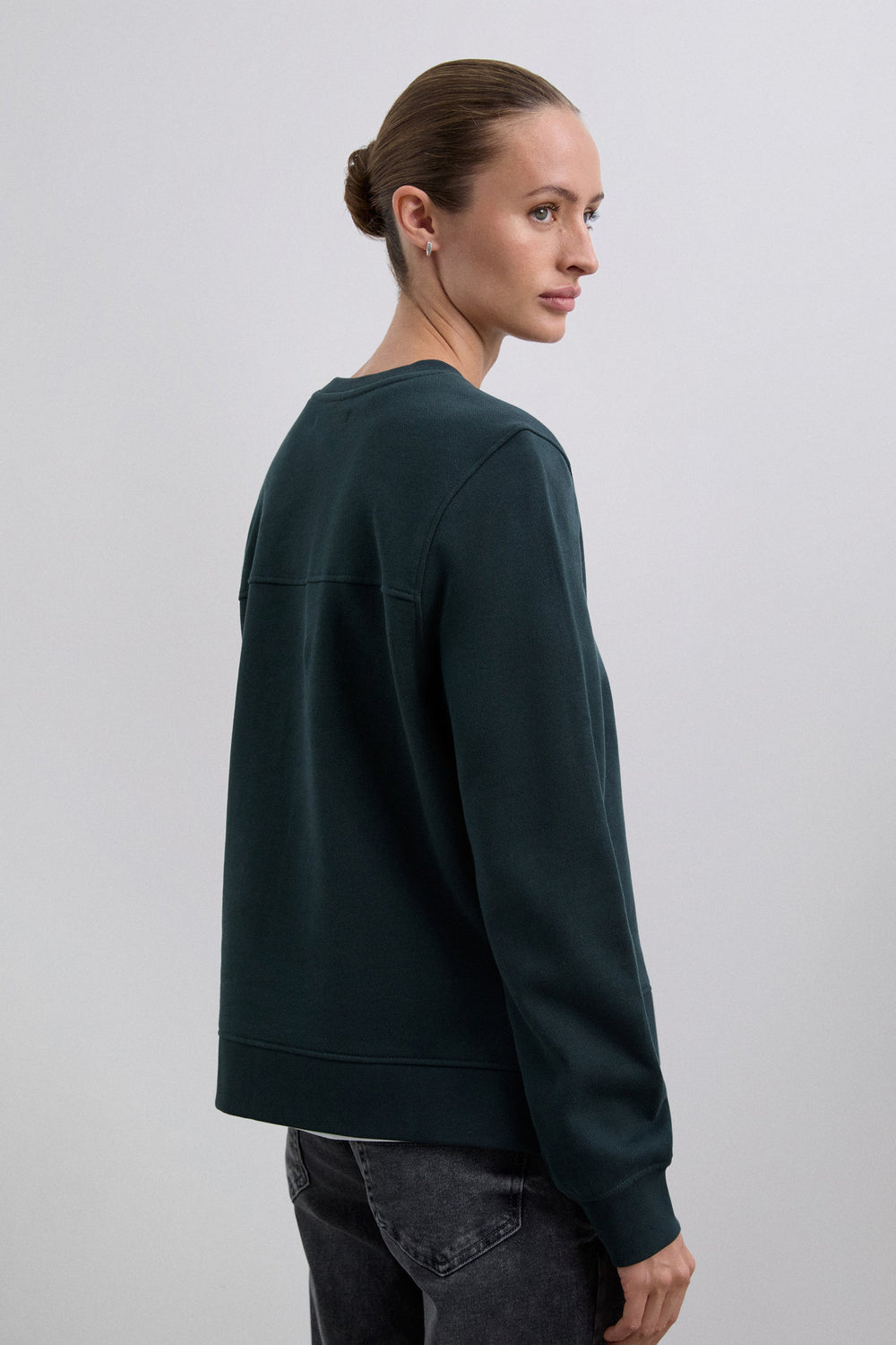 Sudadera confeccionada en algodón orgánico 100%. Corte regular fit, cuello redondo y manga larga con puños acabados en rib. Bajo asimétrico, parte trasera alargada. Detalle de calavera bordada en pecho.