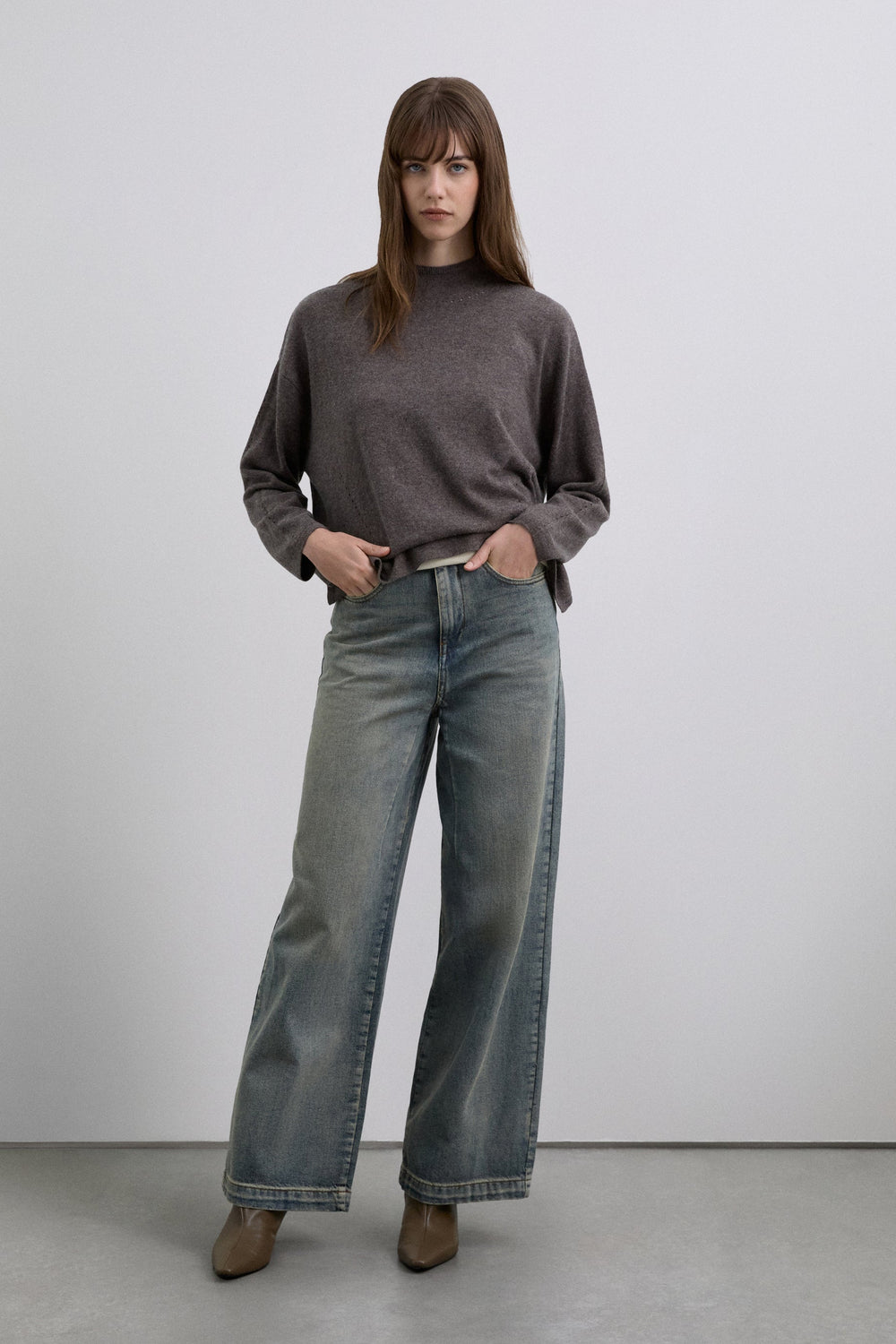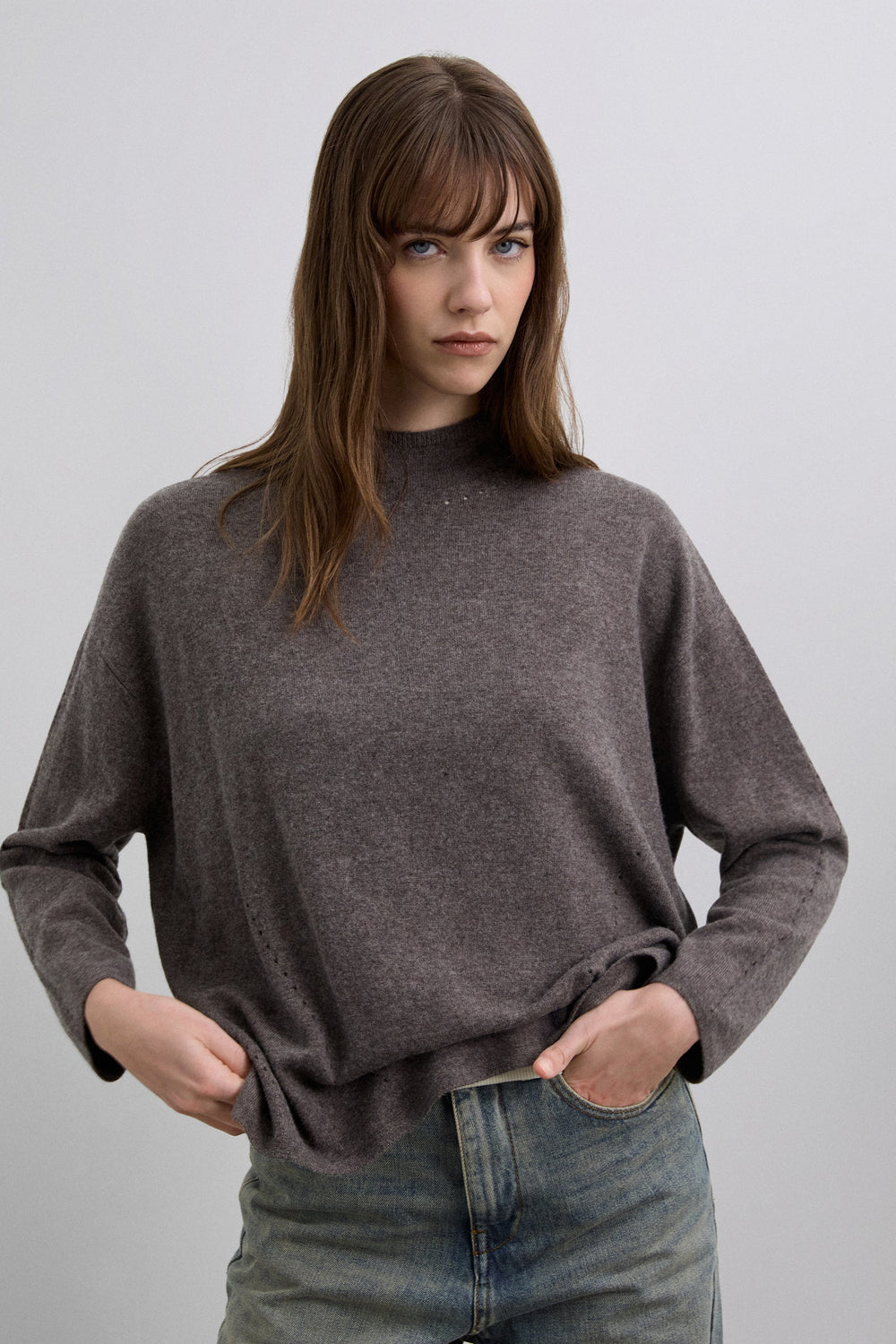 Jersey cuello alto confeccionado con mezcla de lana. Regular fit. Manga larga. Detalles de mini aberturas frontales, cuello y mangas.