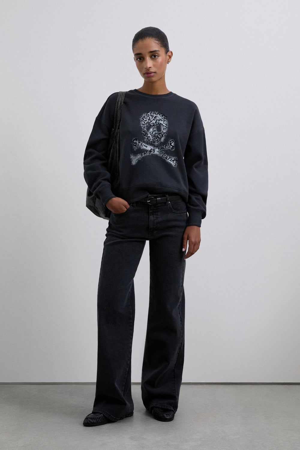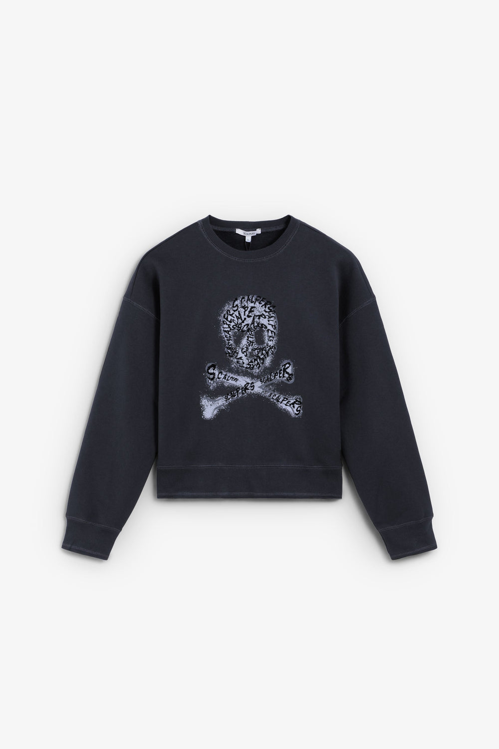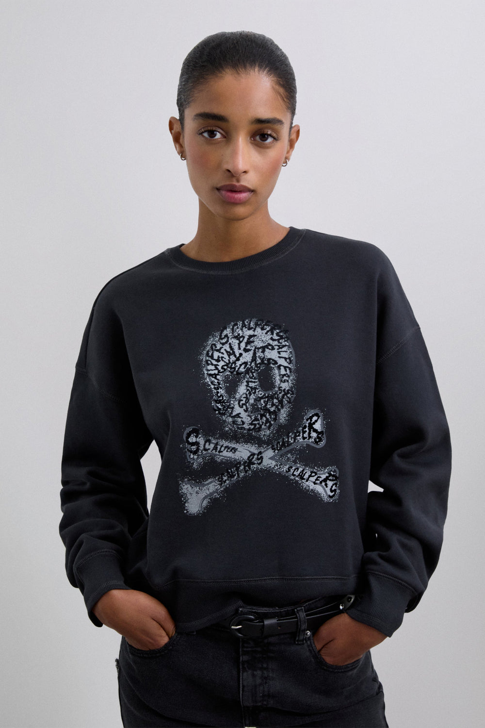 Sudadera confeccionada en algodón BCI con elastano. Corte regular fit, cuello redondo y manga larga con puños acabados en rib. Print de calavera frontal con flock.