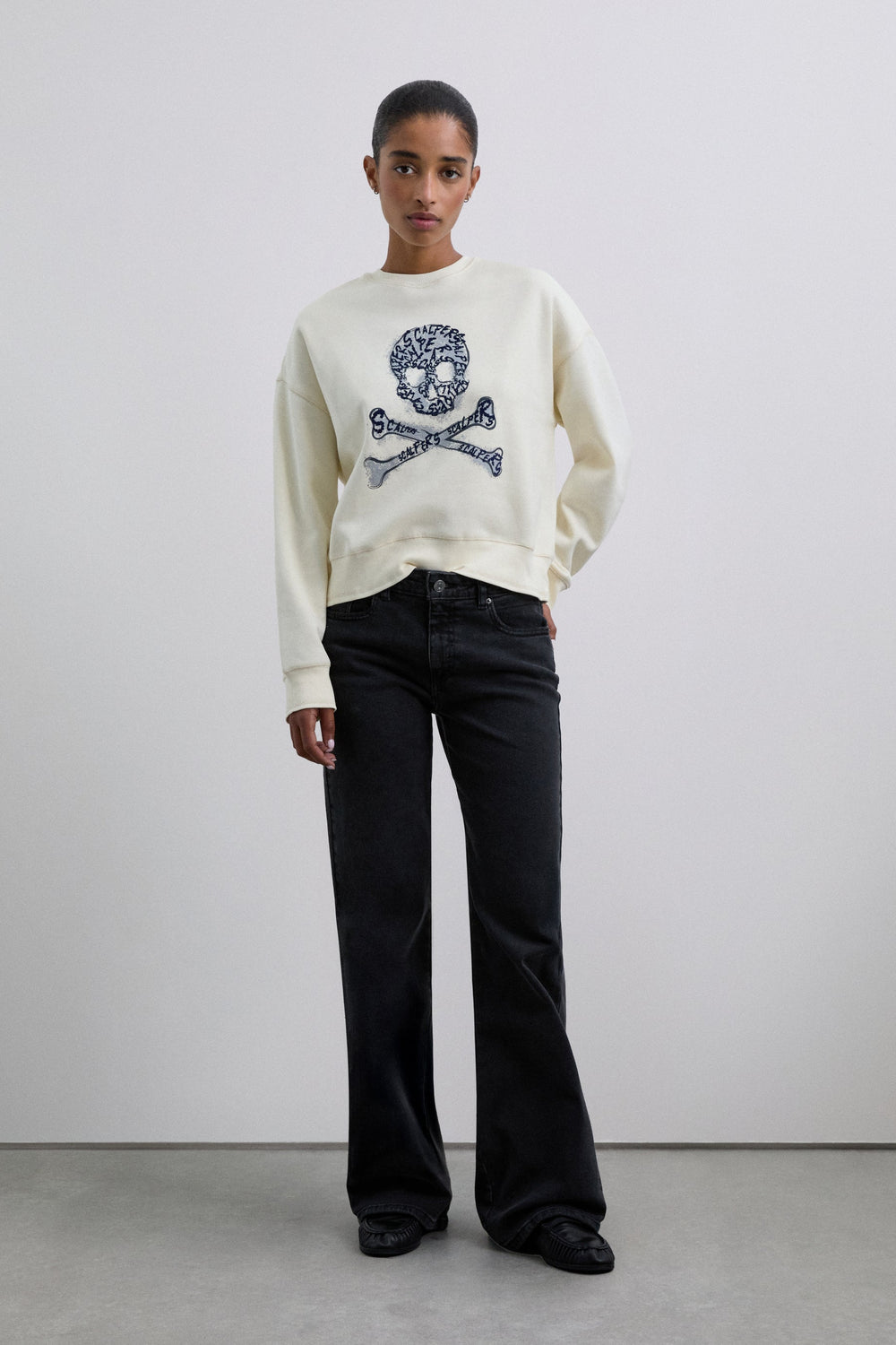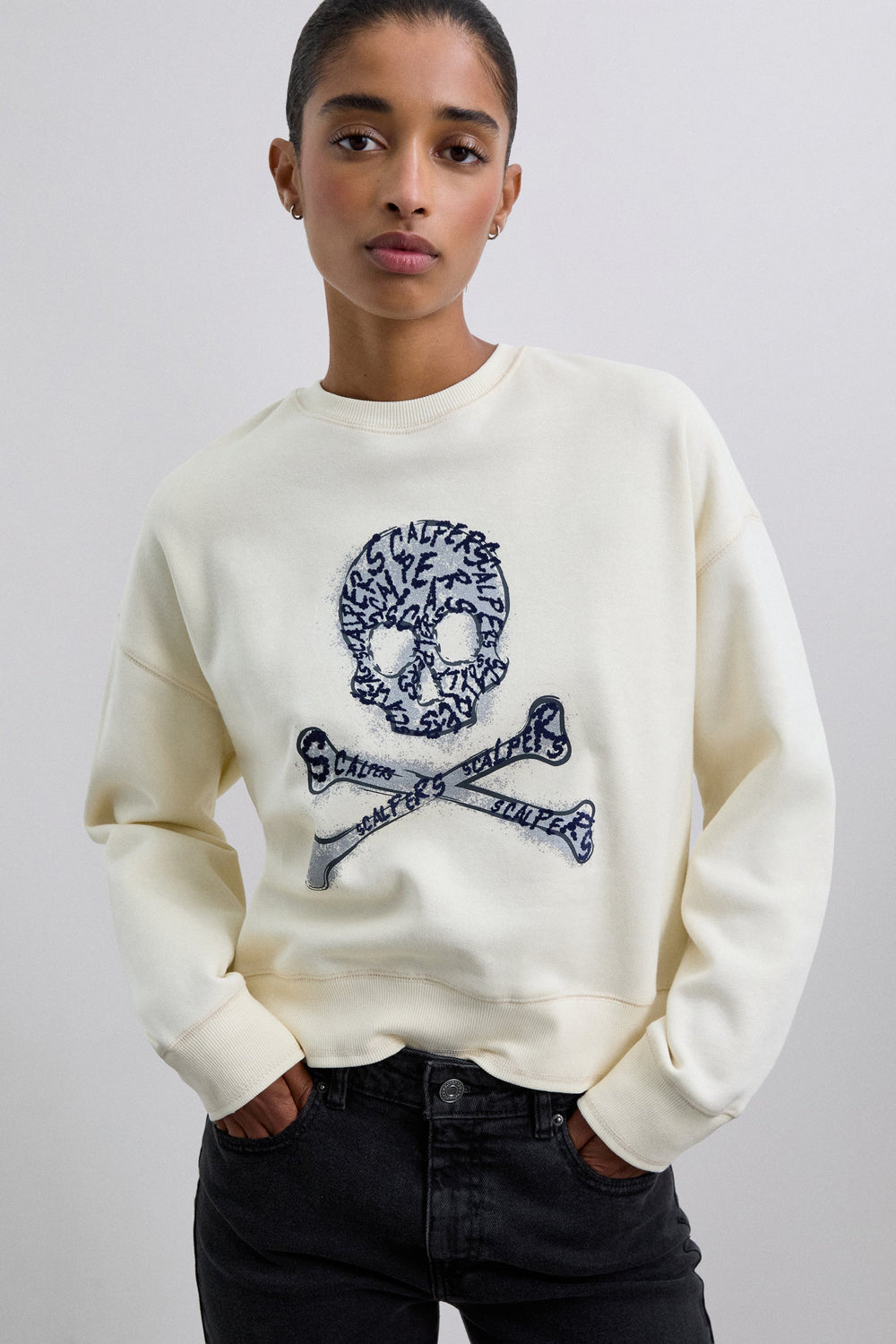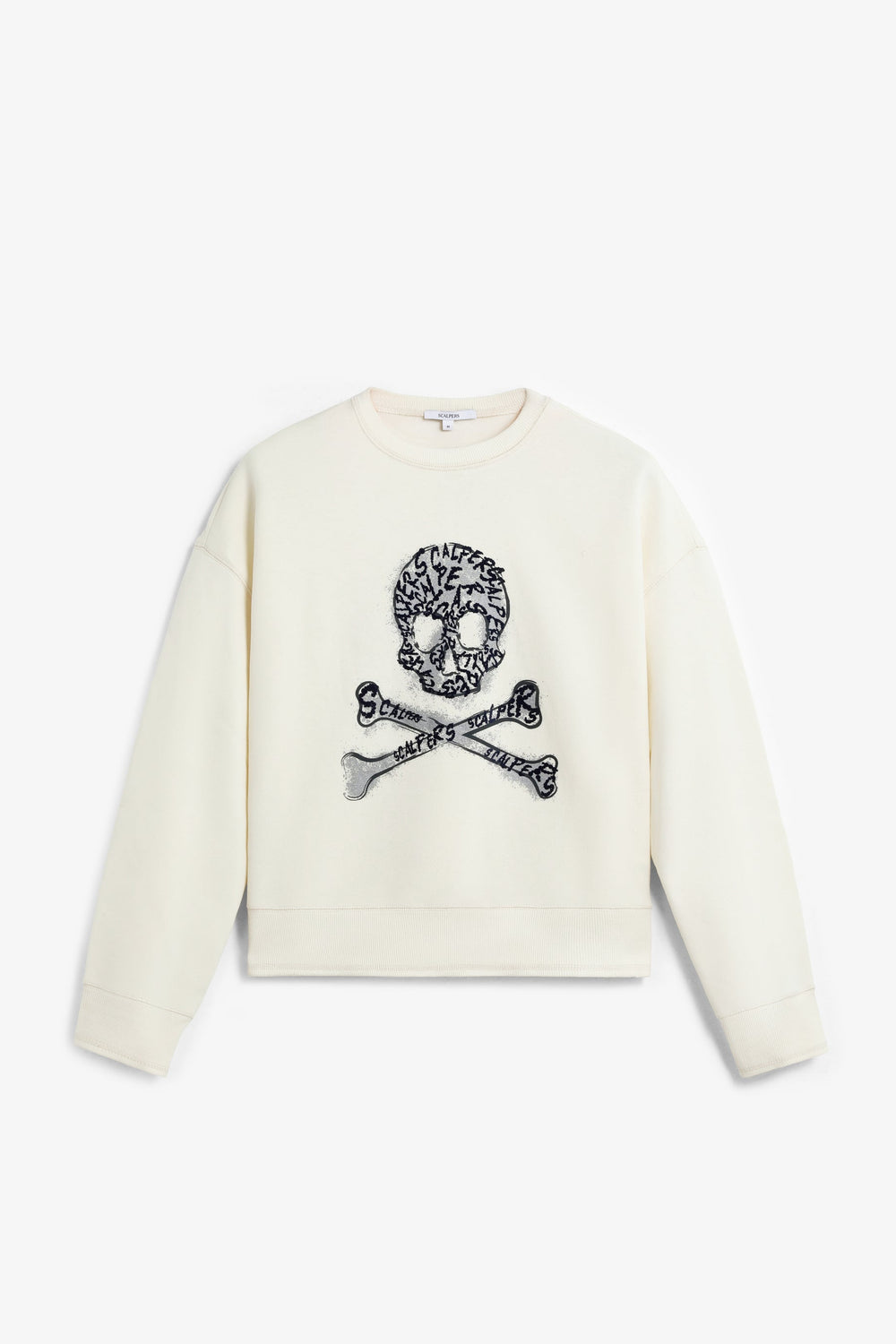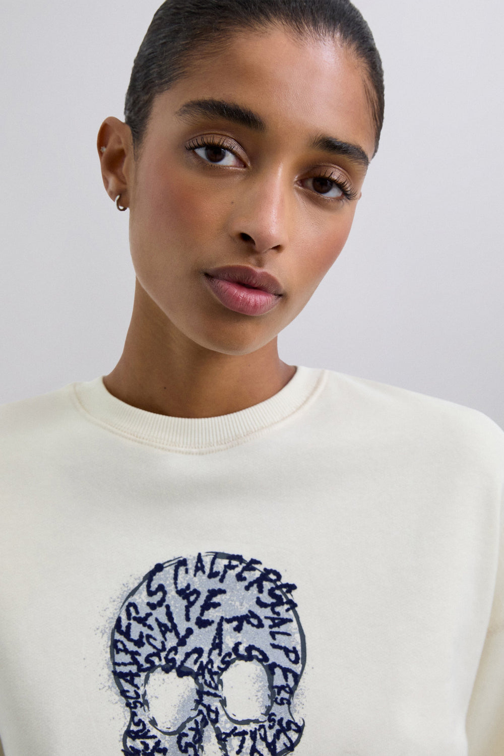 Sudadera confeccionada en algodón BCI con elastano. Corte regular fit, cuello redondo y manga larga con puños acabados en rib. Print de calavera frontal con flock.