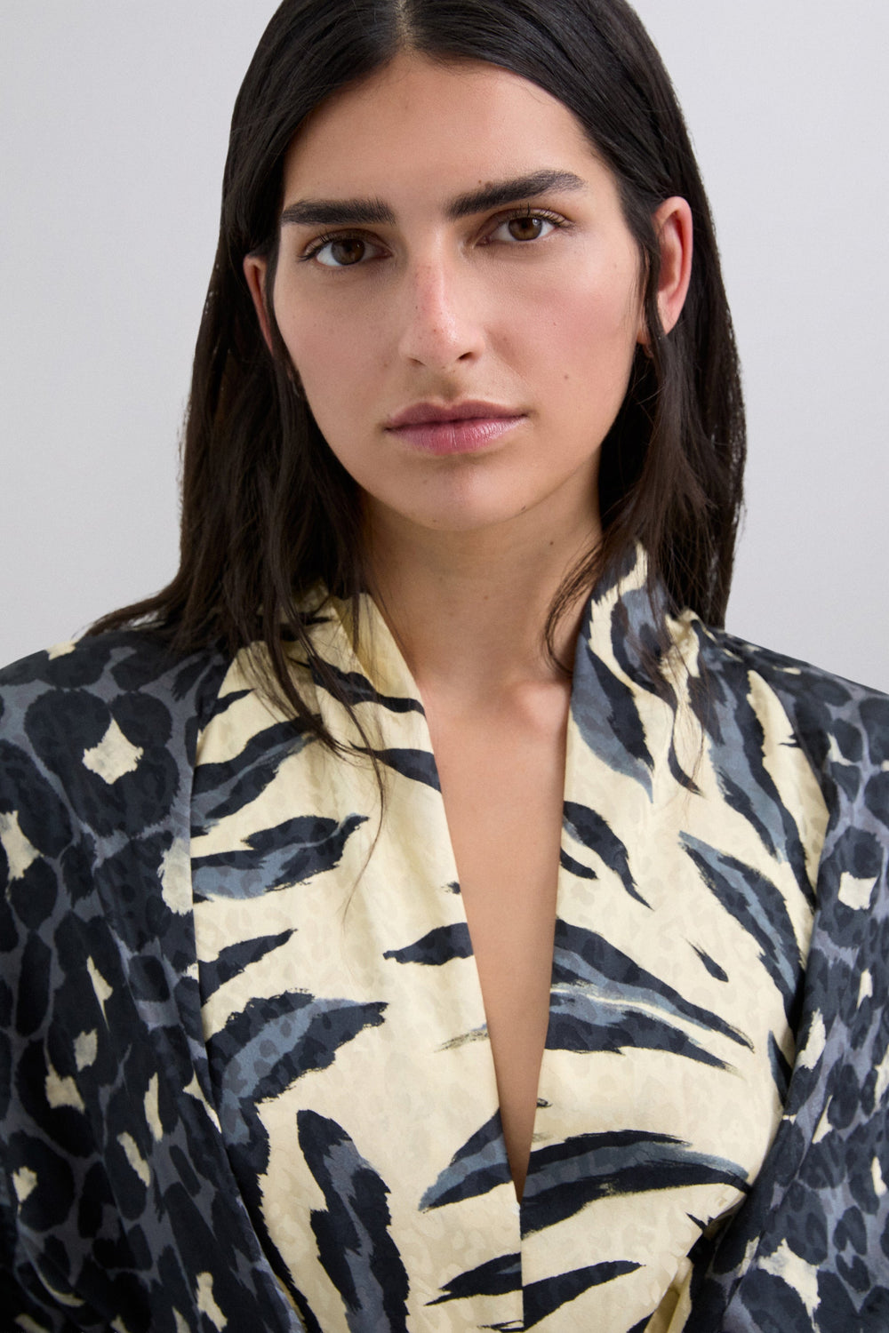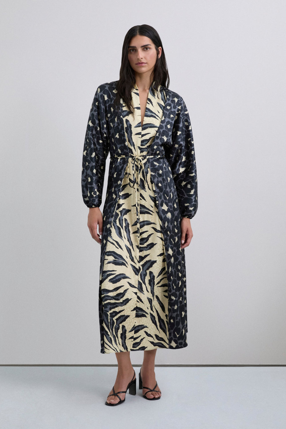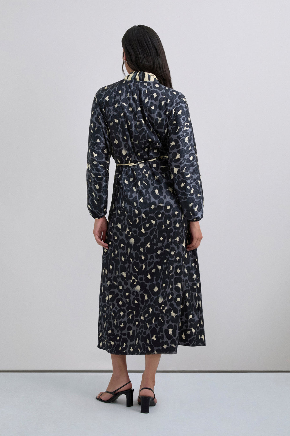 Vestido largo con estampado animal print. Manga larga ligeramente abullonada y terminada en frunce. Ajuste frontal mediante lazo. Escote en V.