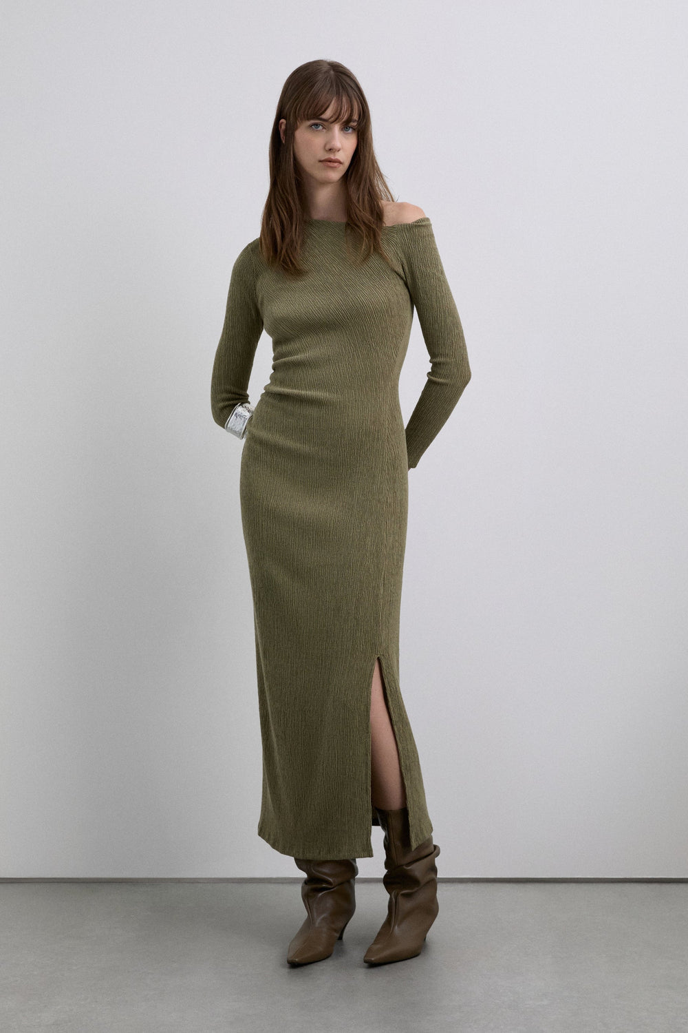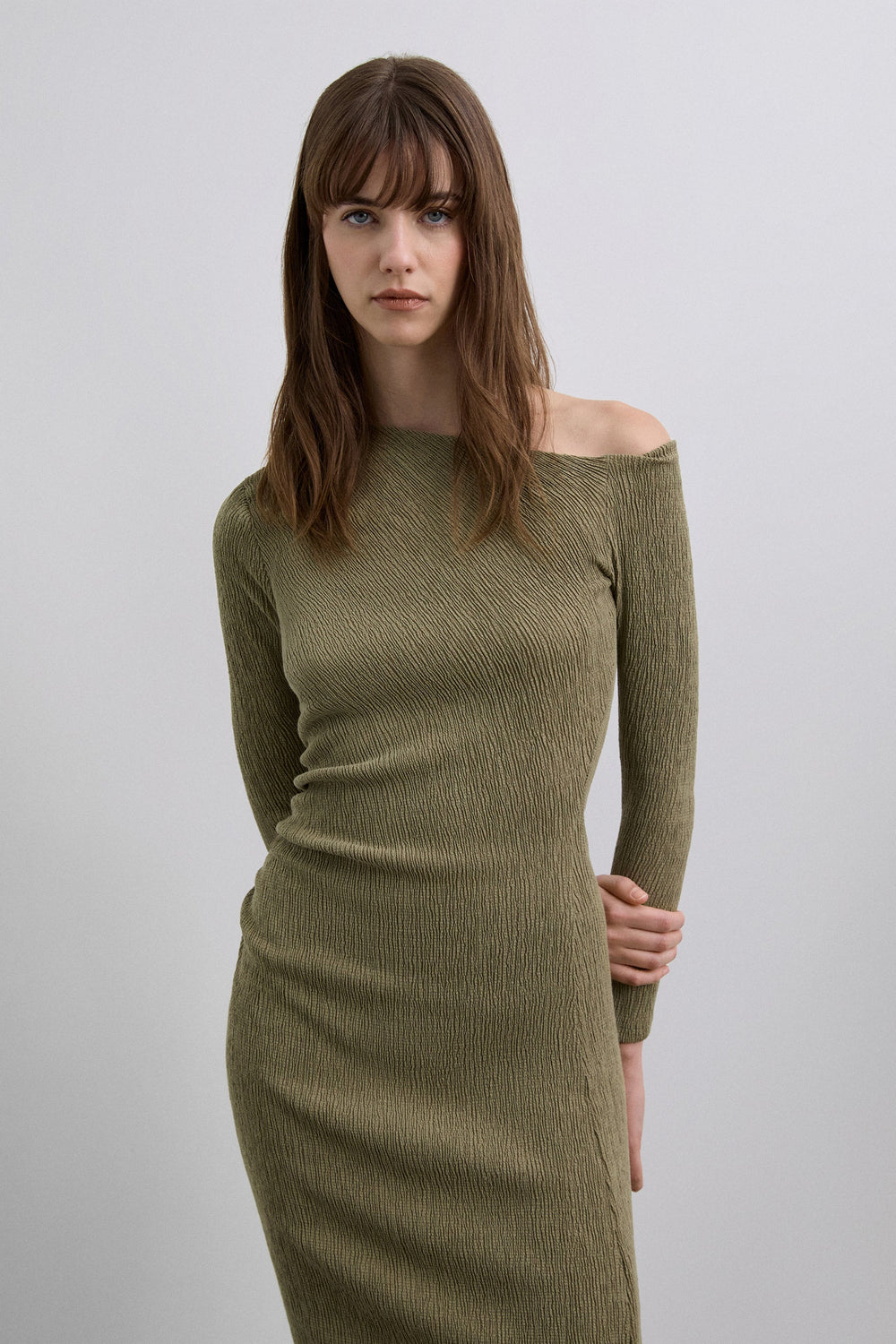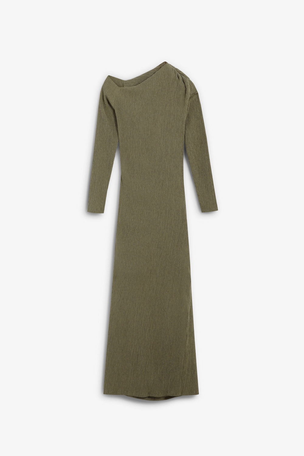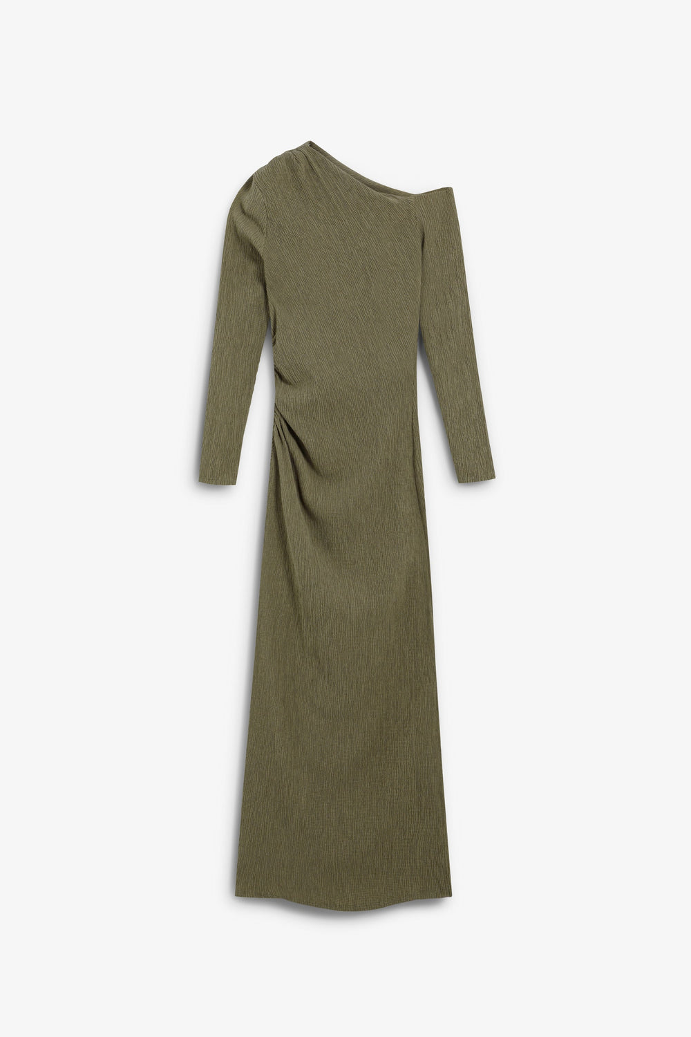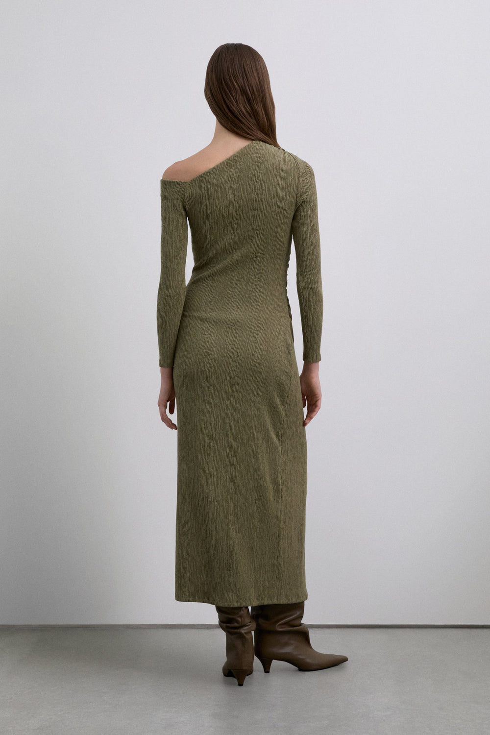 Vestido de punto confeccionado en algodón ligeramente elástico. Corte slim fit. Escote asimétrico. Manga larga ajustada. Frunces en hombro y en cintura.