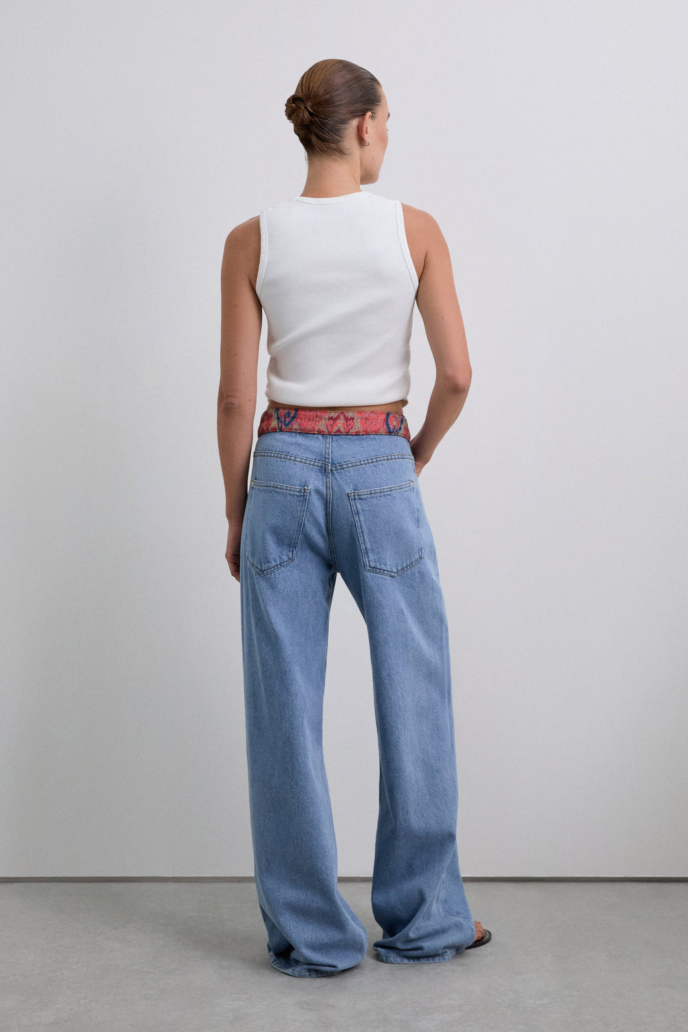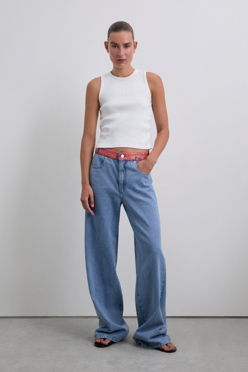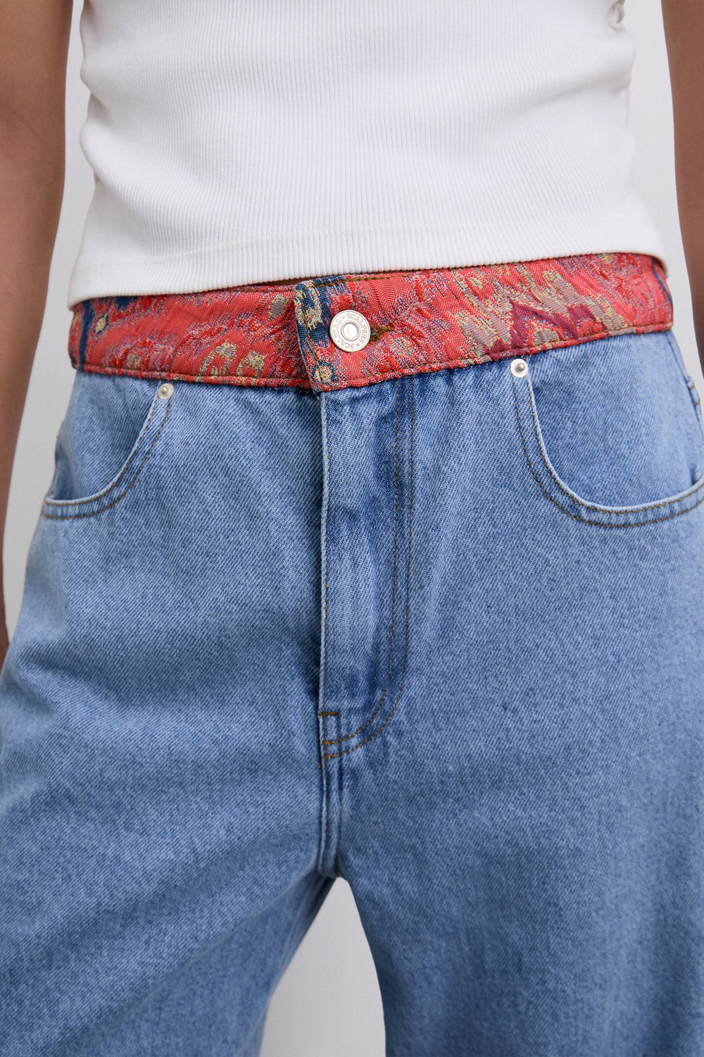 Pantalón denim largo, de tiro medio. Tejido de contraste en la cintura. Cierre mediante botón. Bolsillos delanteros y traseros.