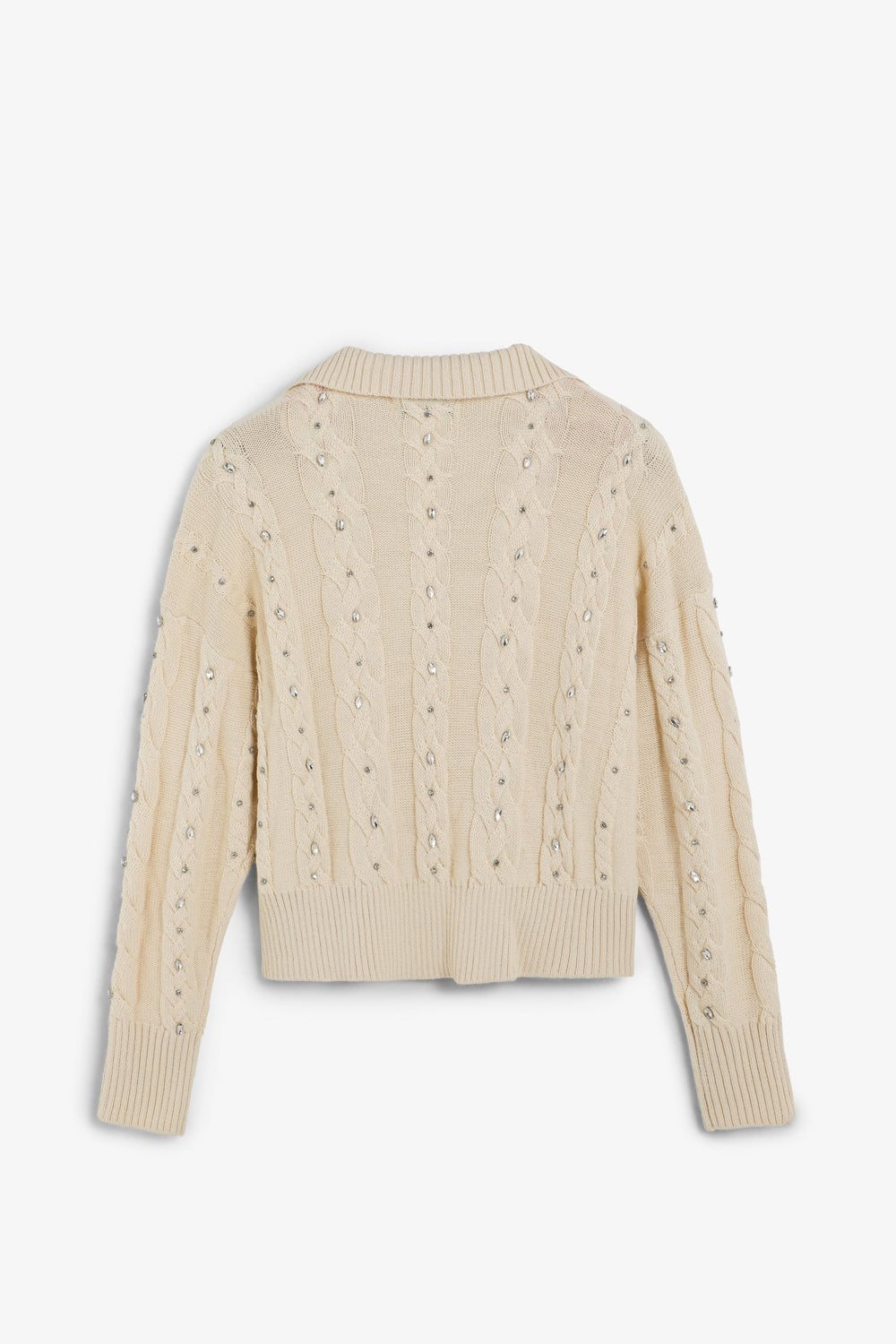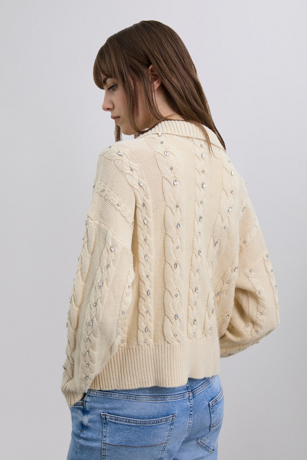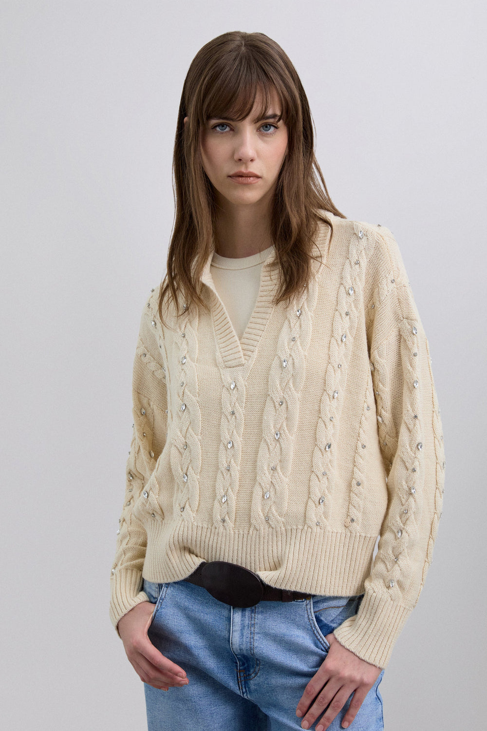 Jersey tipo polo confeccionado en mezcla con lana. Punto en ochos con detalles de strass. Regular fit. Cuello polero con acabado en rib. Manga larga con puños acabados en rib.