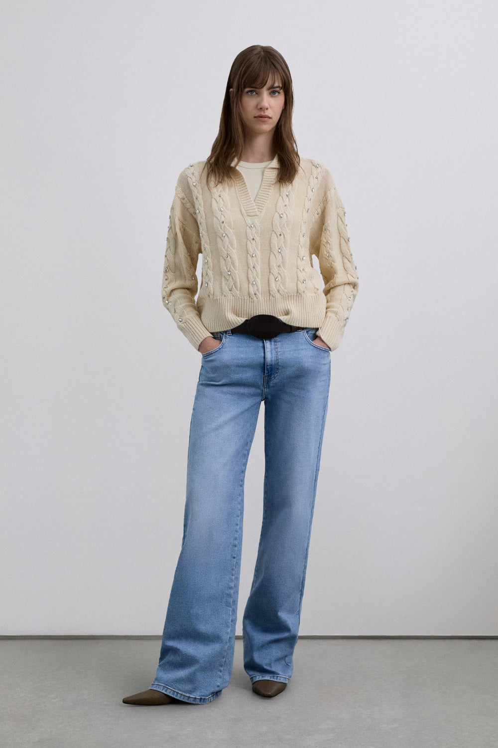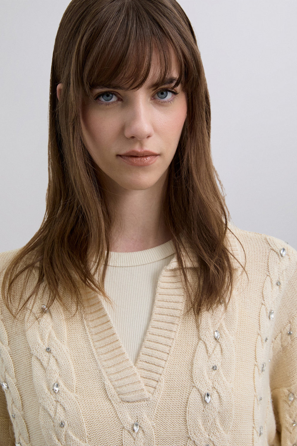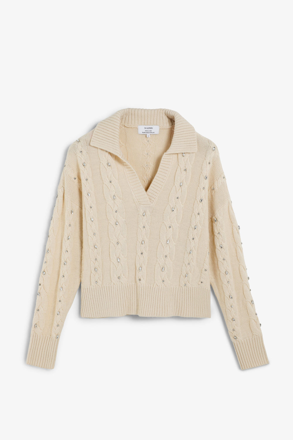 Jersey tipo polo confeccionado en mezcla con lana. Punto en ochos con detalles de strass. Regular fit. Cuello polero con acabado en rib. Manga larga con puños acabados en rib.