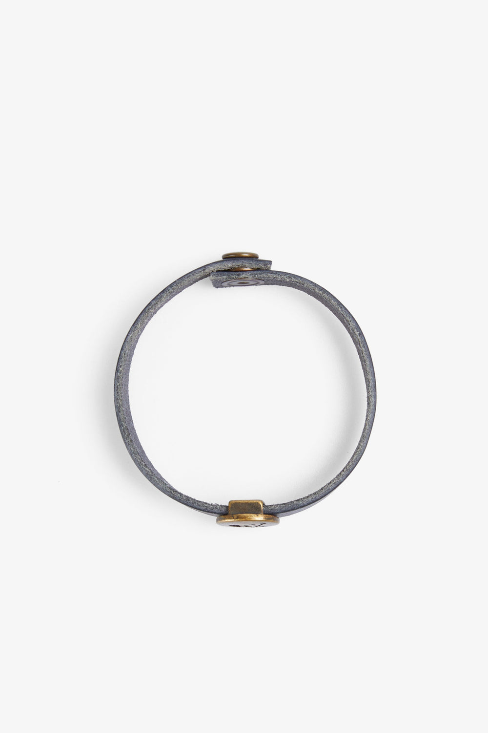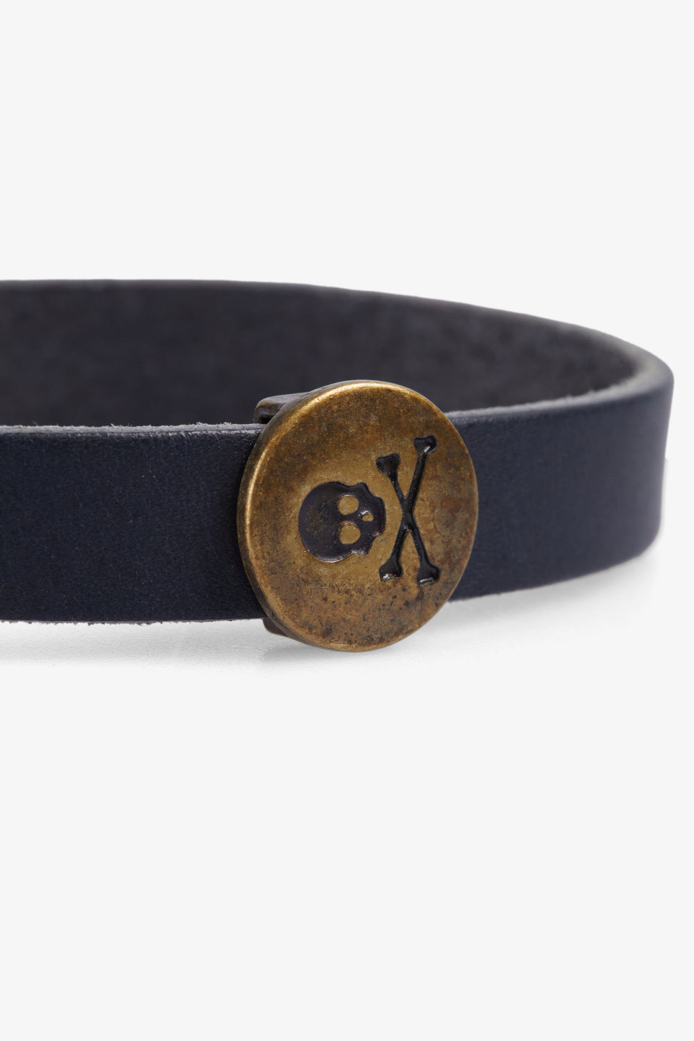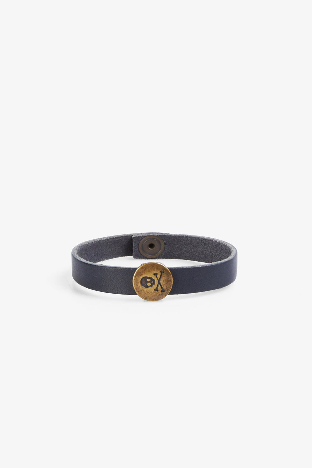 Pulsera confeccionada en 100% piel. Detalle de aplique metálico con calavera. Cierre a con botón a presión.