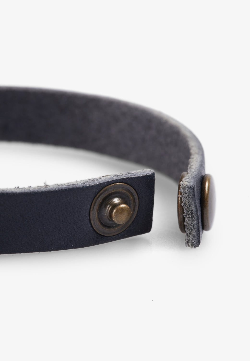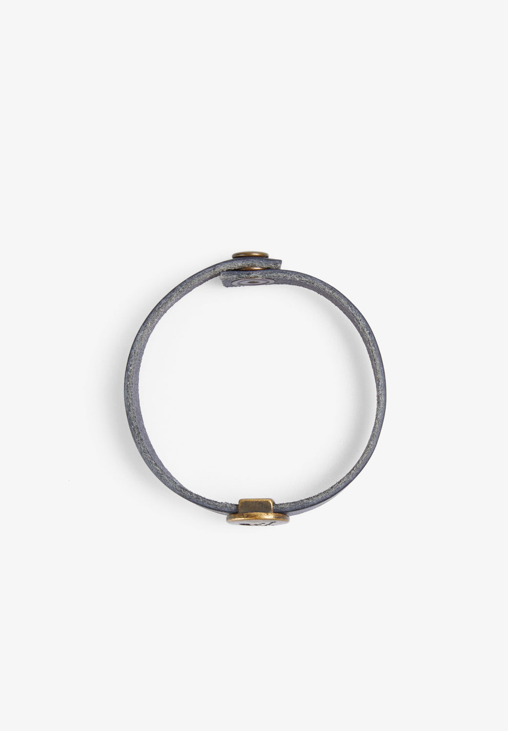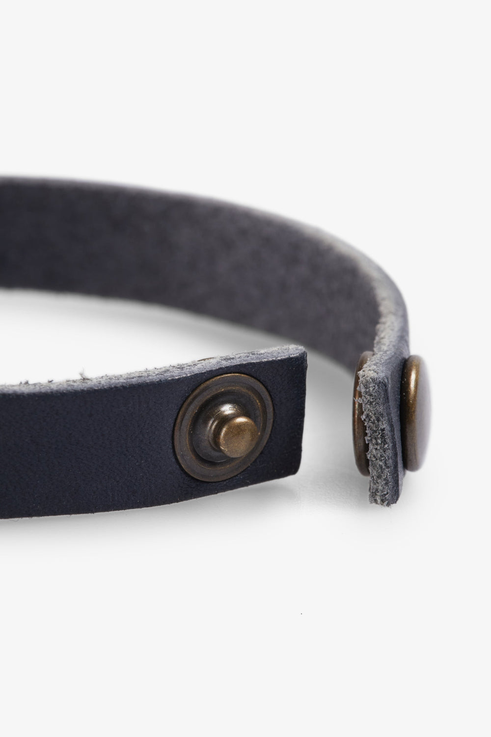 Pulsera confeccionada en 100% piel. Detalle de aplique metálico con calavera. Cierre a con botón a presión.