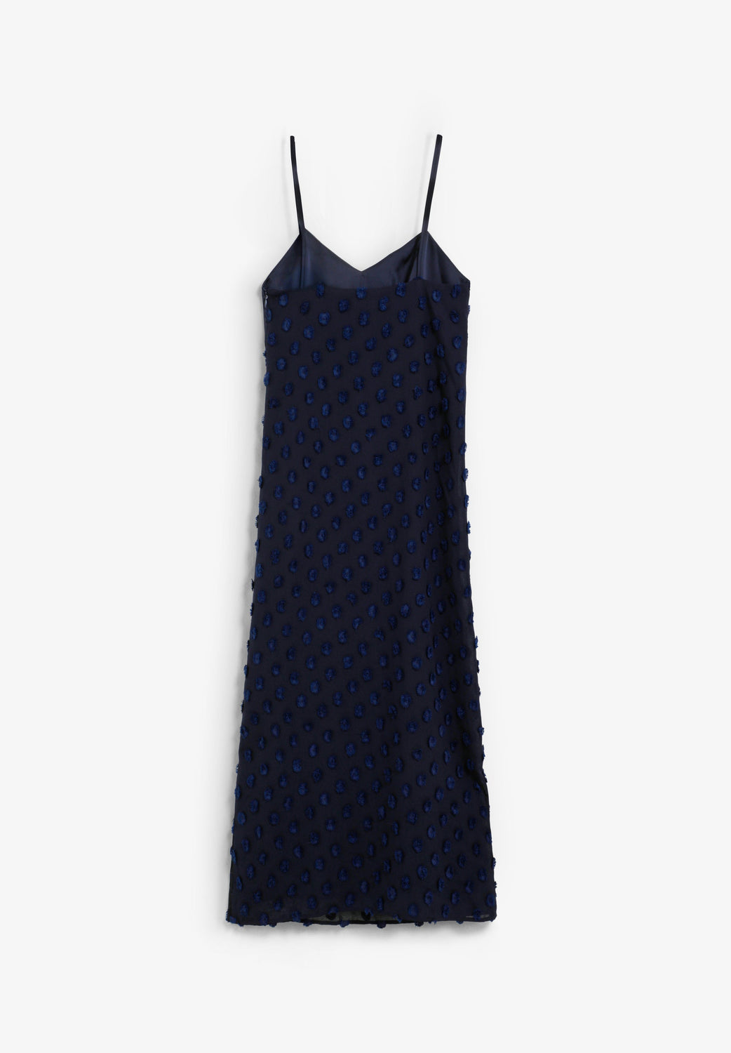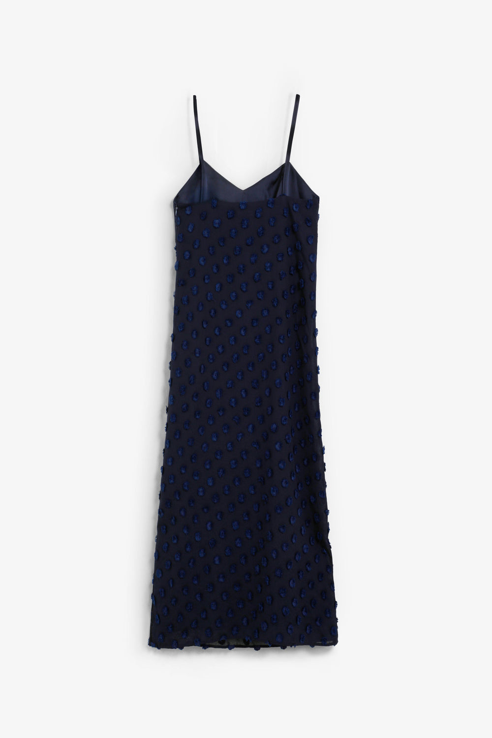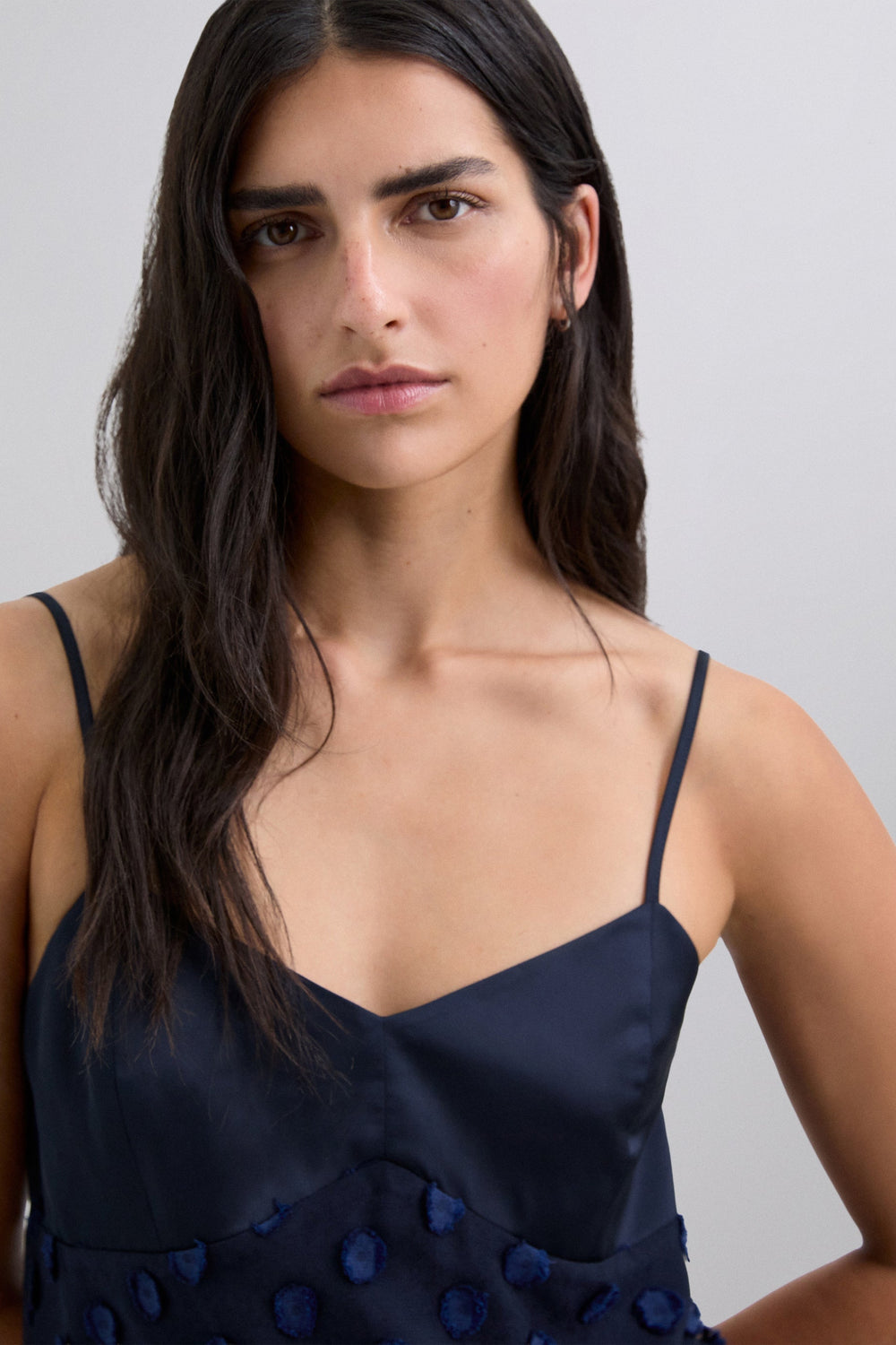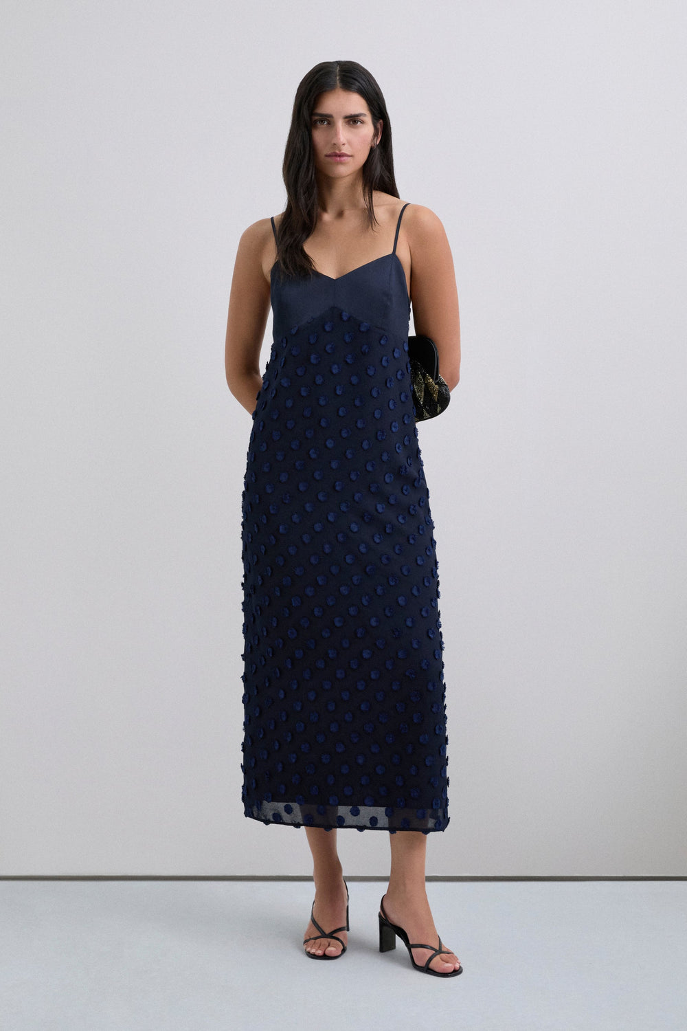 Vestido midi confeccionado en tejido fluido con acabado satinado. Cuerpo con detalles de lunares despuntados. Tirantes finos, escote ligeramente en V y cierre con cremallera lateral oculta.