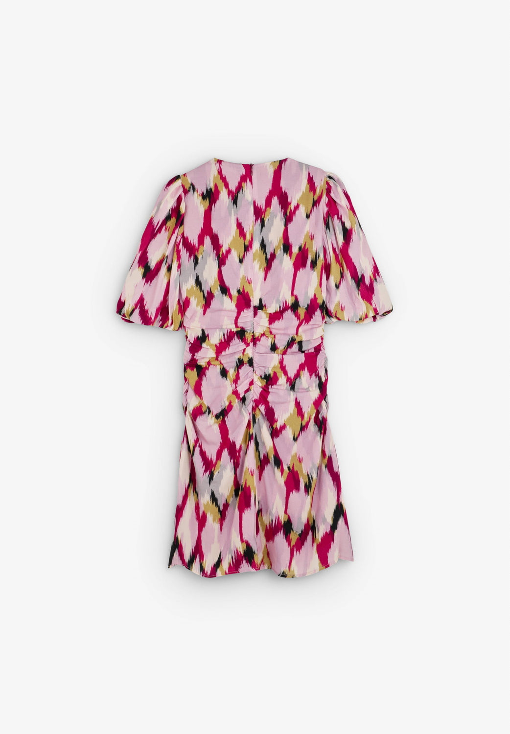 Vestido confeccionado en tejido fluido. Mini, corte Slim Fit, escote en V con frunces en cintura y manga corta abullonada. Forro interior y cierre trasero con cremallera oculta.