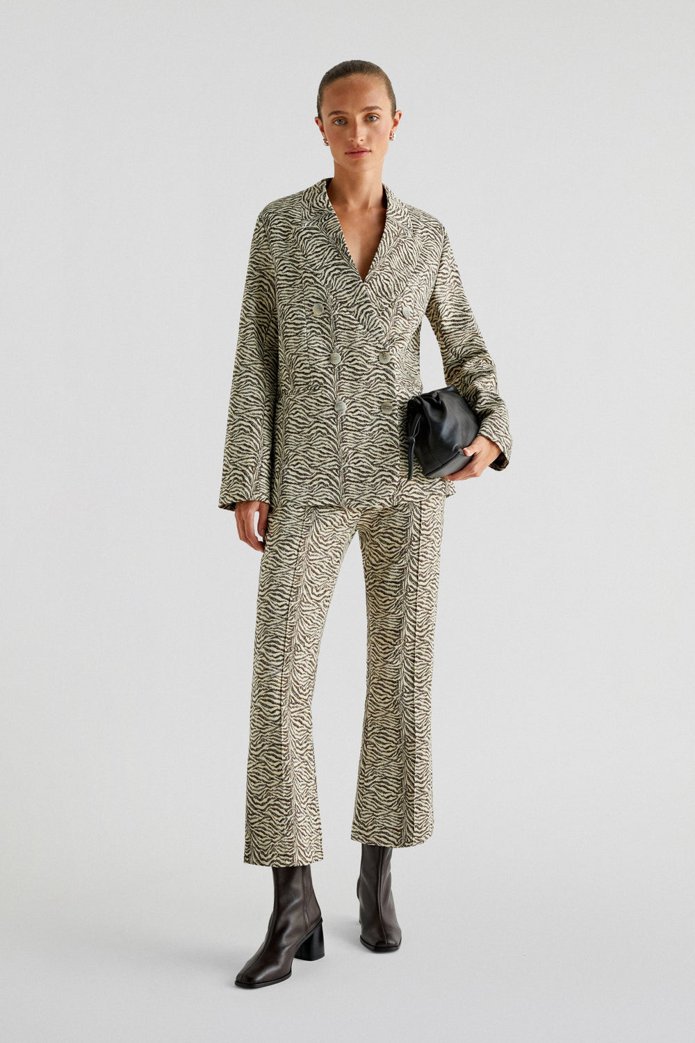 Pantalón animal print confeccionado en tejido de algodón ligeramente elástico. Corte flare y cierre con cremallera. Detalle de costuras marcadas.