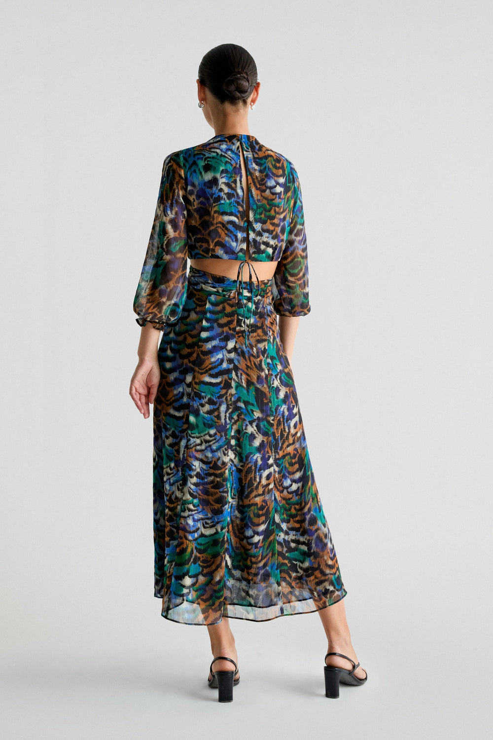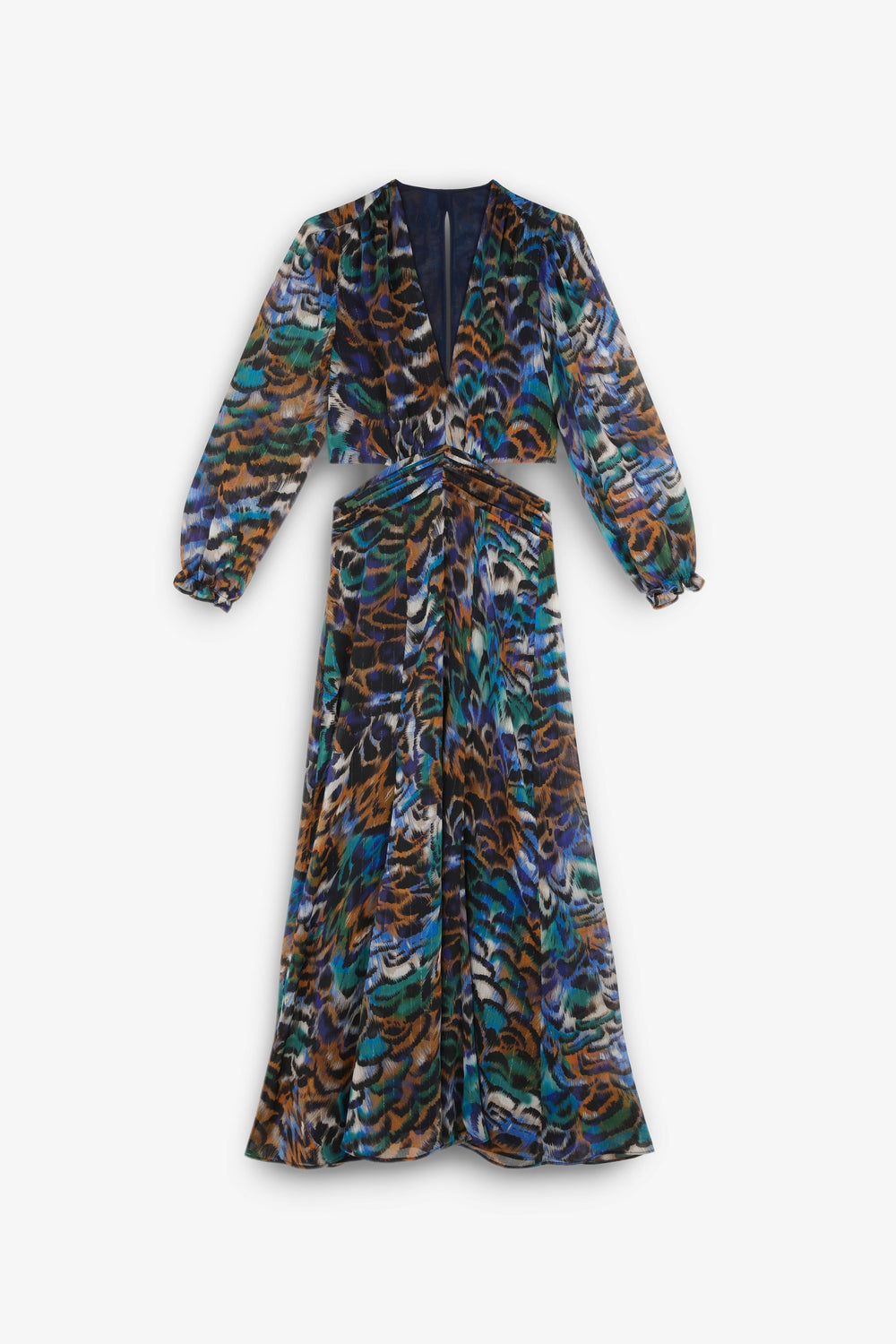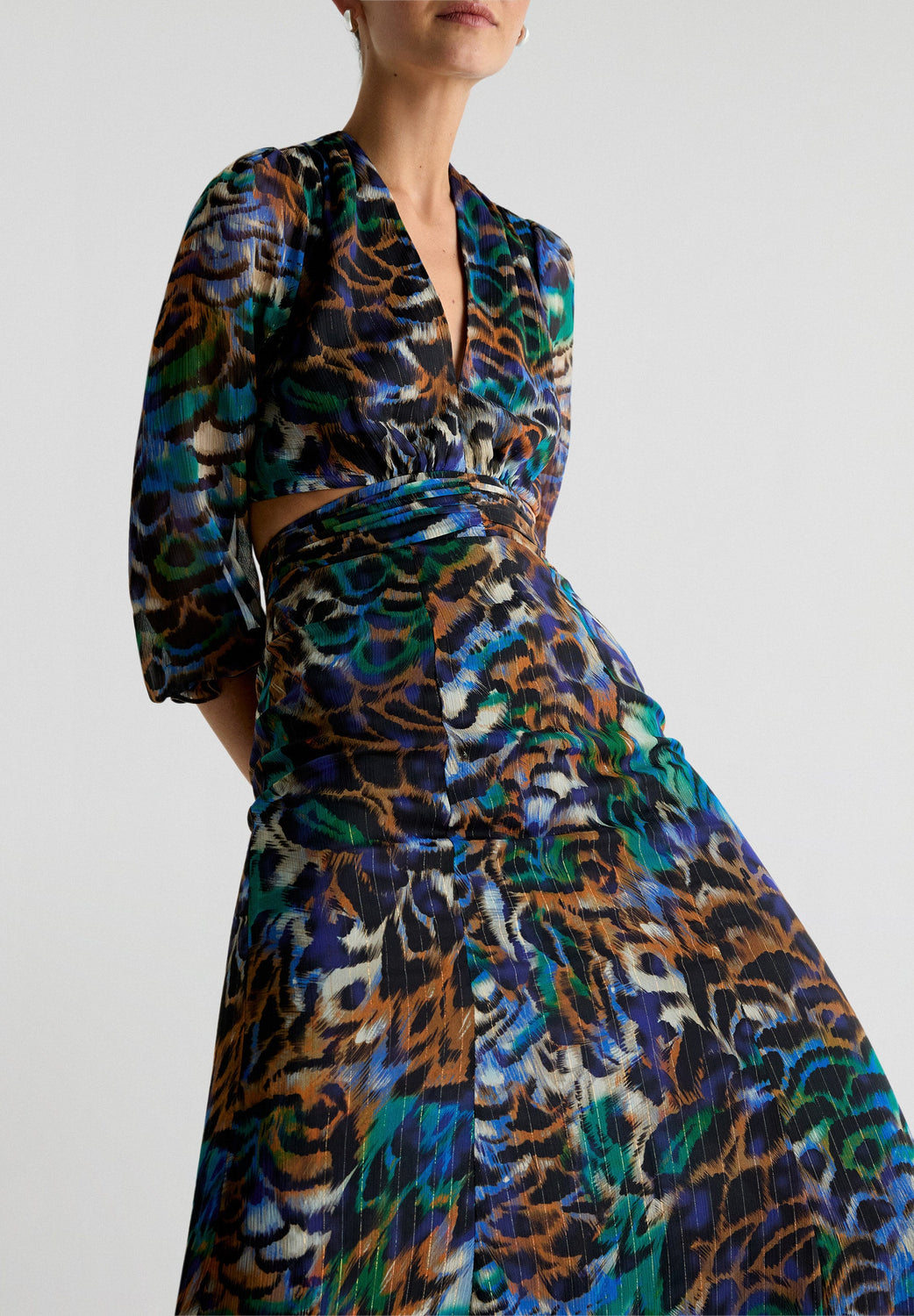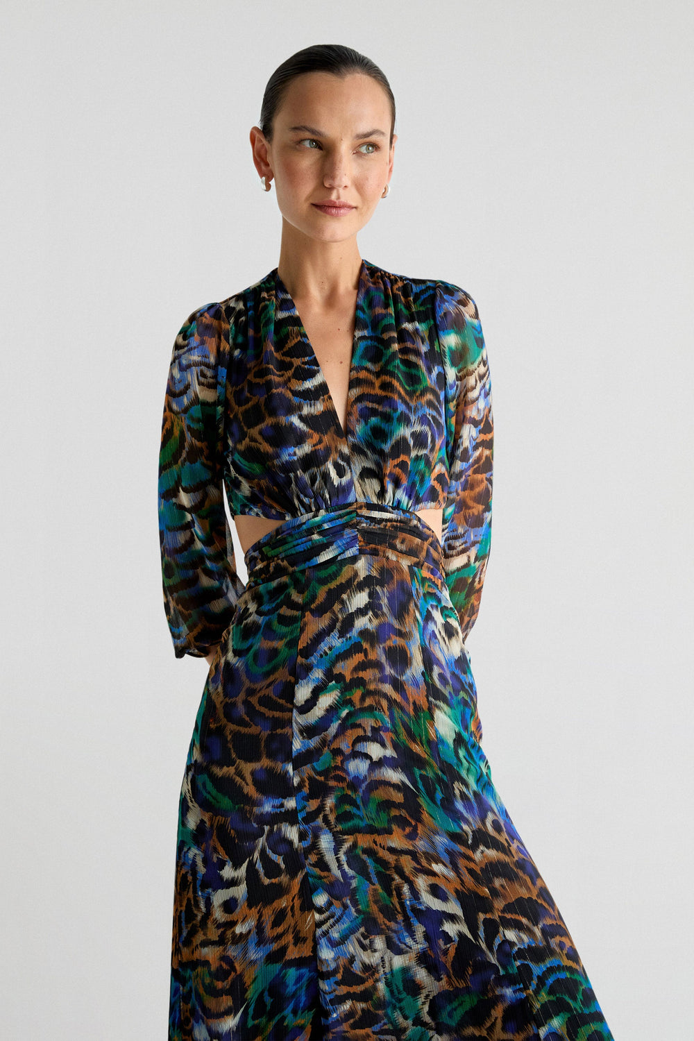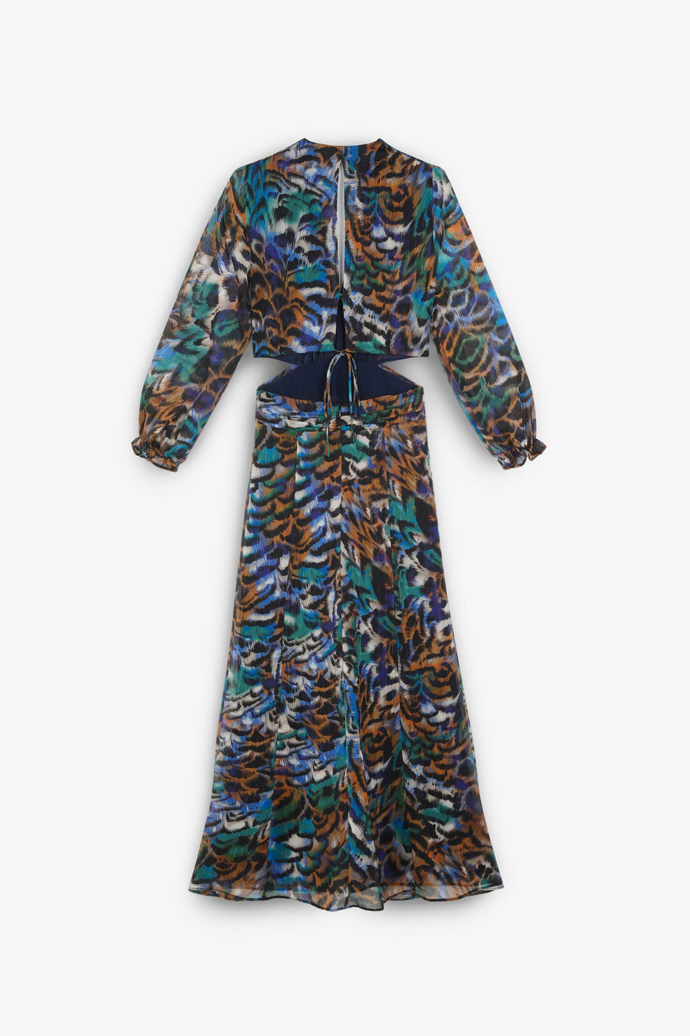 Vestido midi con print confeccionado en tejido fluido. Regular fit con cut out, cierre con cremallera trasera y manga larga.