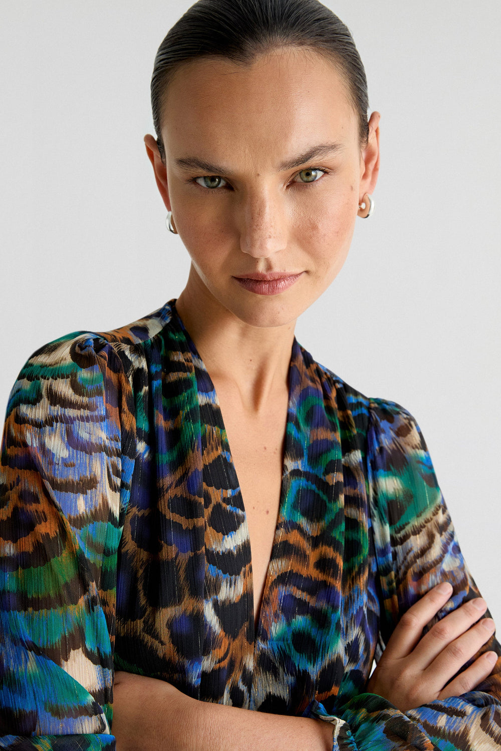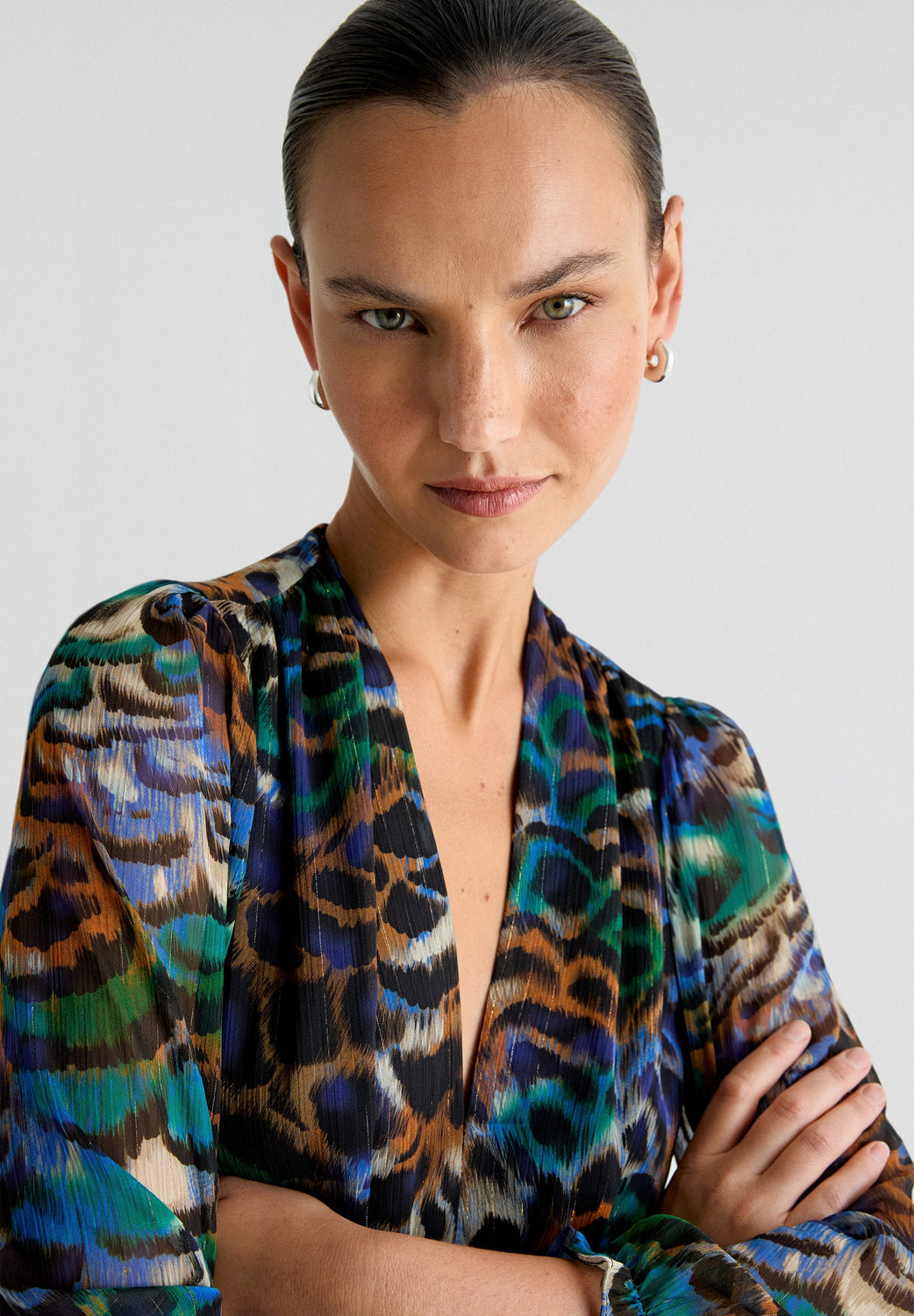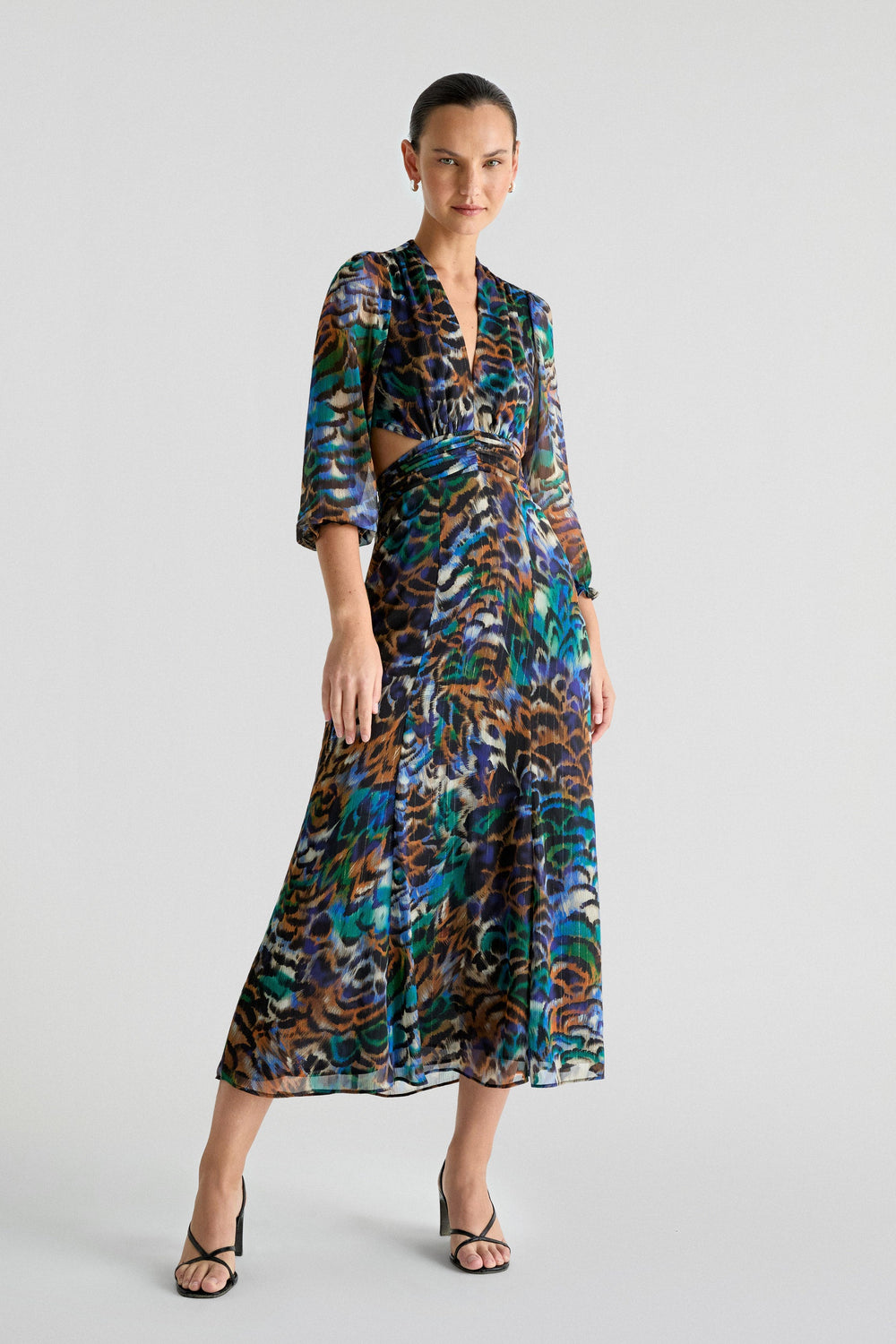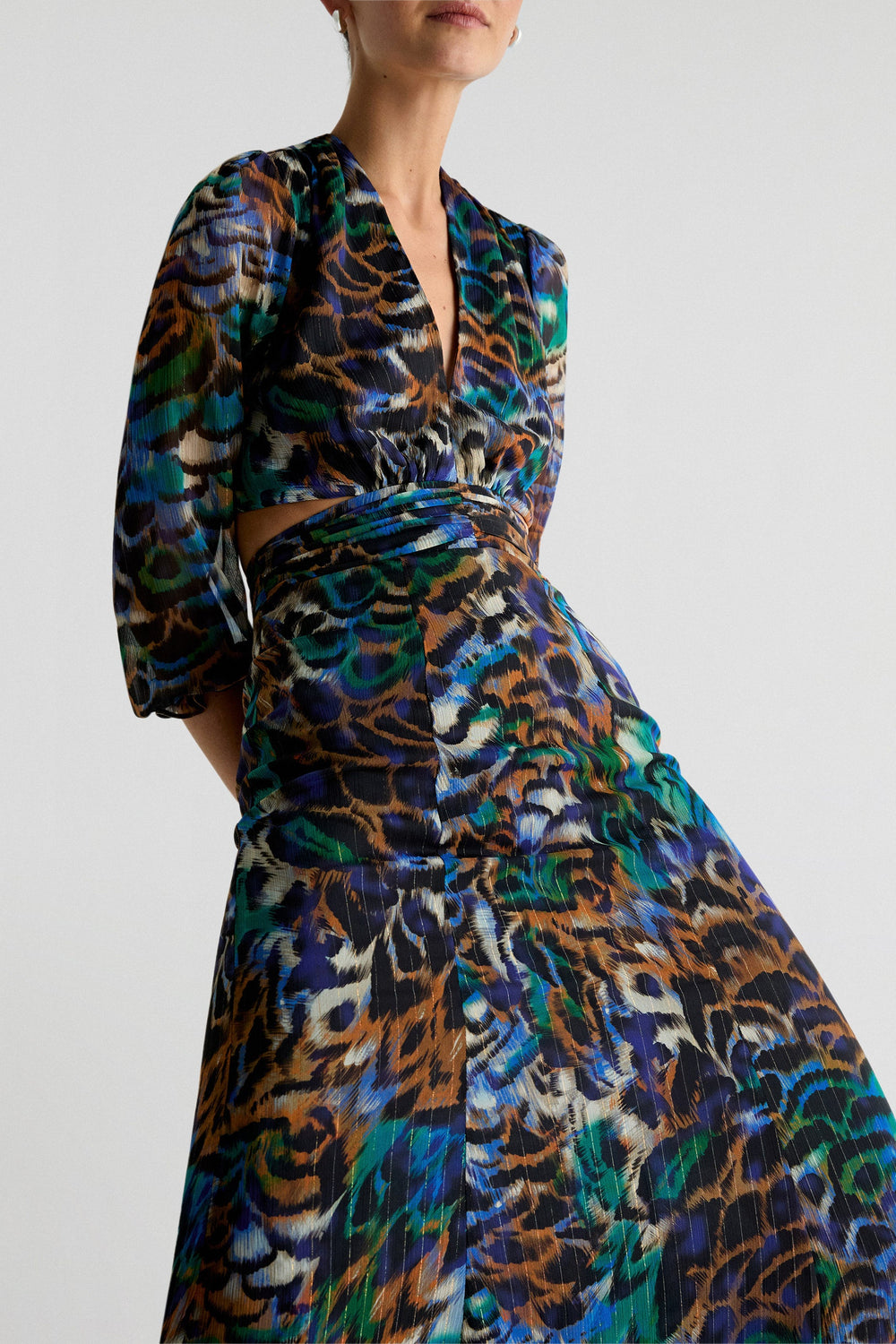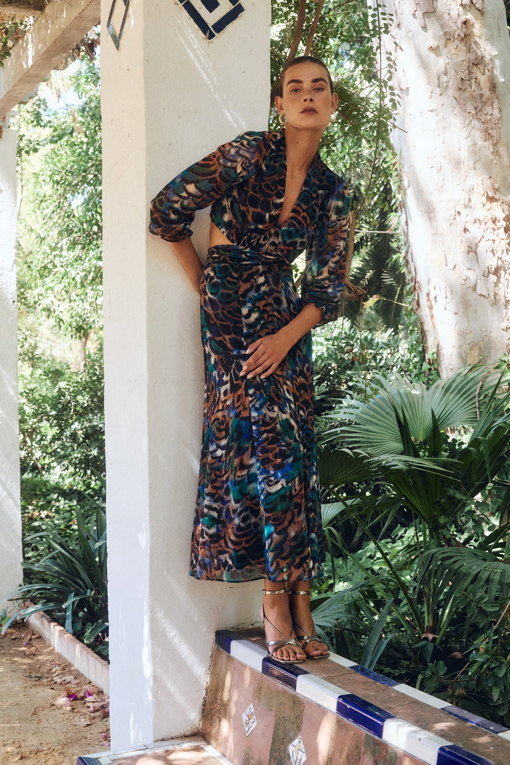 Vestido midi con print confeccionado en tejido fluido. Regular fit con cut out, cierre con cremallera trasera y manga larga.