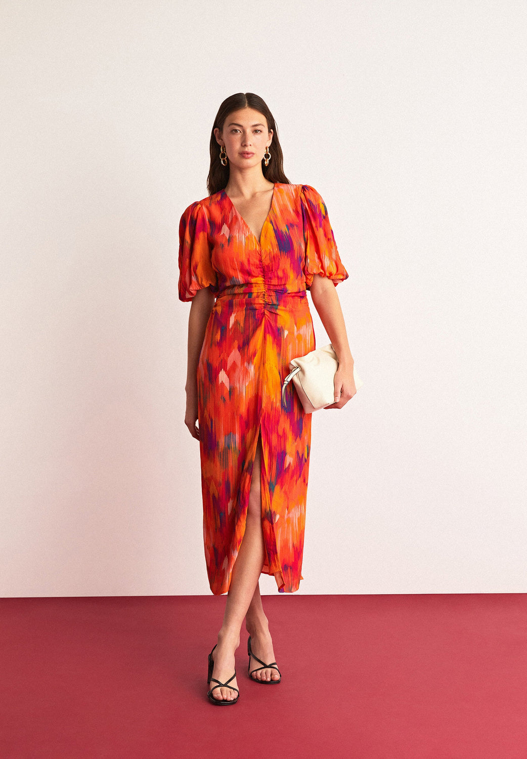 Vestido midi con print y frunce en parte delantera.