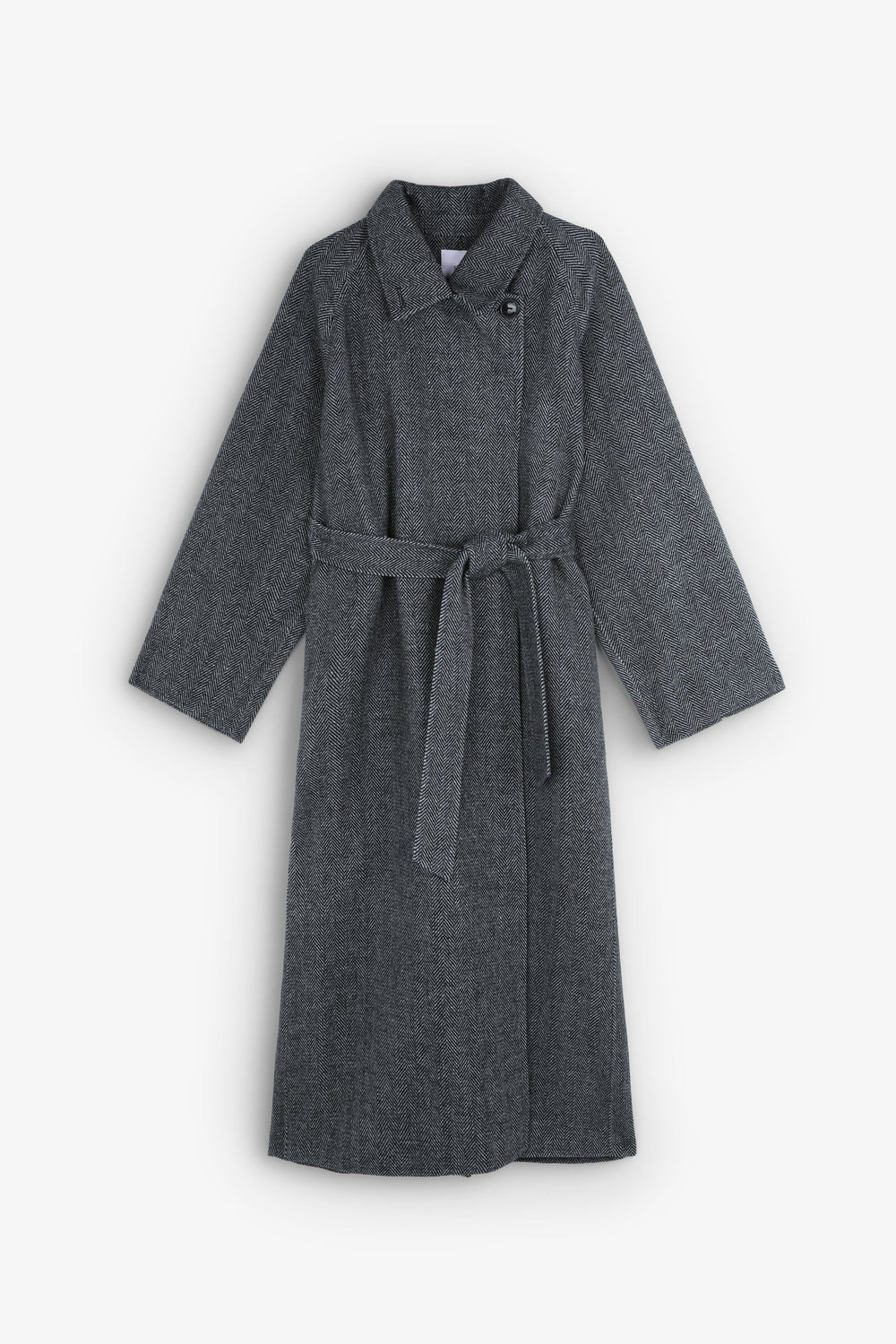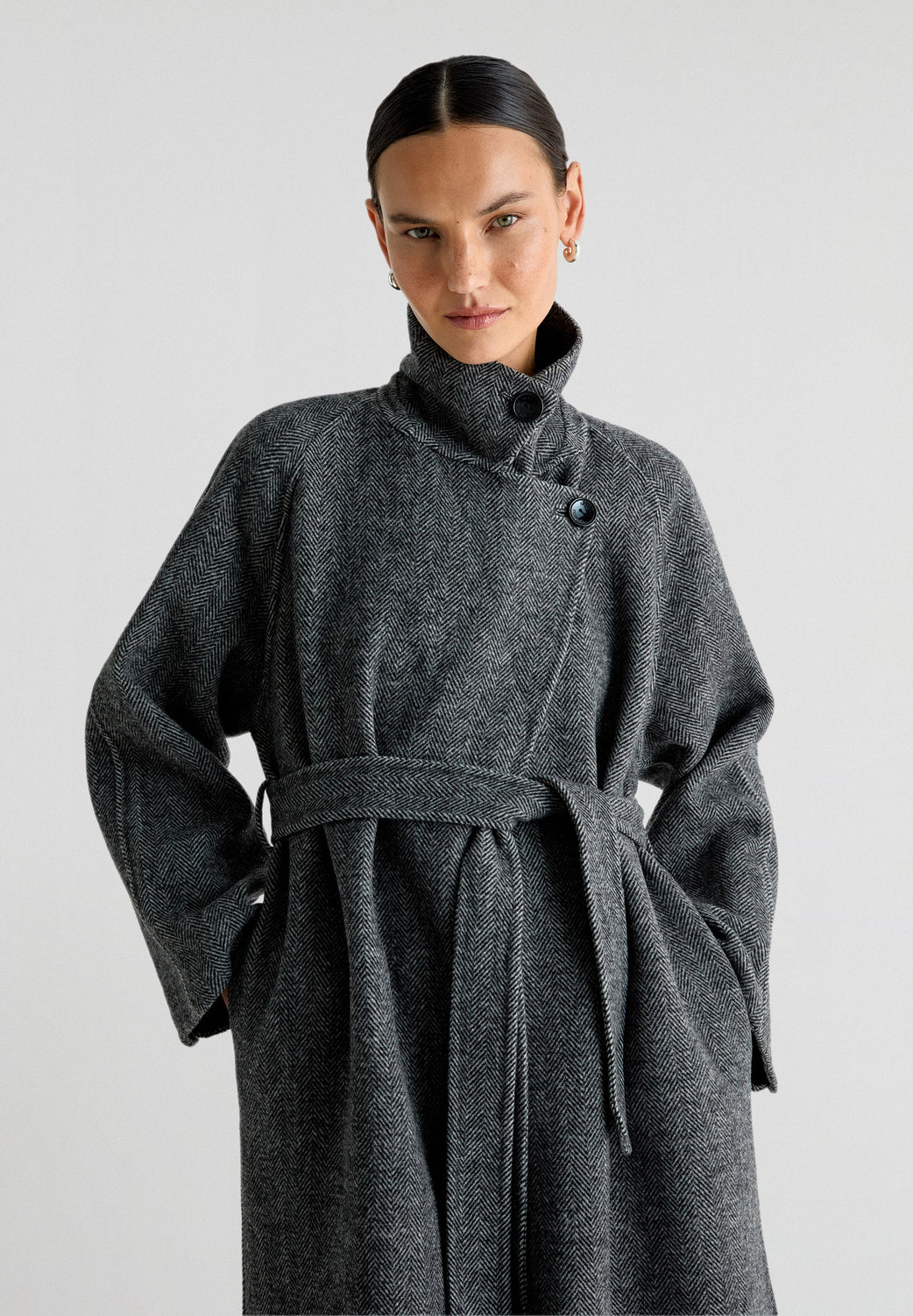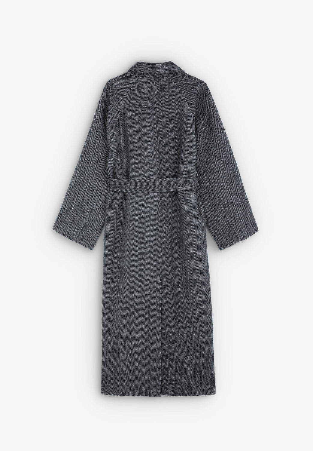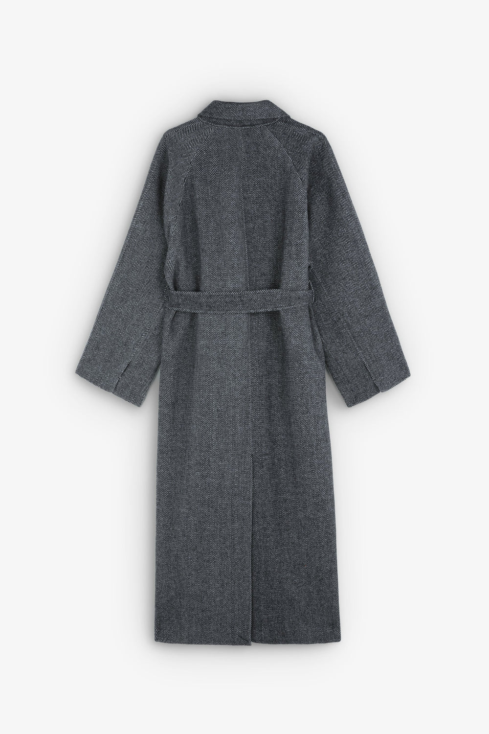 Abrigo largo confeccionado en lana haciendo espiga. Regular fit, cierre con lazada y botones en cuello y cuello con solapas de muesca. Manga larga y bolsillos. Abertura trasera.