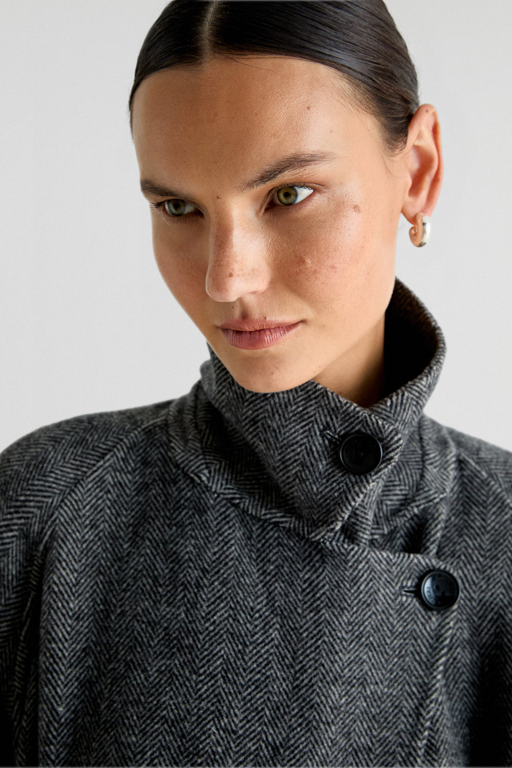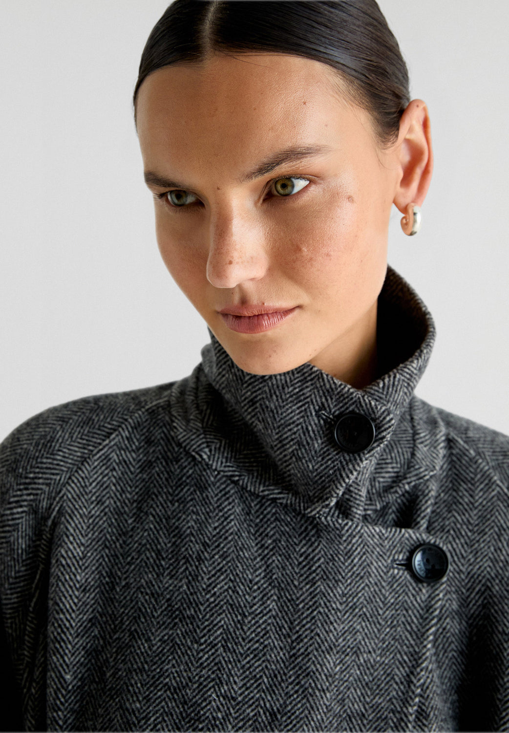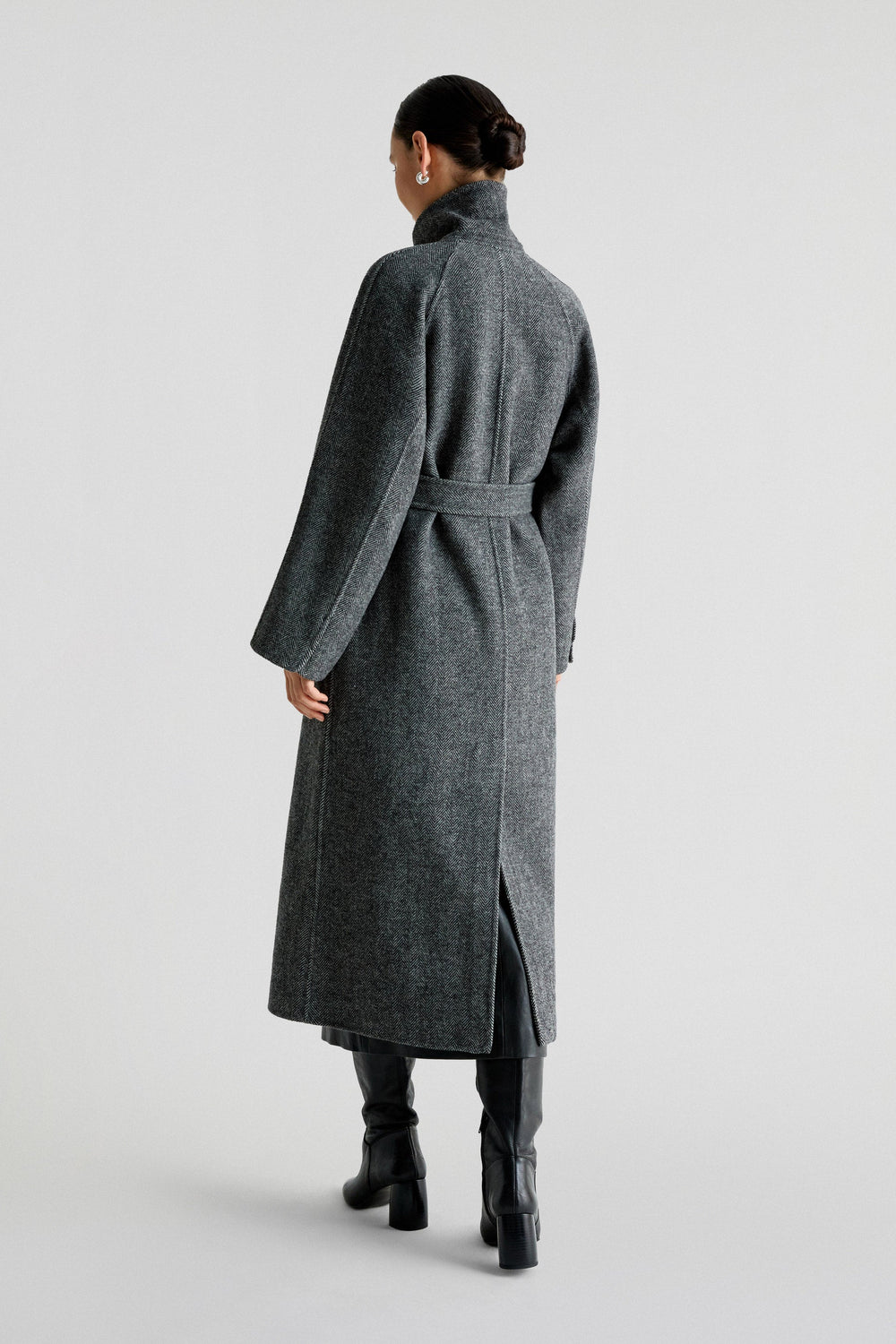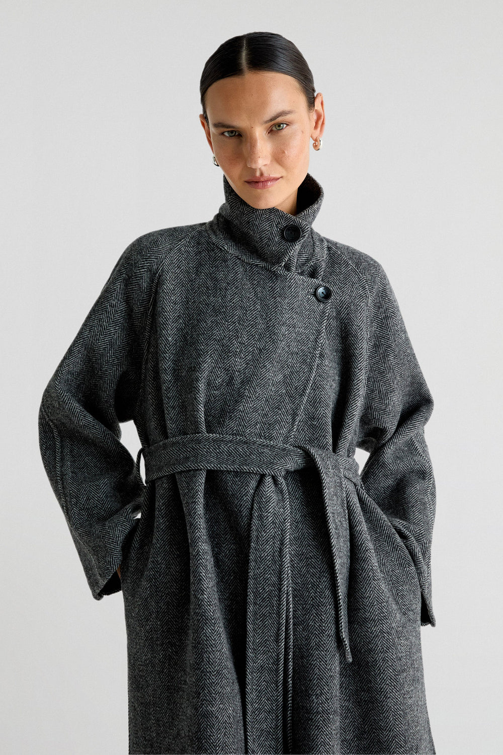 Abrigo largo confeccionado en lana haciendo espiga. Regular fit, cierre con lazada y botones en cuello y cuello con solapas de muesca. Manga larga y bolsillos. Abertura trasera.