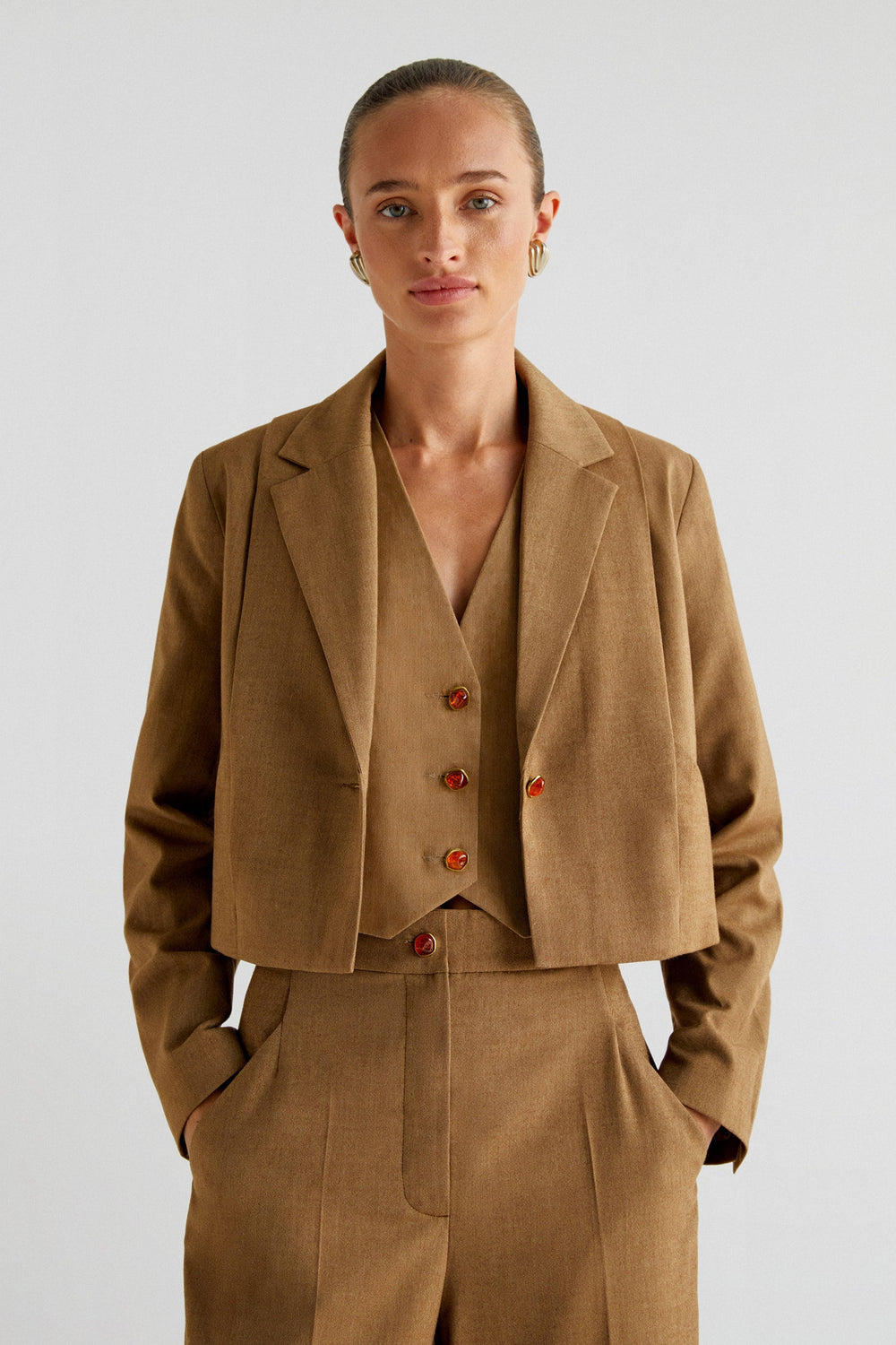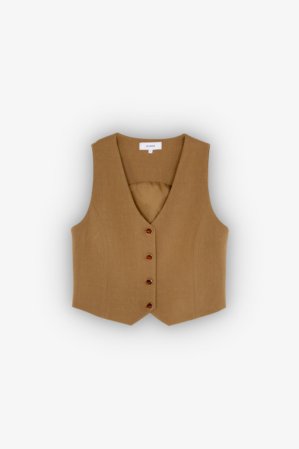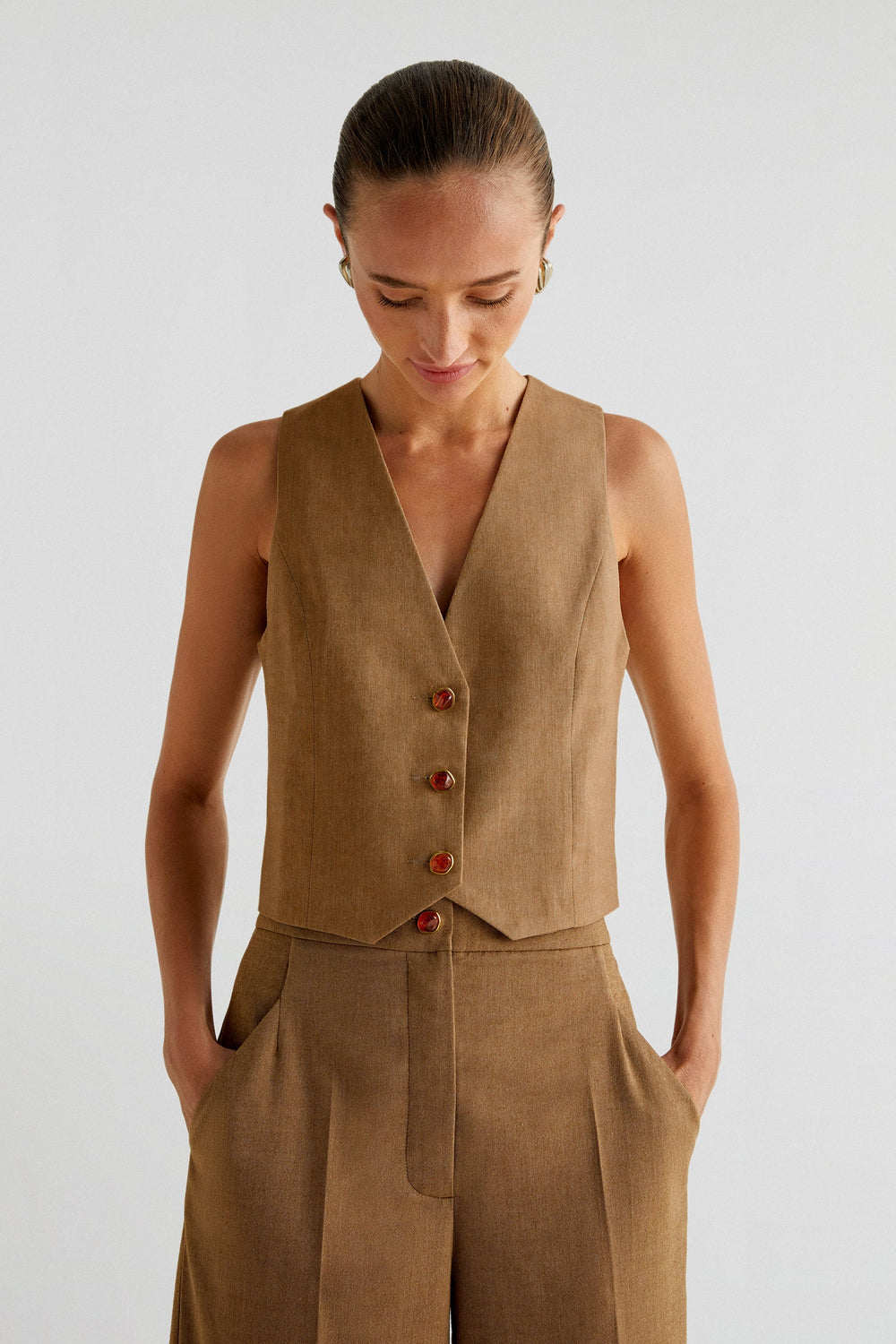 Chaleco de corte cropped. Slim fit, escote de pico y cierre con botones. Manga en sisa.