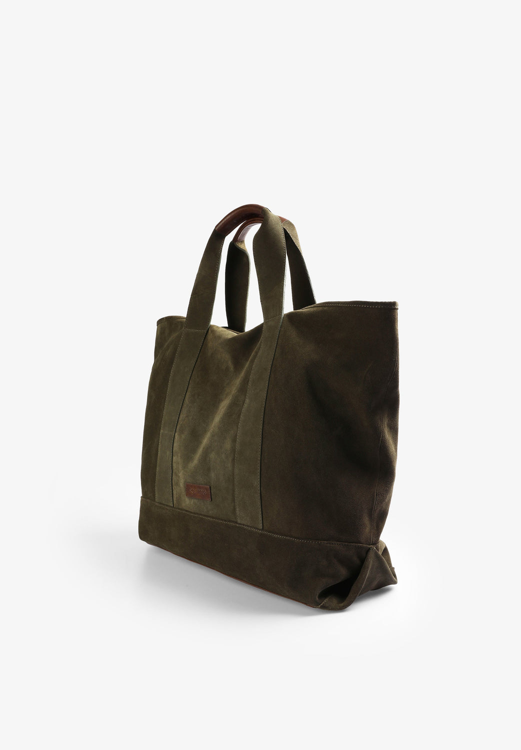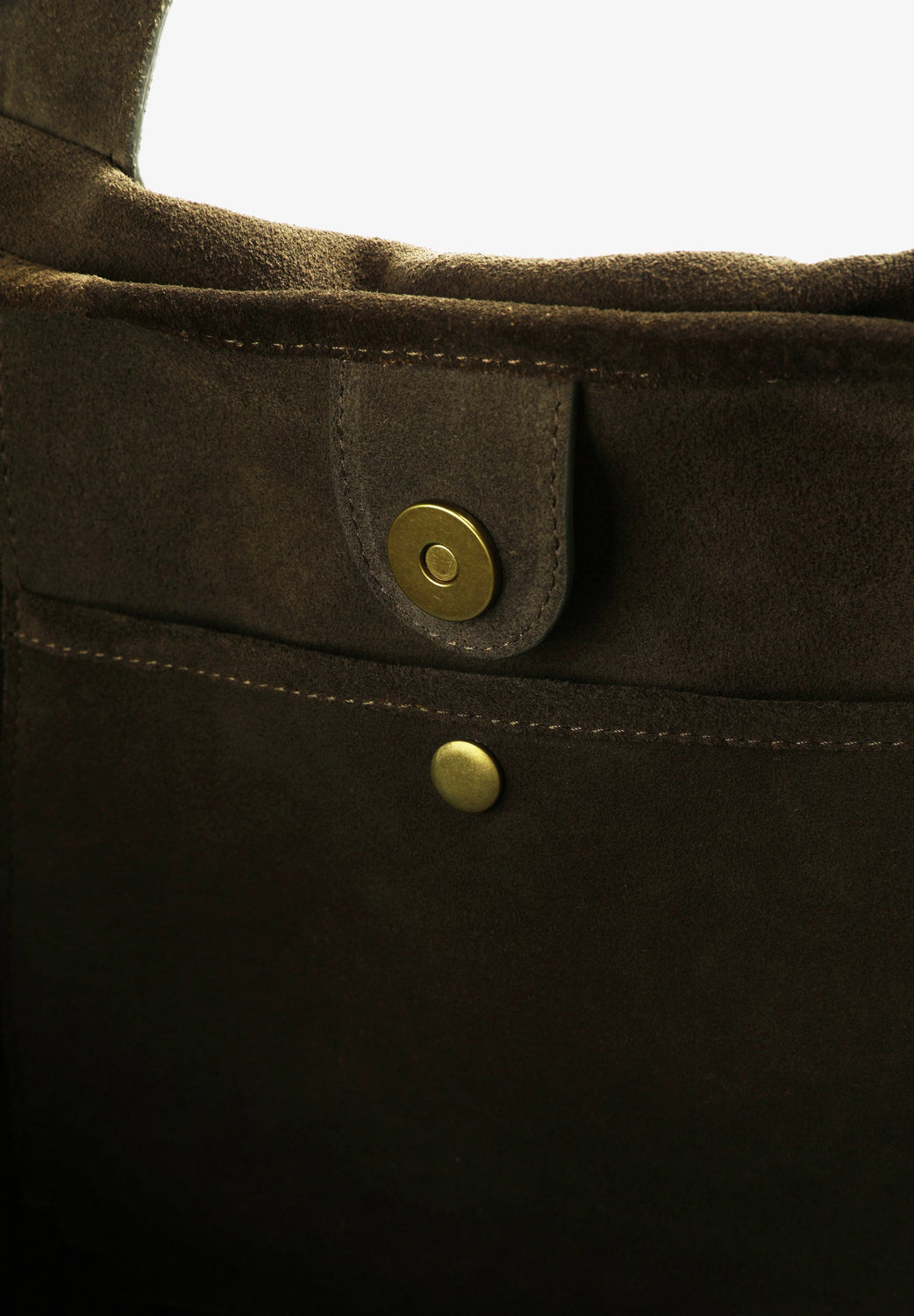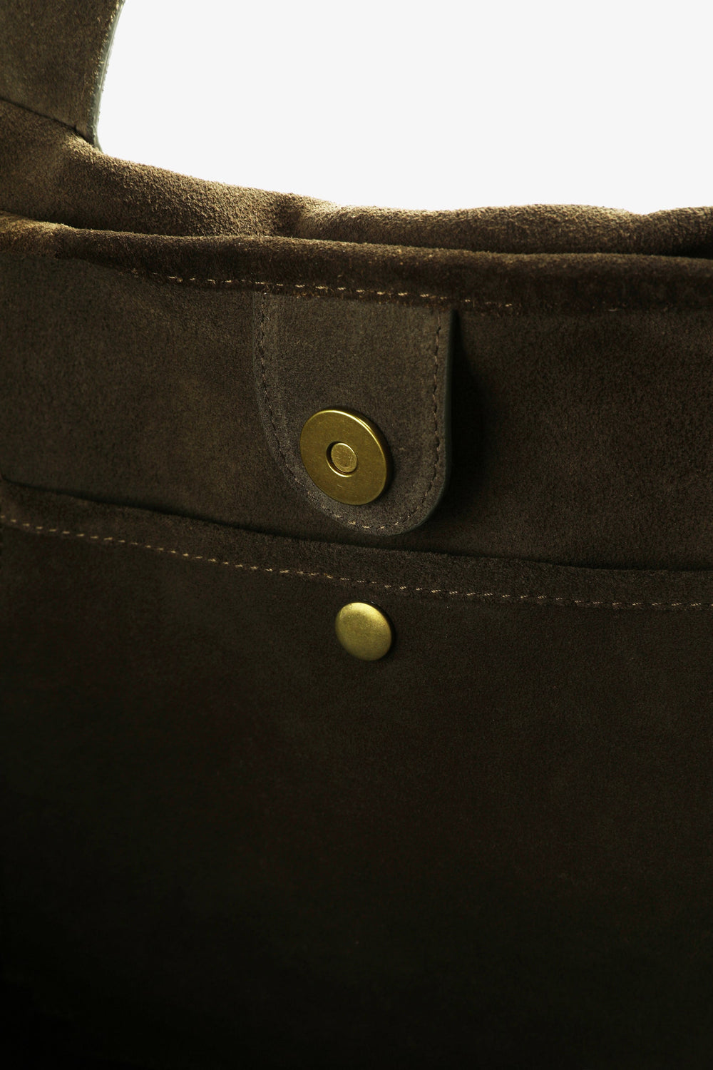 Bolso confeccionado en piel terminado en ante. Cierre con snaps, asas cortas y bolsillo interior. Detalle de etiqueta de piel.