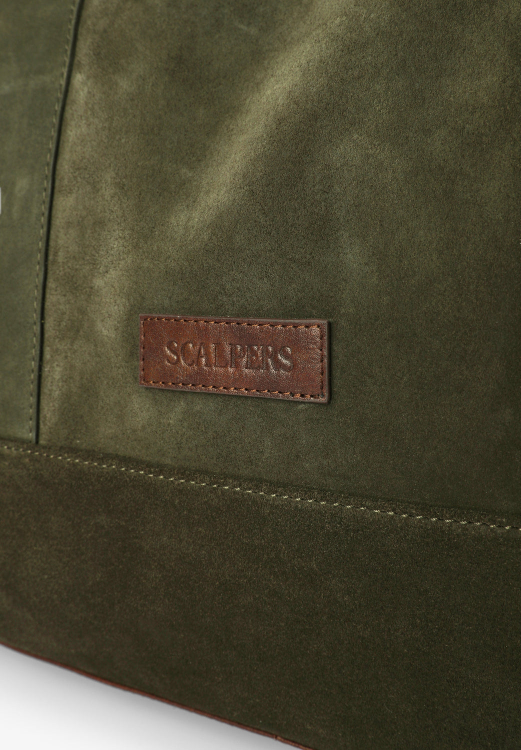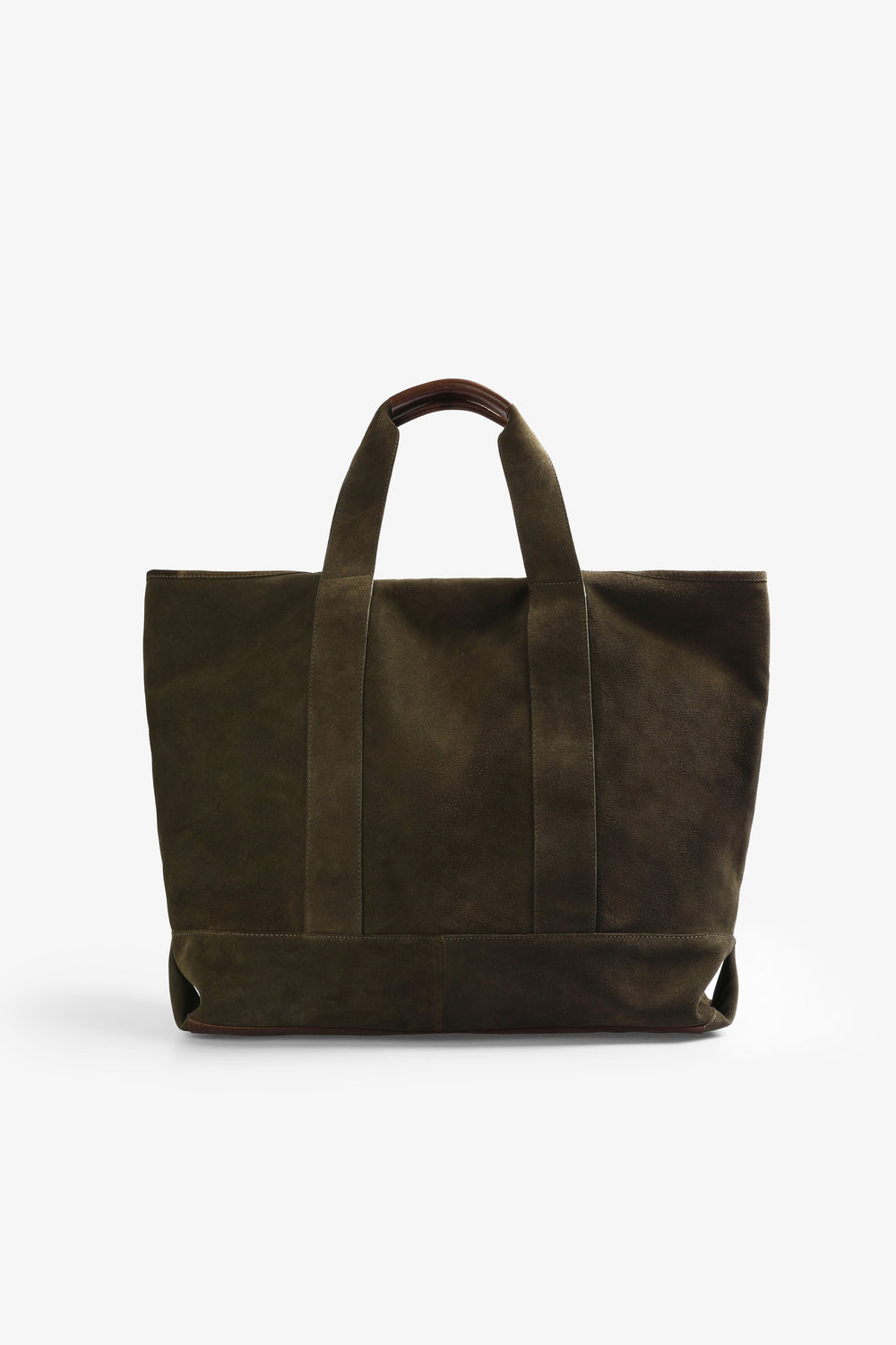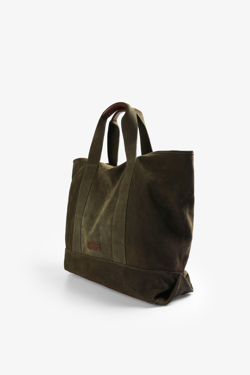 Bolso confeccionado en piel terminado en ante. Cierre con snaps, asas cortas y bolsillo interior. Detalle de etiqueta de piel.