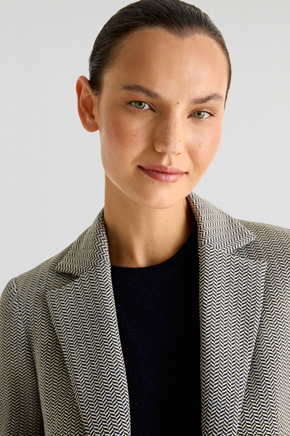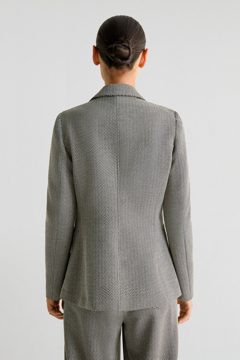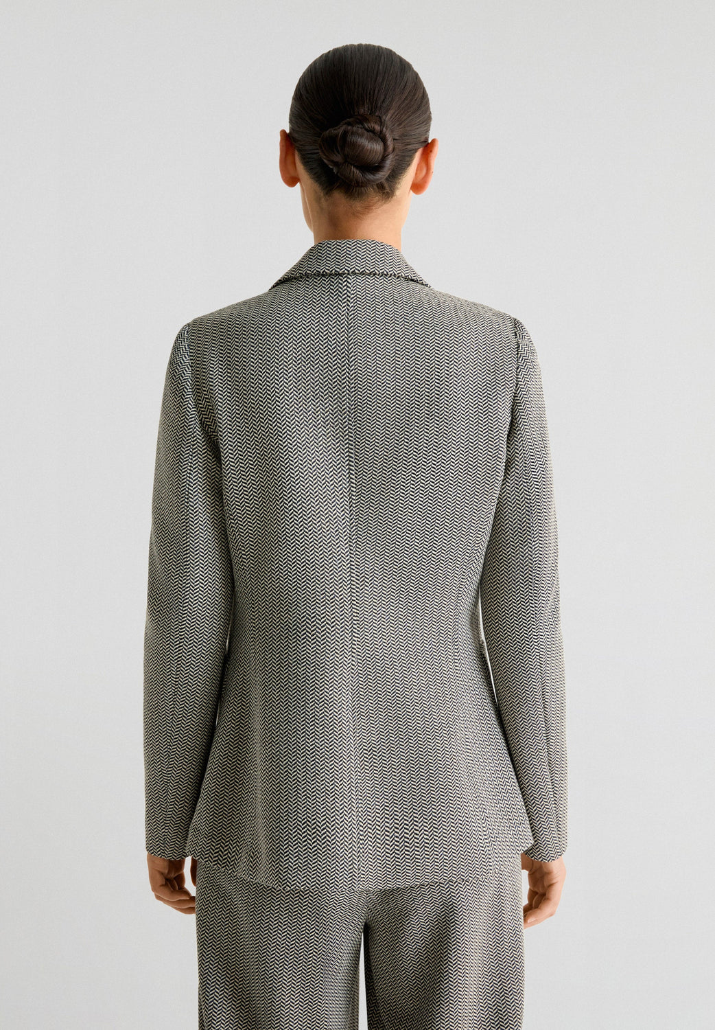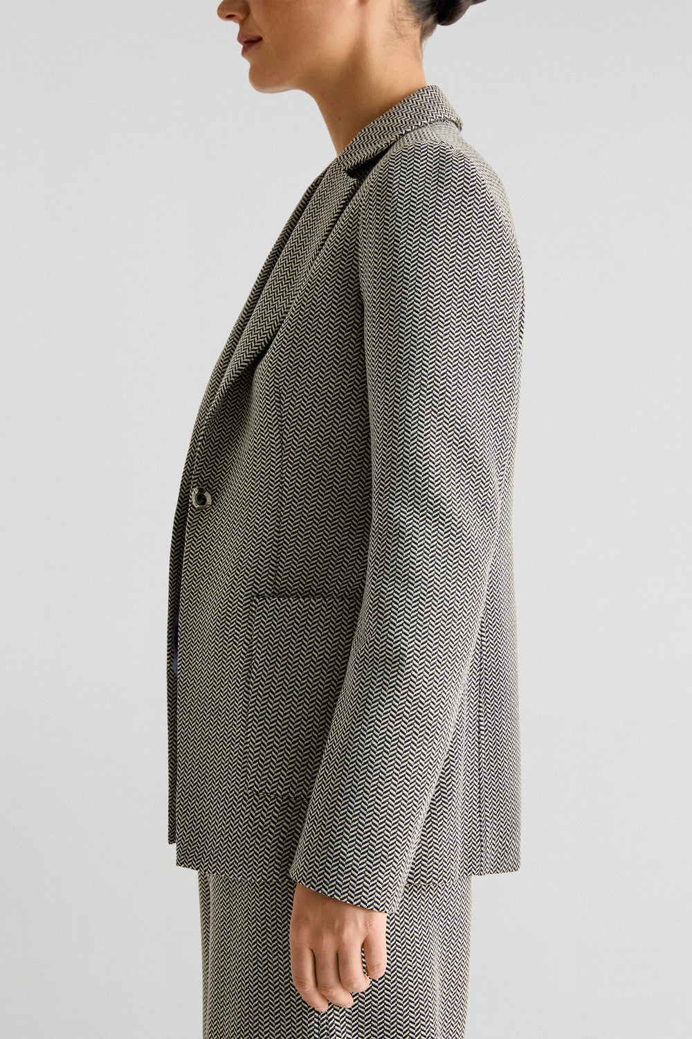Blazer confeccionada en tejido ligeramente elástico haciendo espiga. Regular fit, cierre con botón y cuello con solapas de muesca. Manga larga y bolsillos de parche.