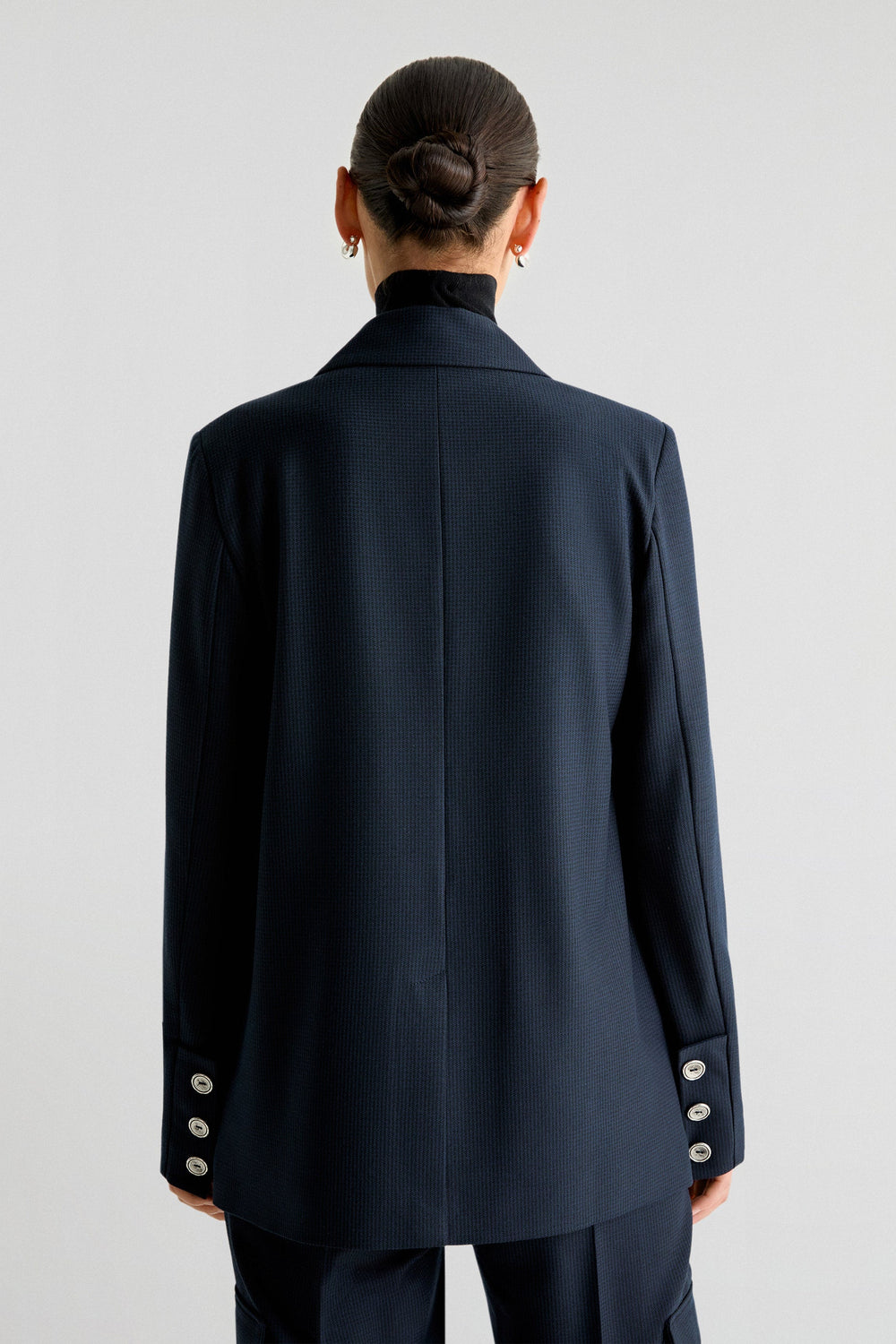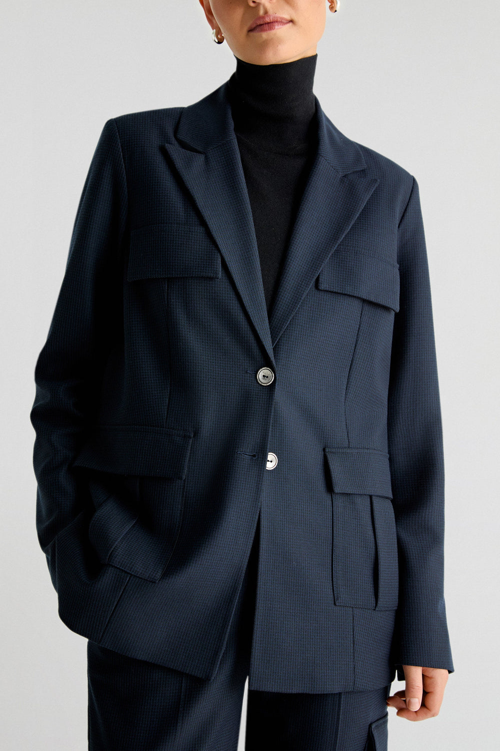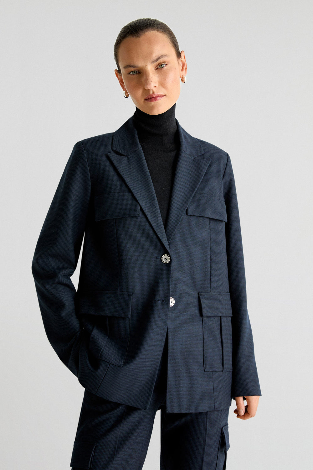 Blazer confeccionada en tejido fluido. Regular fit, cierre con botones y cuello con solapas. Manga larga terminada en botones y bolsillos de parche. Abertura trasera.