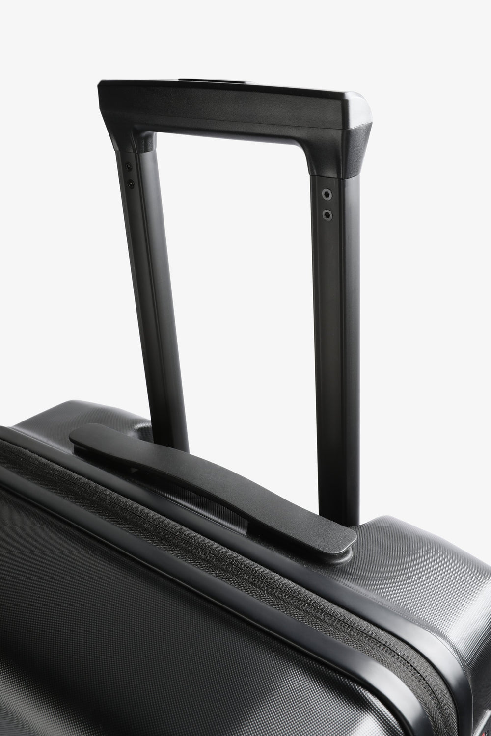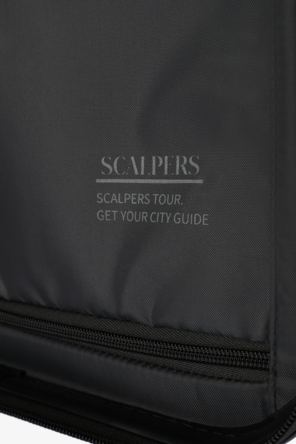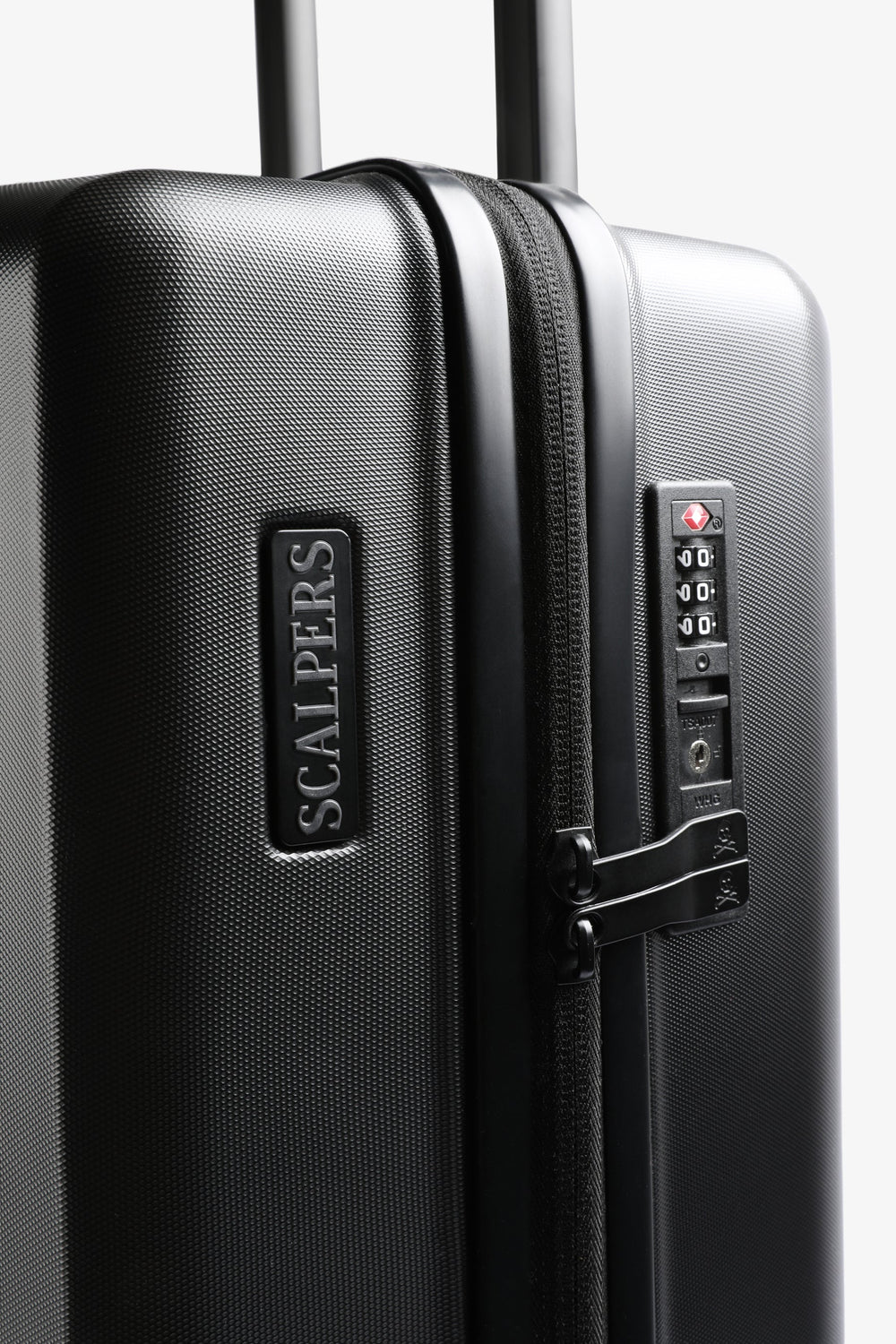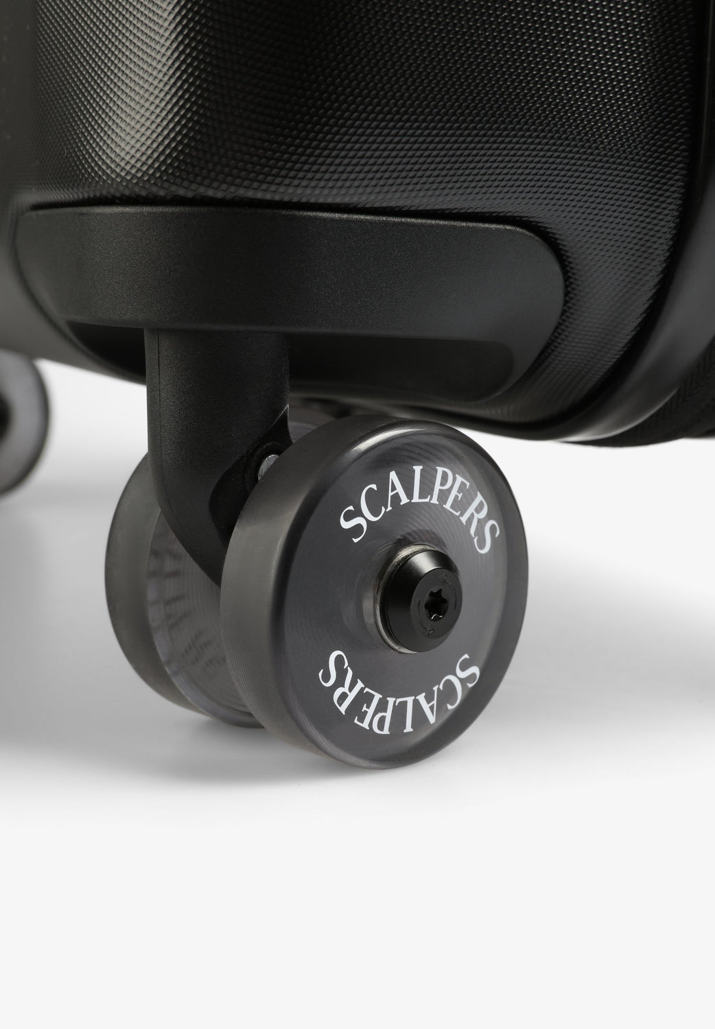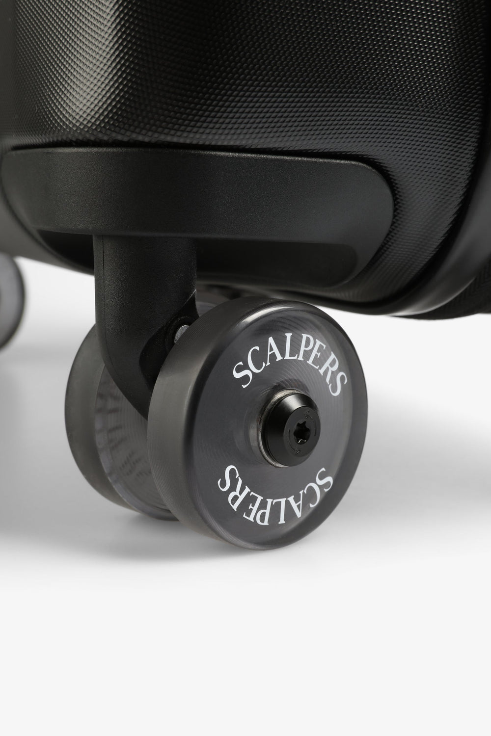 Maleta tipo trolley confeccionada en tejido rígido. Cierre con cremallera y contraseña numérica. Compartimentos interiores con cremallera y ruedas de giro completo. Asa ajustable y asa corta. Detalle de calavera.