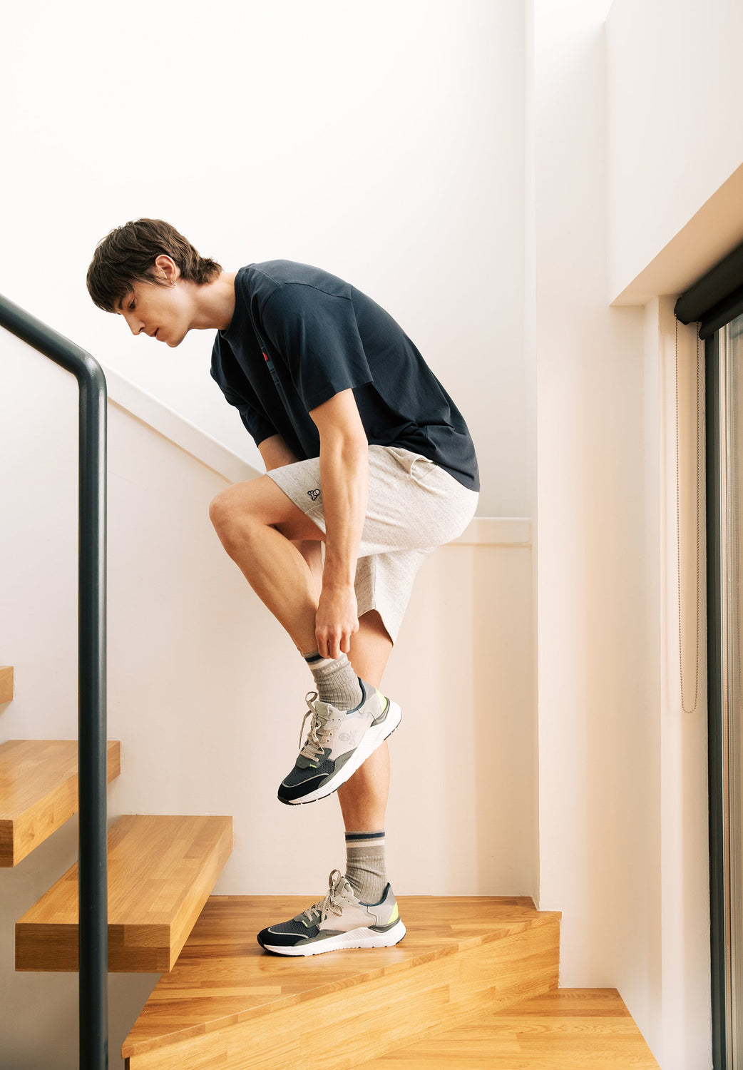 Sneakers confeccionadas en tejido mezcla de piel y nailon. Cierre con cordones, malla delantera y puntera a contraste. Suela gruesa de goma dentada. Detalle de calavera lateral y línea flúor trasera.