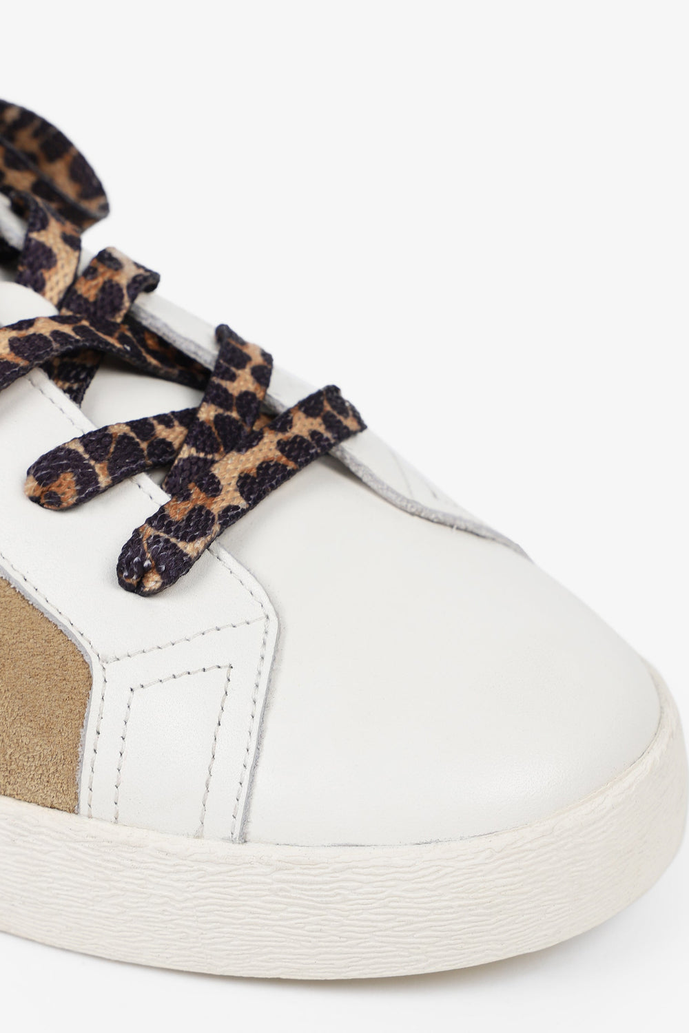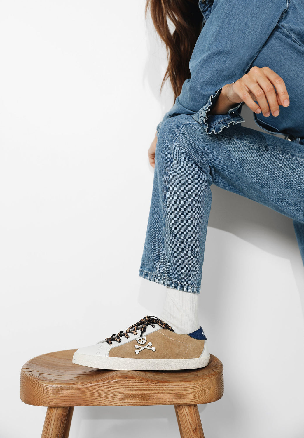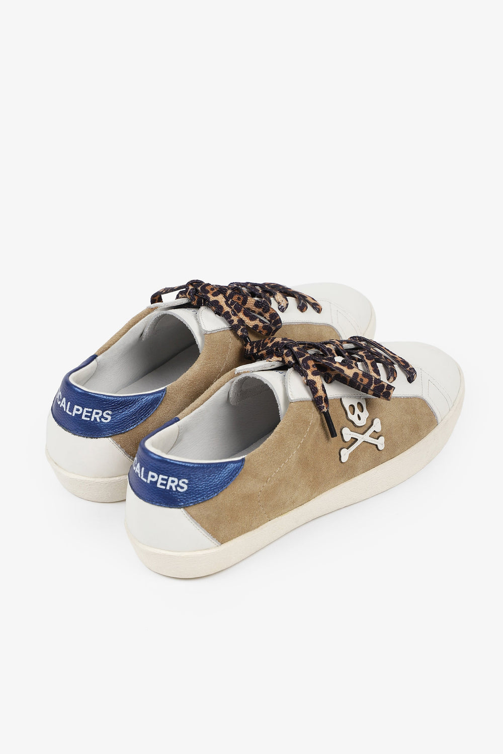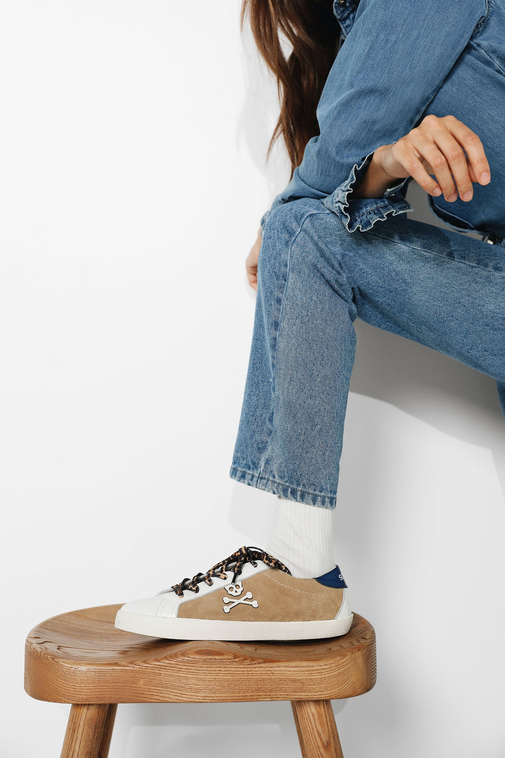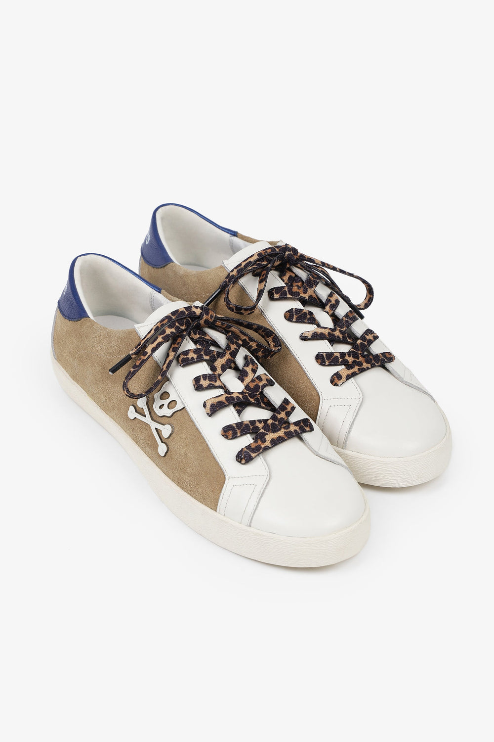 Sneakers bajas confeccionadas en piel terminada en serraje. Cierre con cordones de animal print, suela de goma y detalle de prints y calavera lateral.