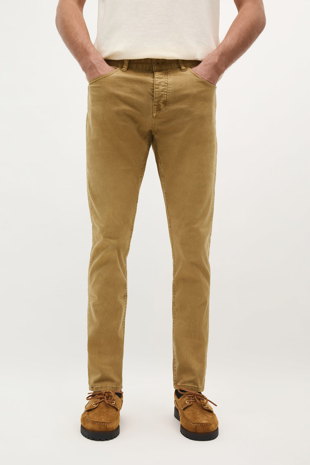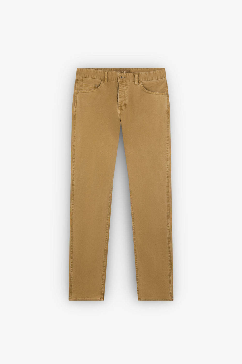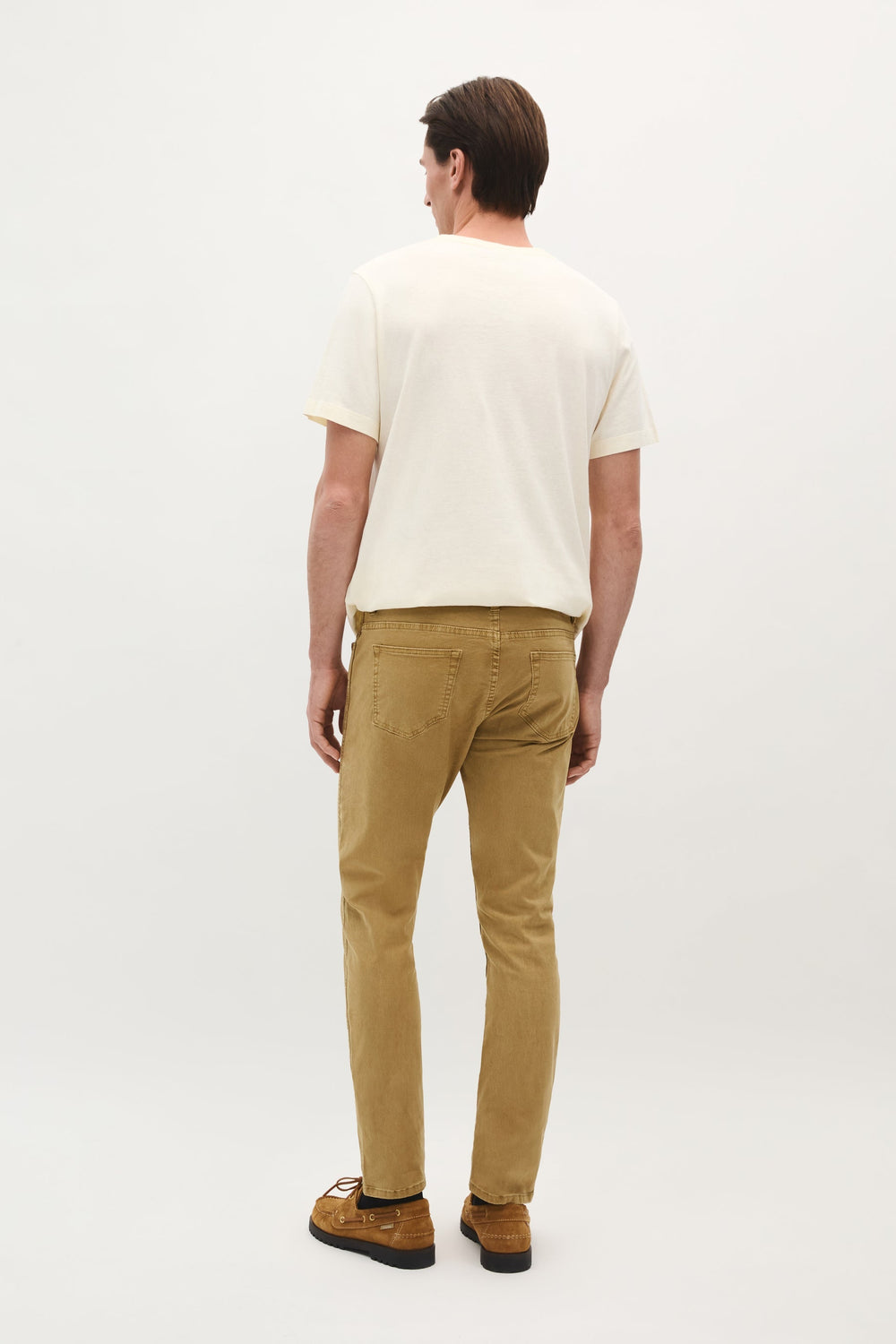 Pantalón confeccionado en mezcla de algodón ligeramente elástico. Regular fit, cierre con botón y cremallera y bolsillos traseros y laterales. Trabillas en cintura.
