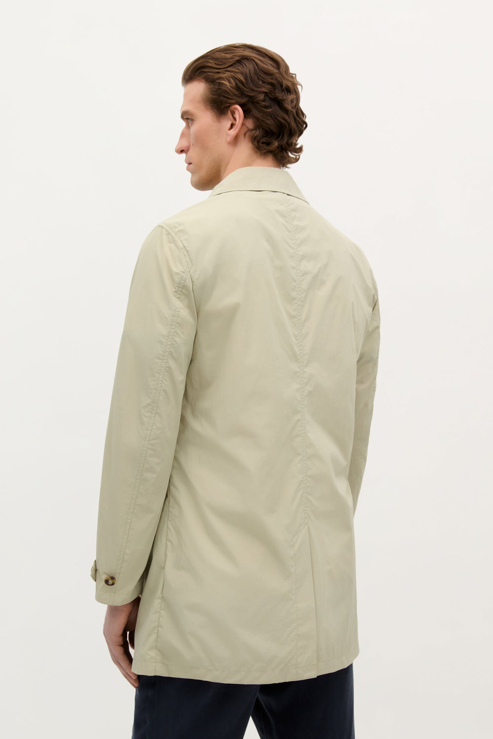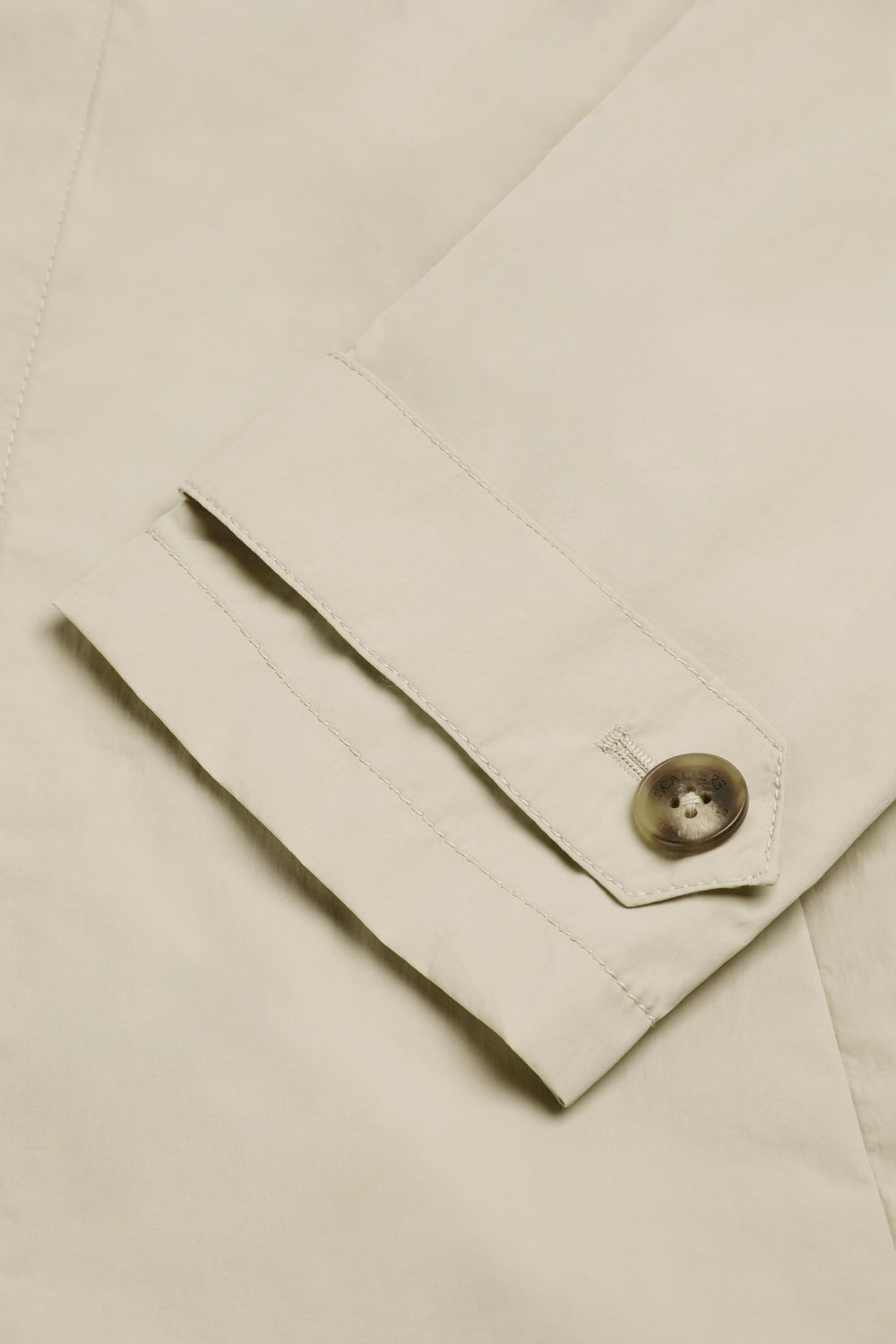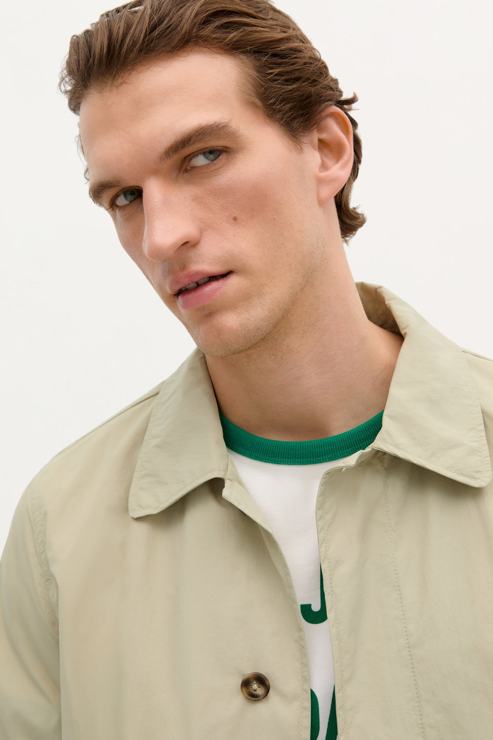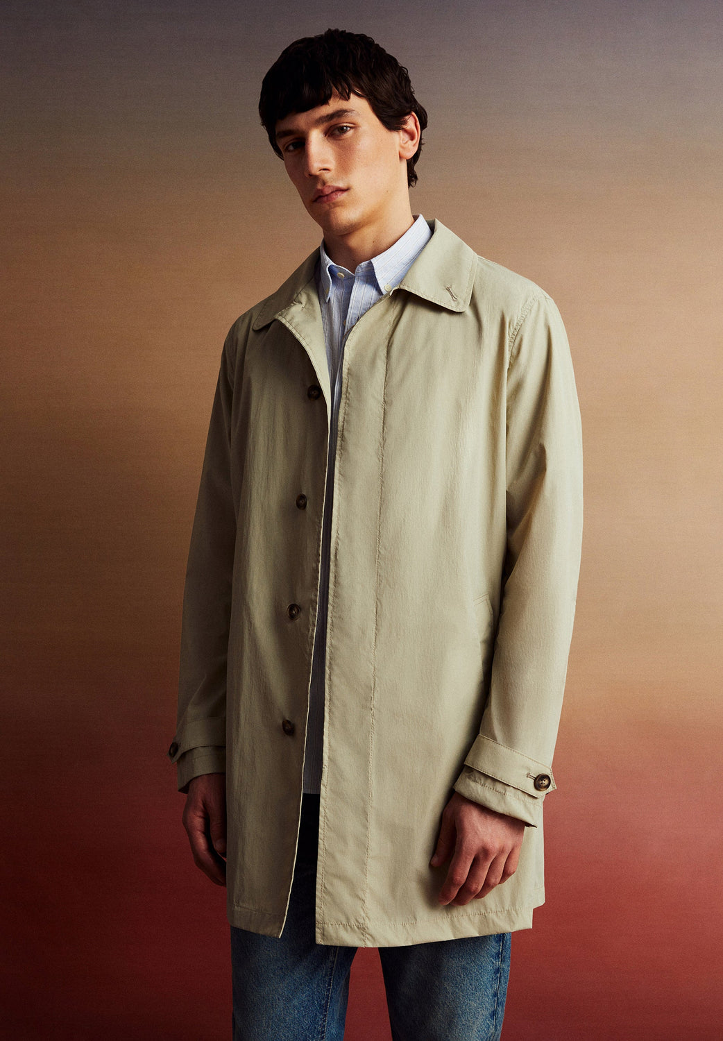 Gabardina ligera. Confeccionada en tejido técnico impermeable, corte Regular Fit, cuello camisero, bolsillos ocultos y terminación con ceñidor de botón en el puño.
