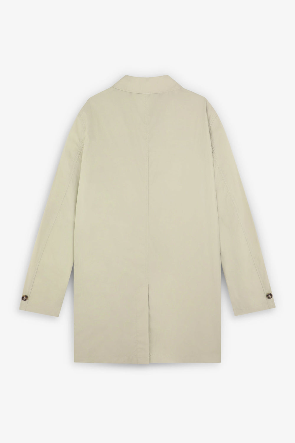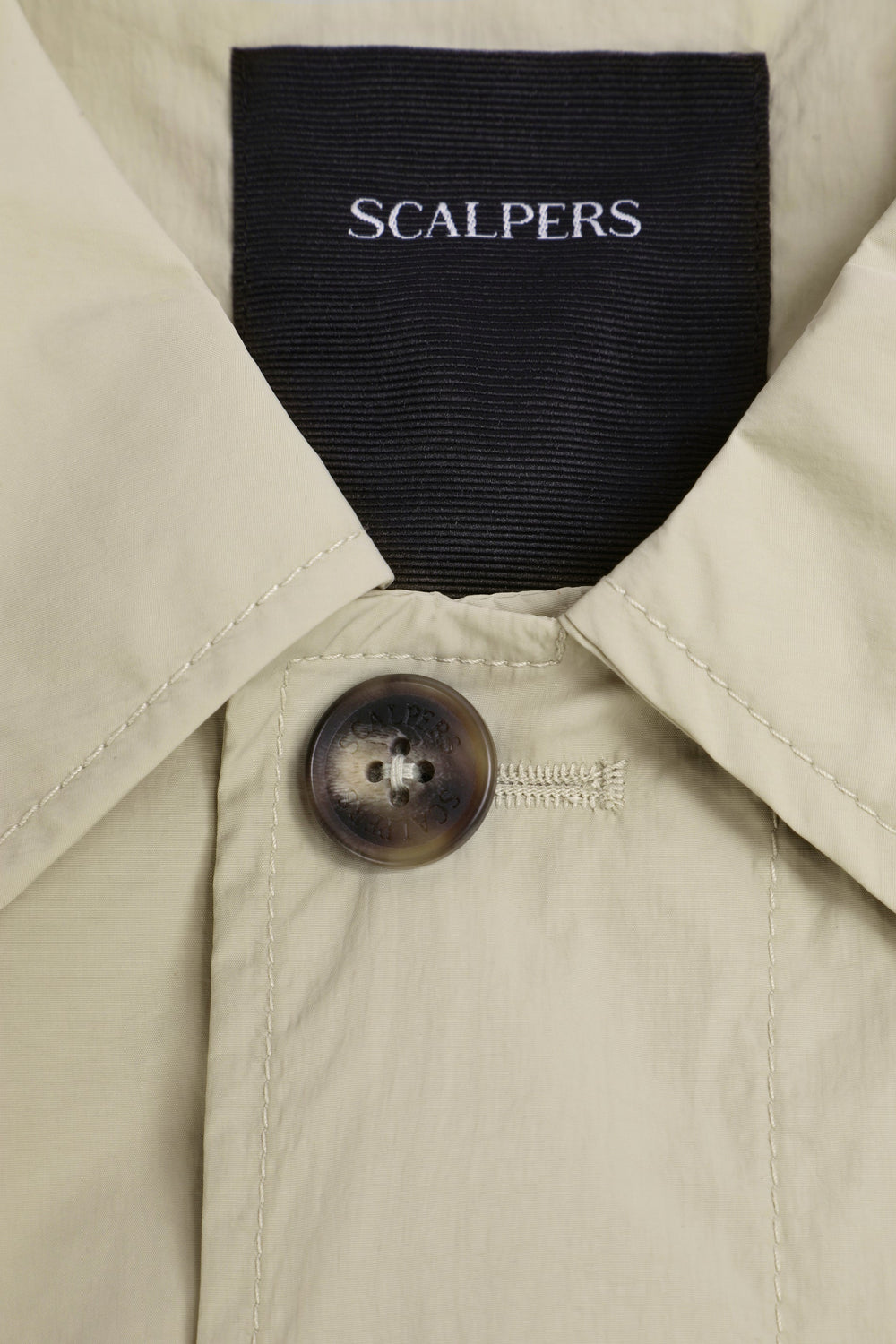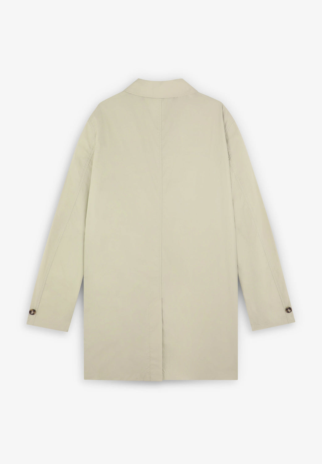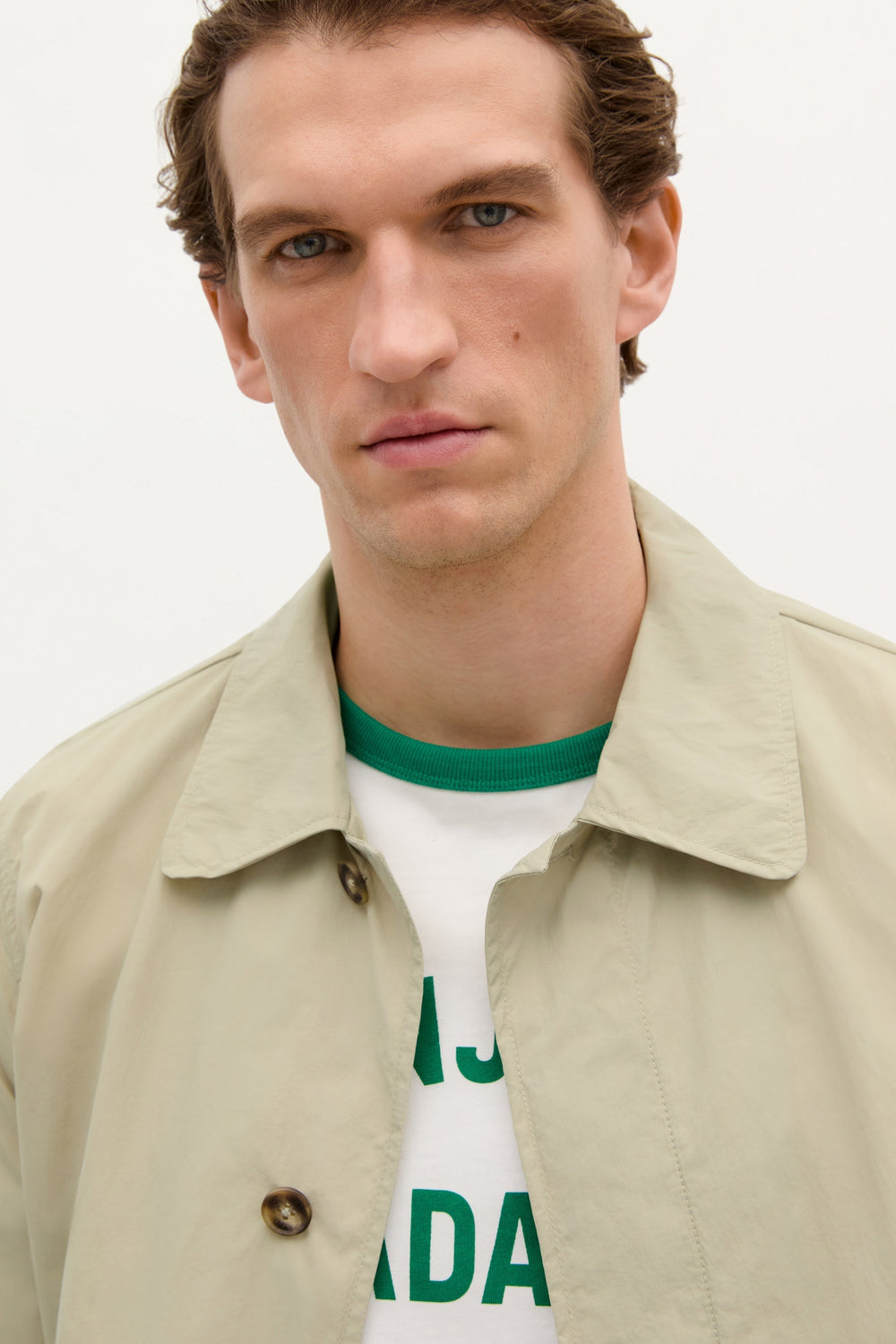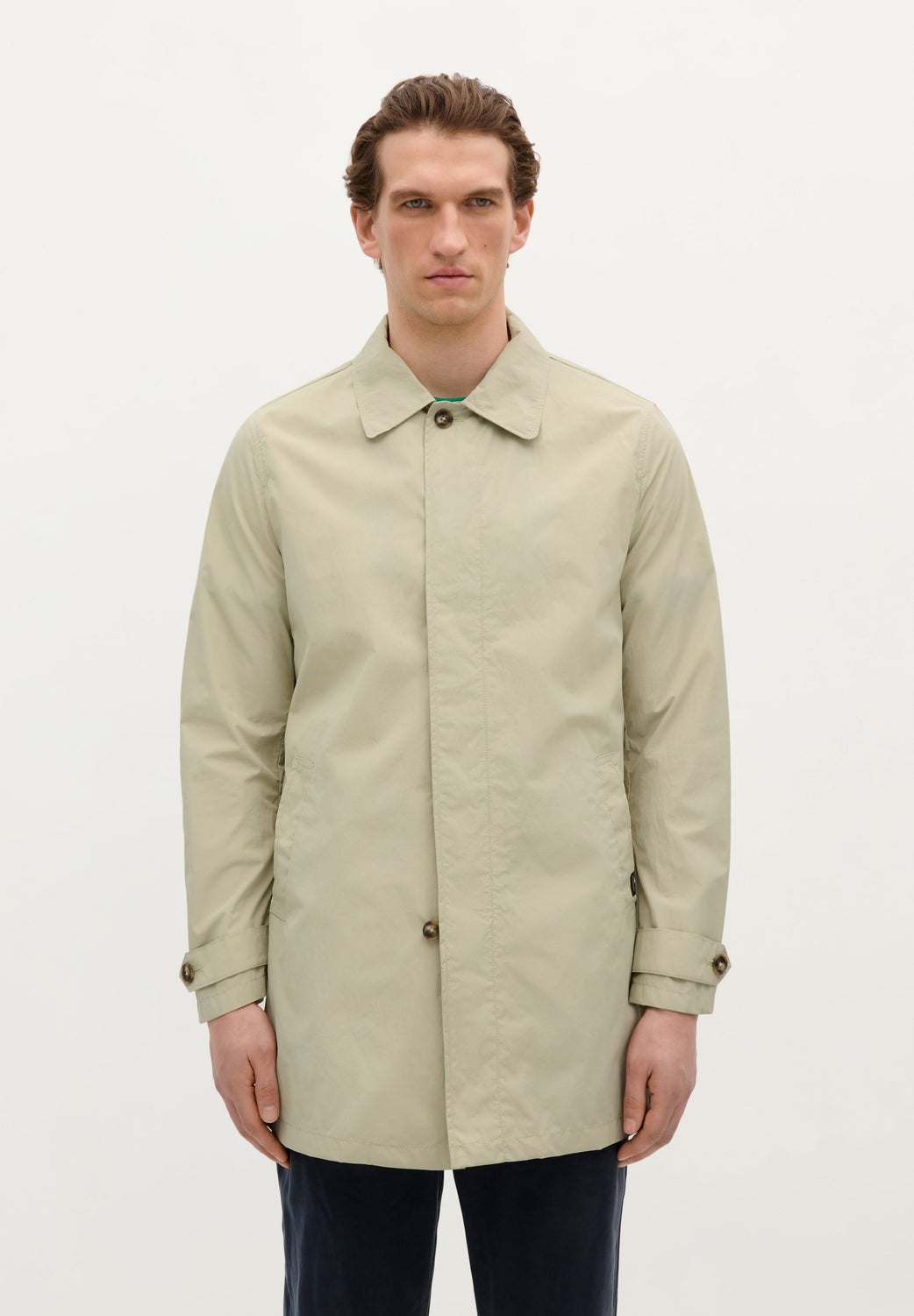 Gabardina ligera. Confeccionada en tejido técnico impermeable, corte Regular Fit, cuello camisero, bolsillos ocultos y terminación con ceñidor de botón en el puño.