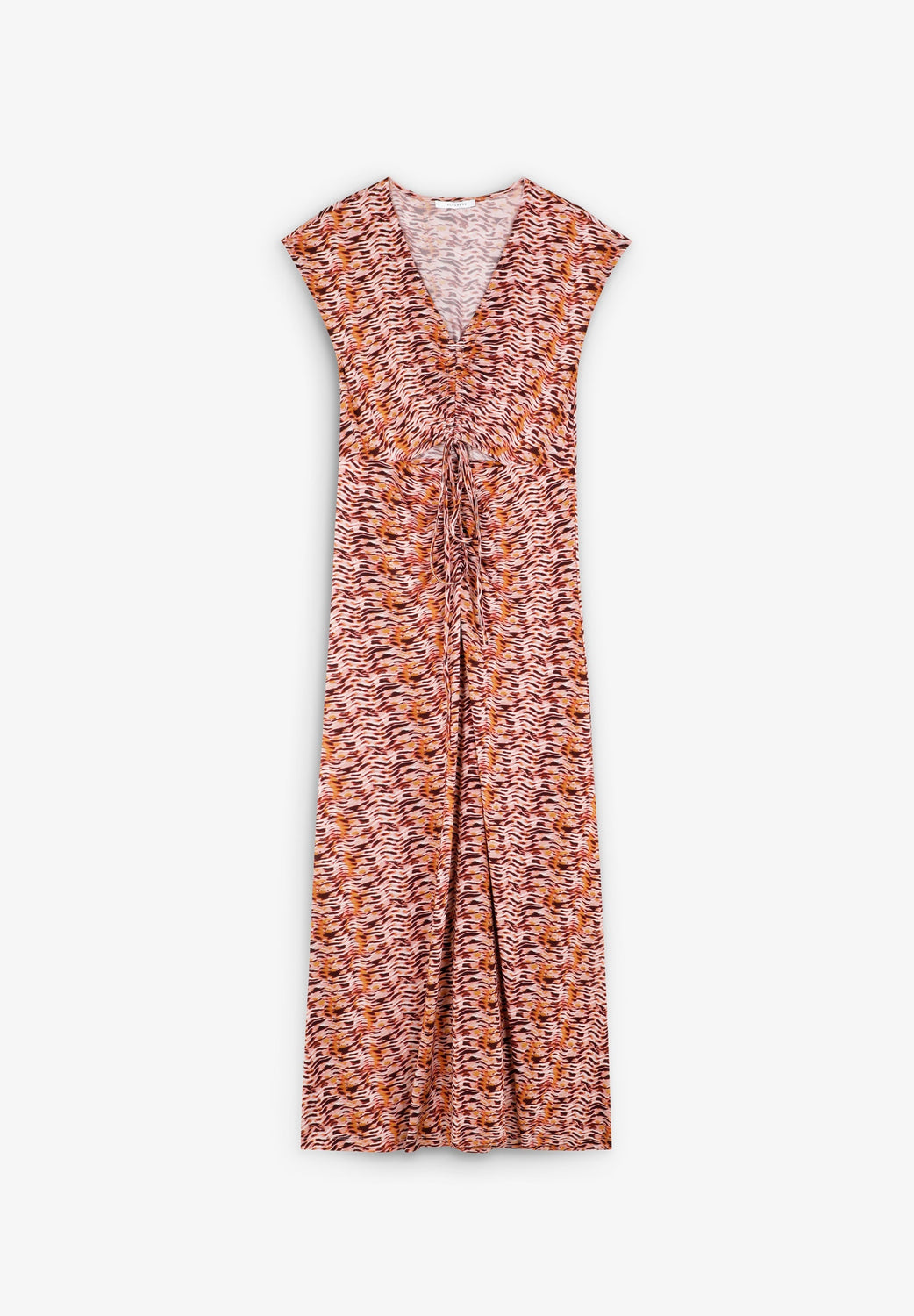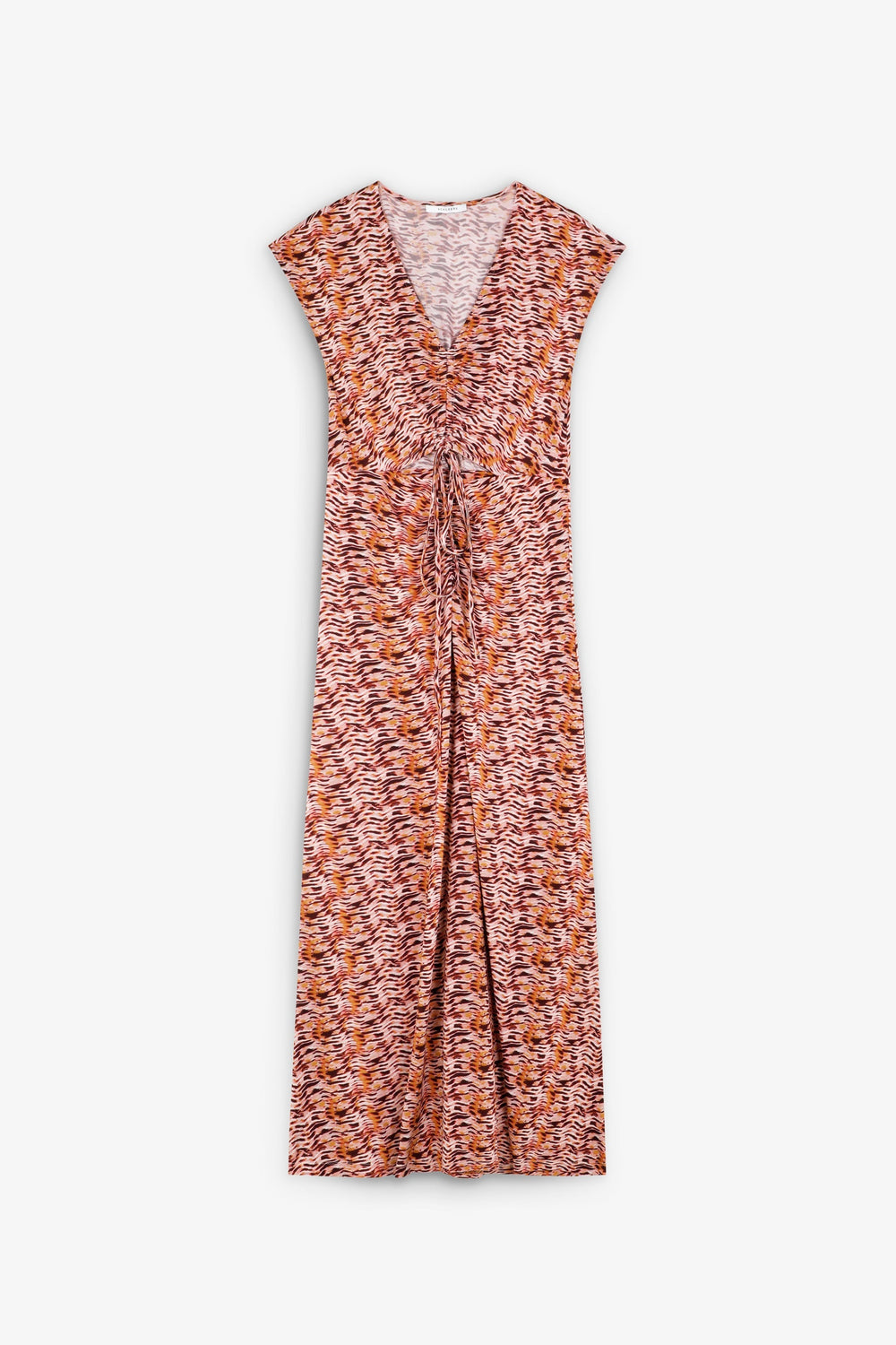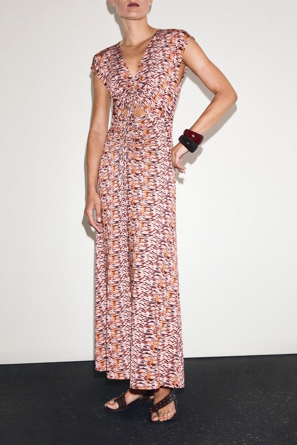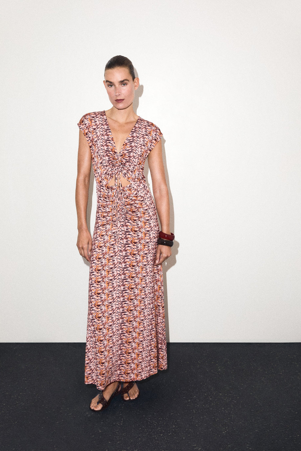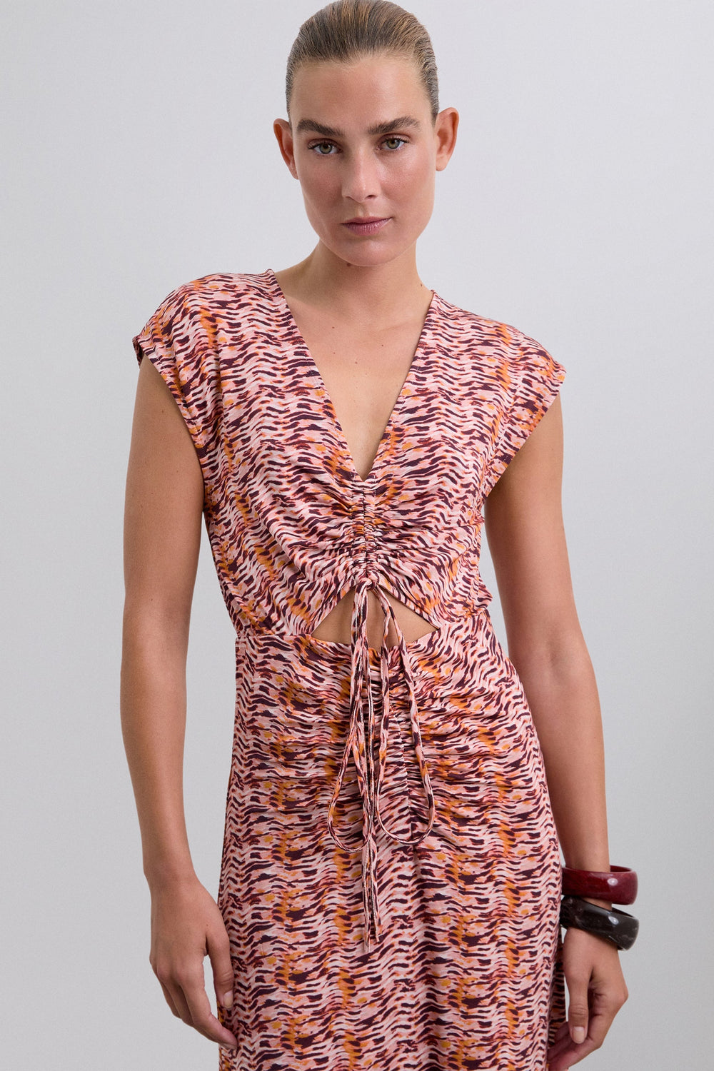 Vestido confeccionado en viscosa ligeramente elástico con estampado. Corte slim fit, escote en V y manga corta. Detalle de cut out frontal con lazada ajustable en pecho.