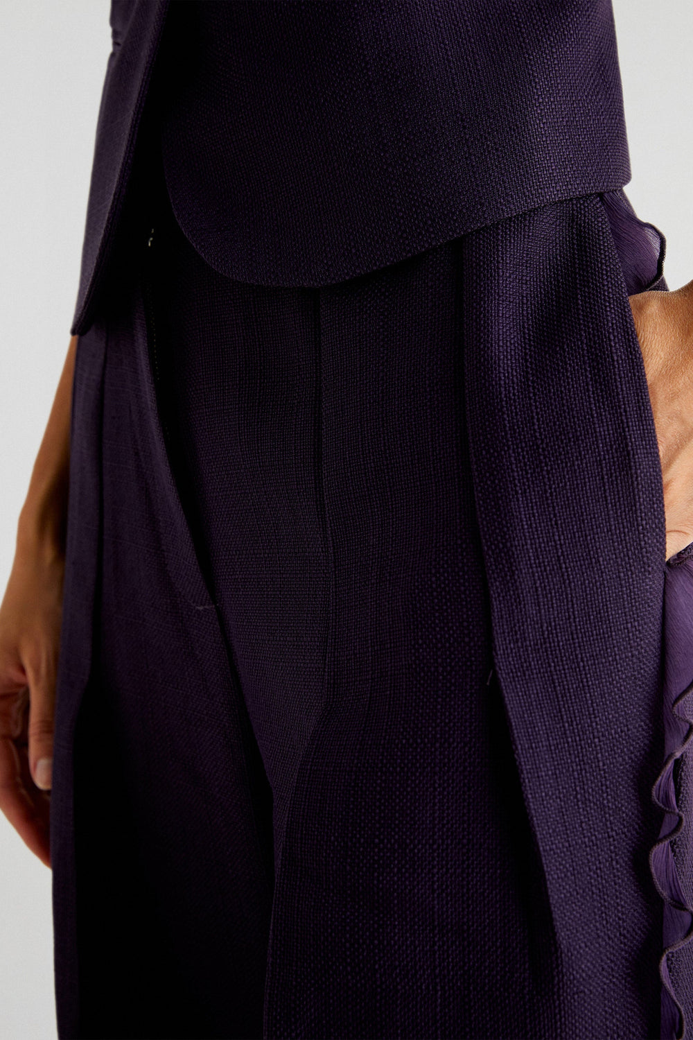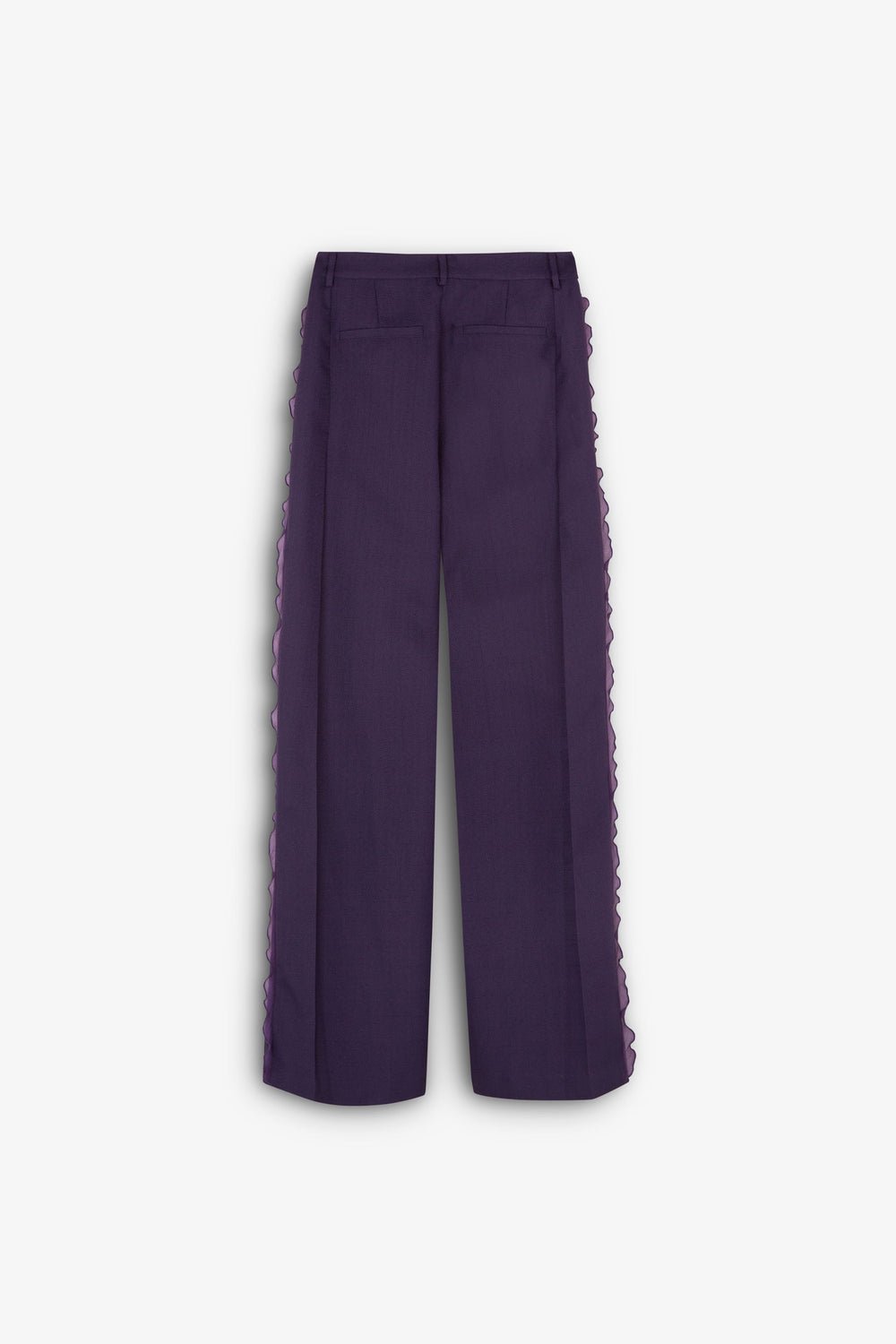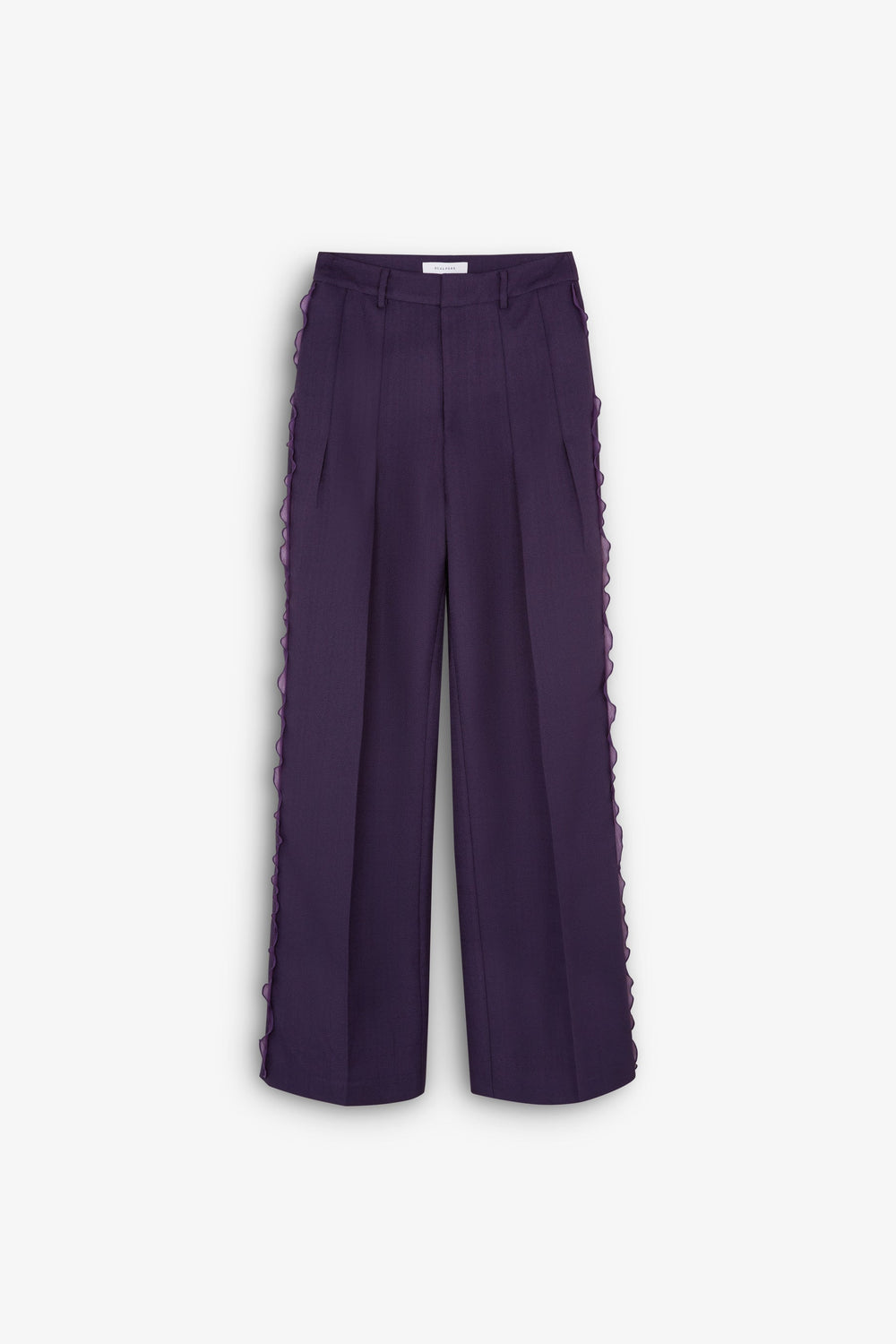 Pantalón con detalle de organza. Full length con tiro alto y pinzas, cierre con cremallera y botón. Bolsillos y trabillas en cintura.