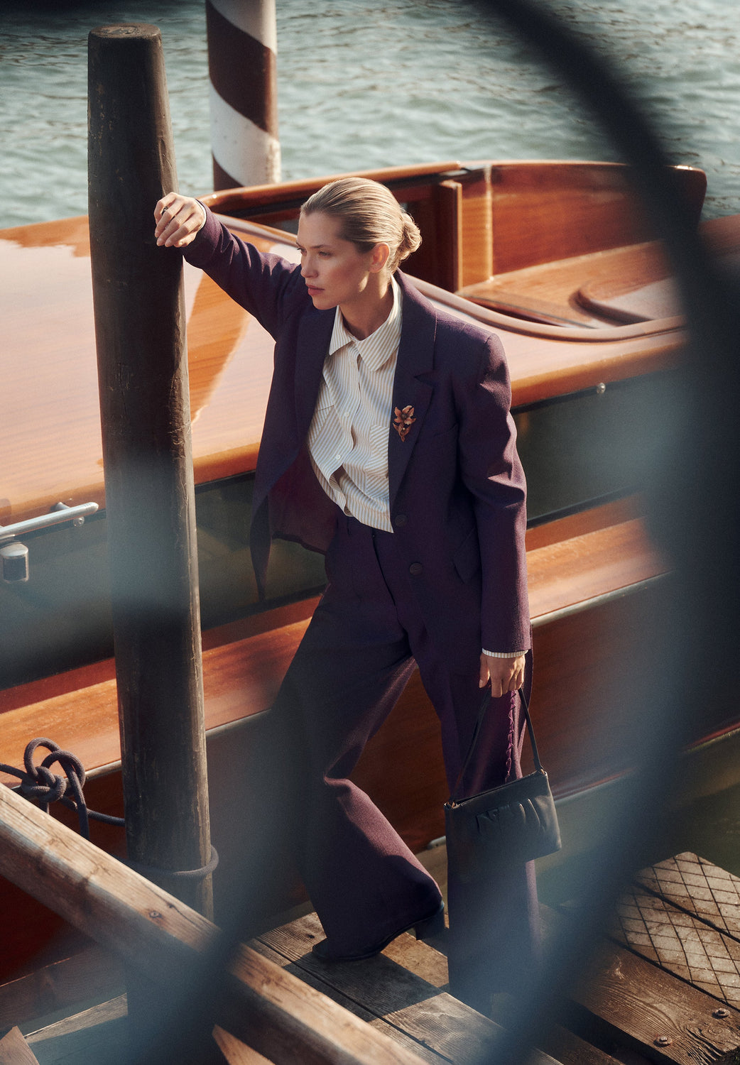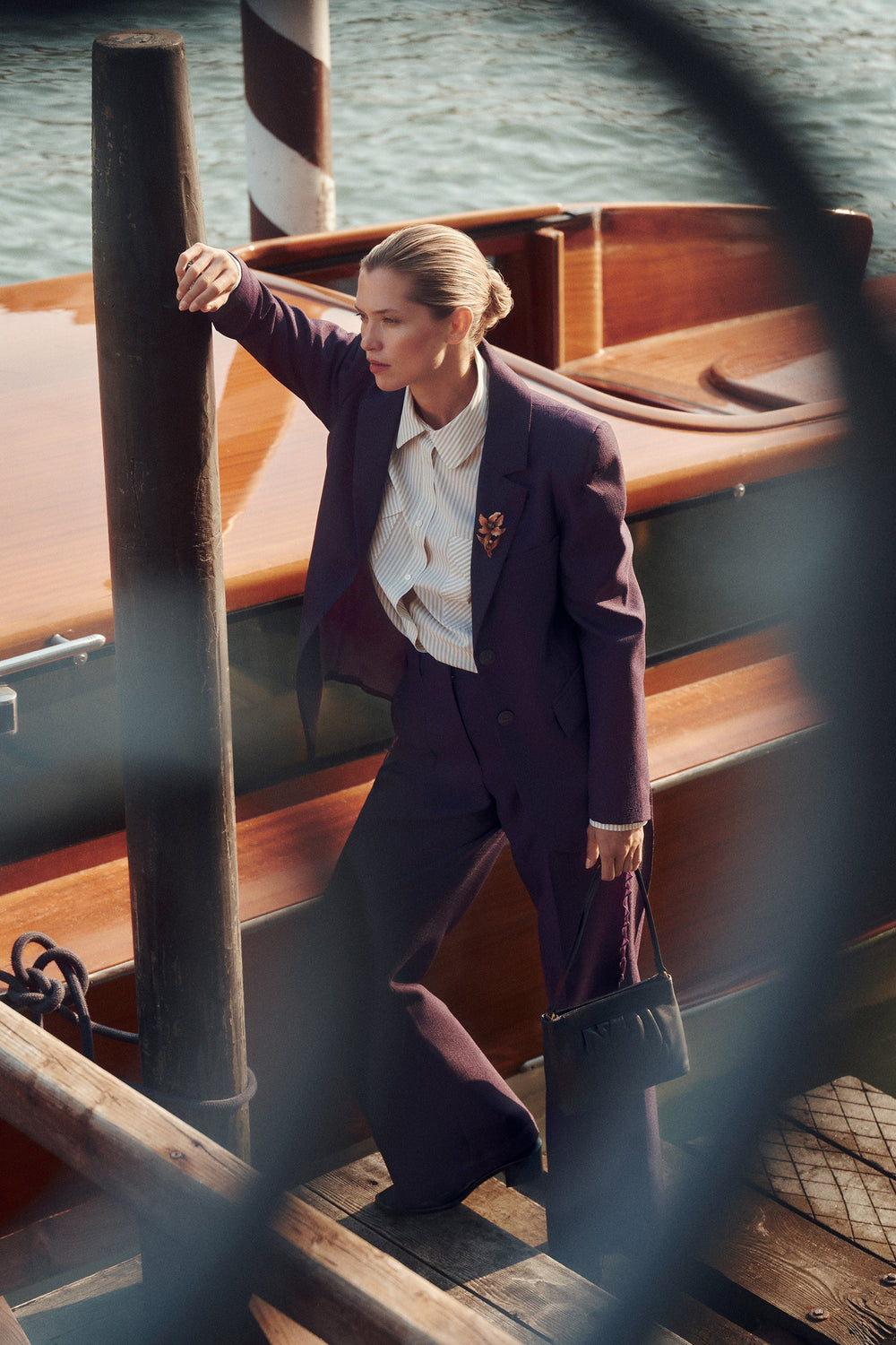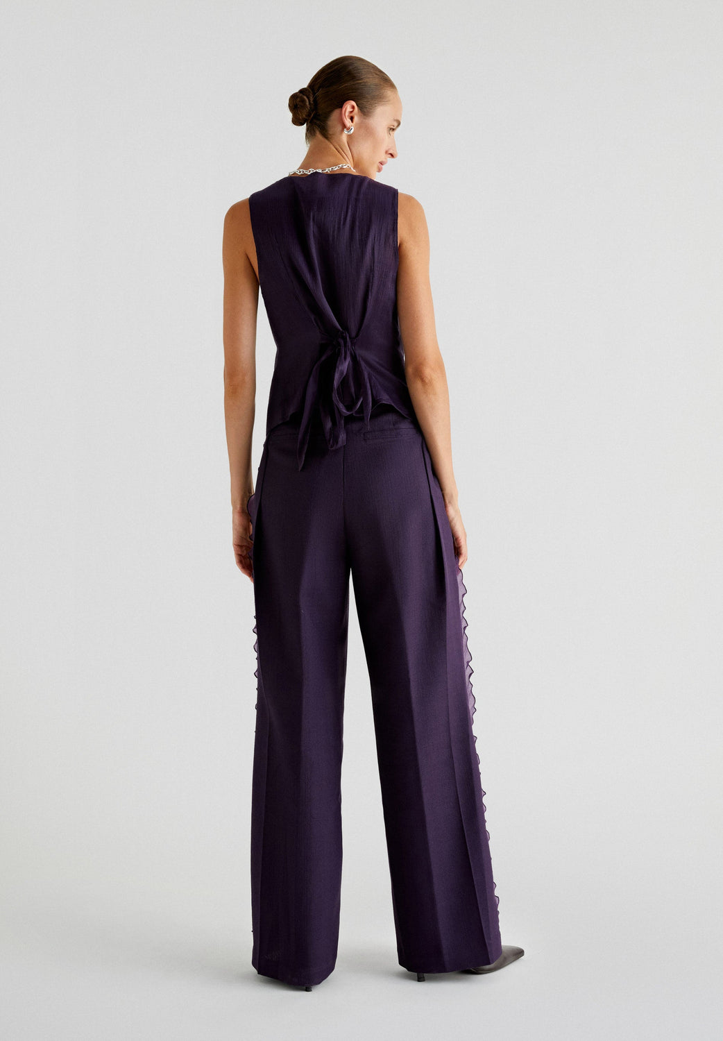 Pantalón con detalle de organza. Full length con tiro alto y pinzas, cierre con cremallera y botón. Bolsillos y trabillas en cintura.