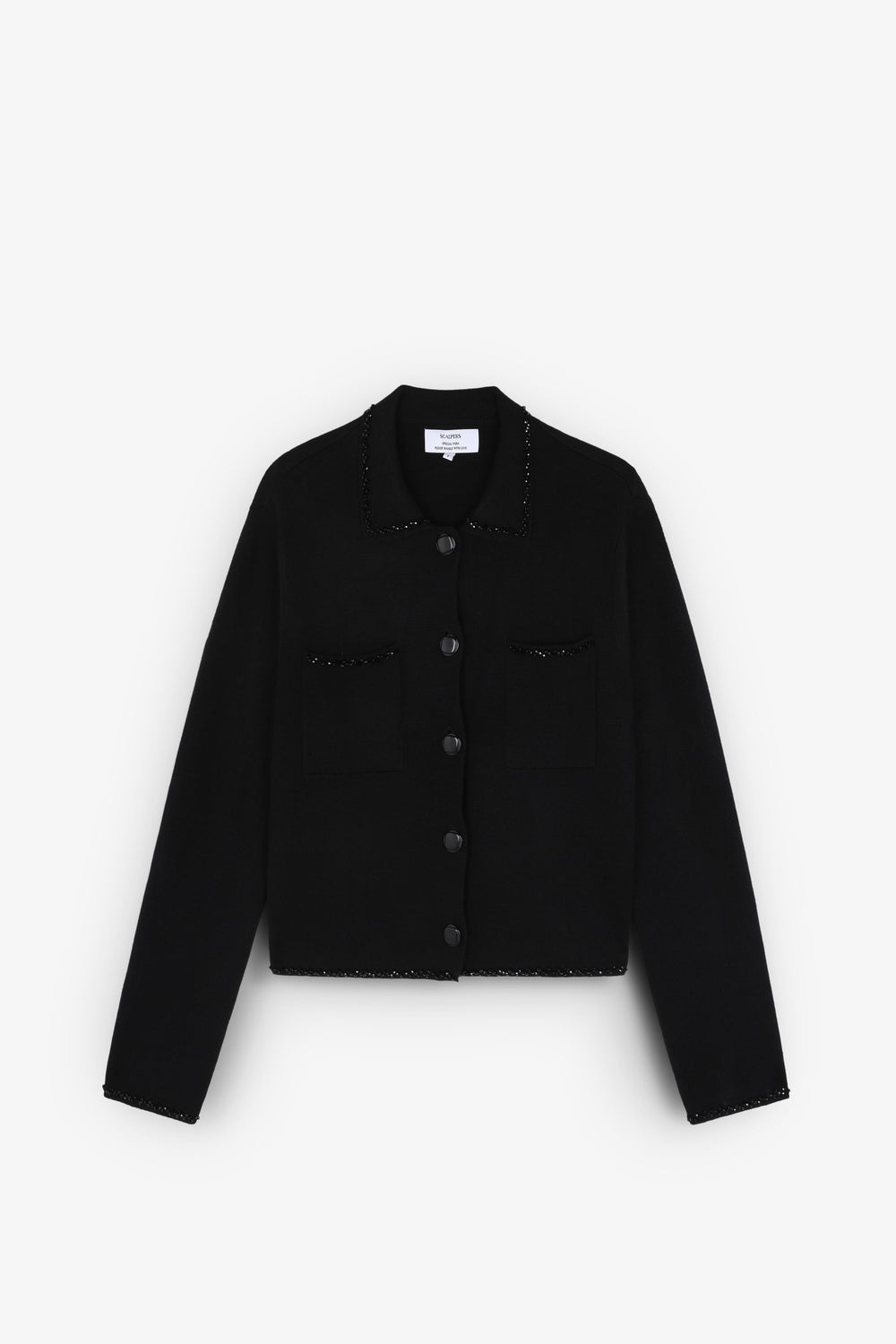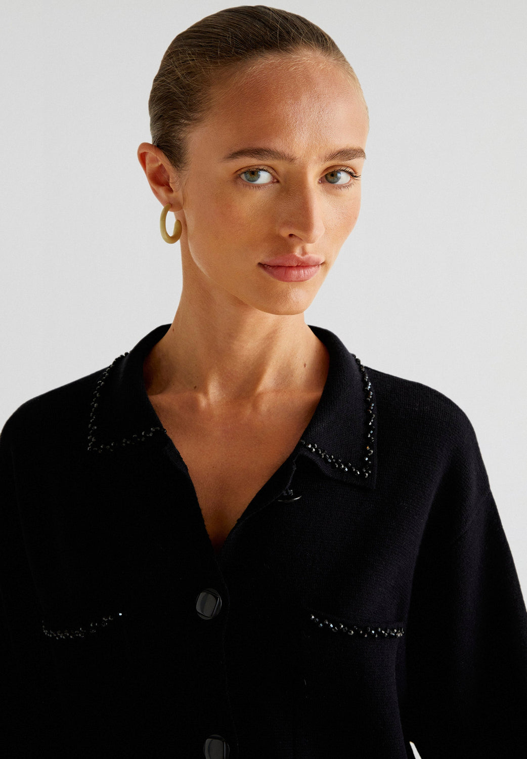 Cárdigan confeccionado en mezcla de lana. Regular fit, cuello clásico y cierre con botones. Manga larga y bolsillos. Detalle abalorios.