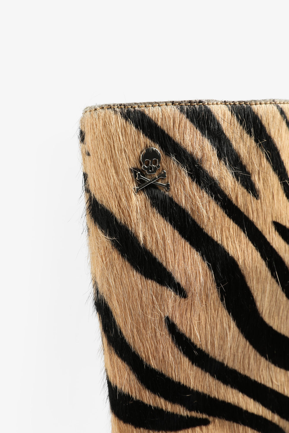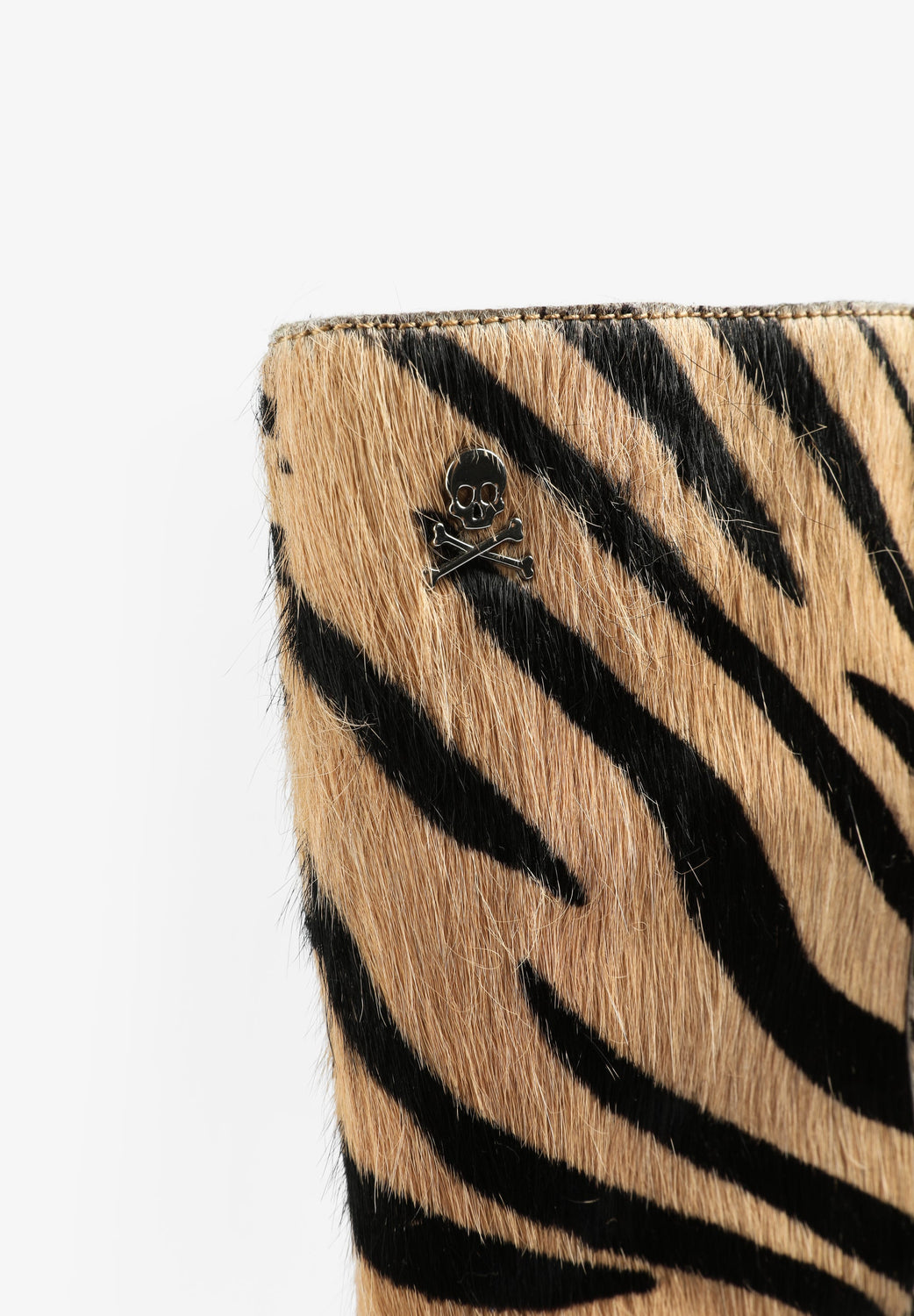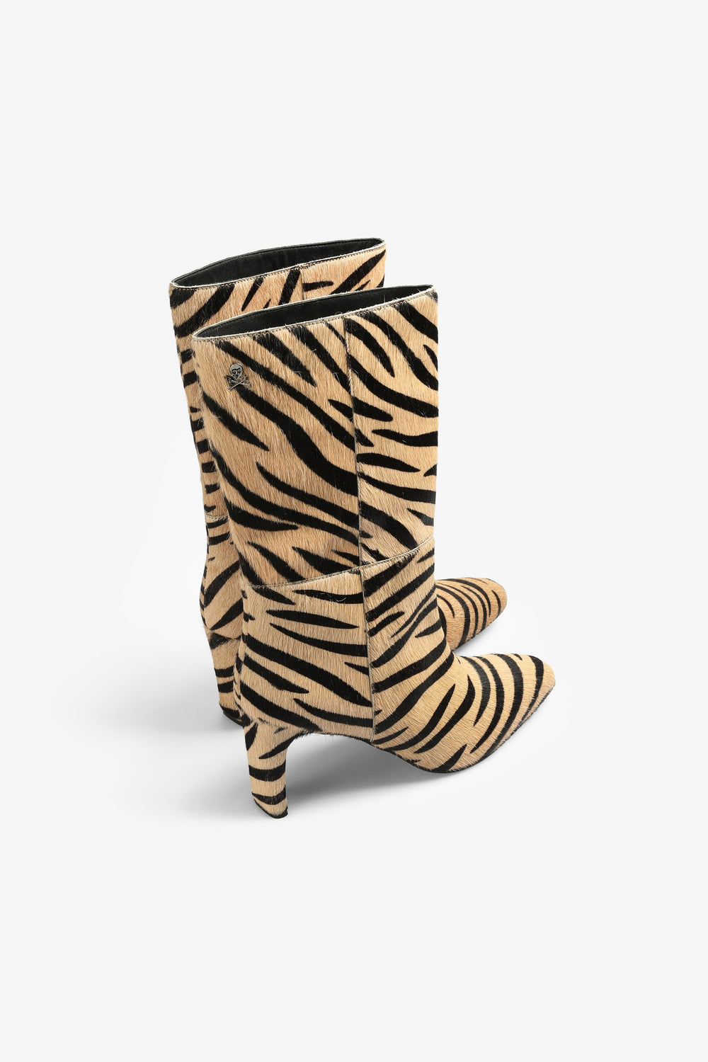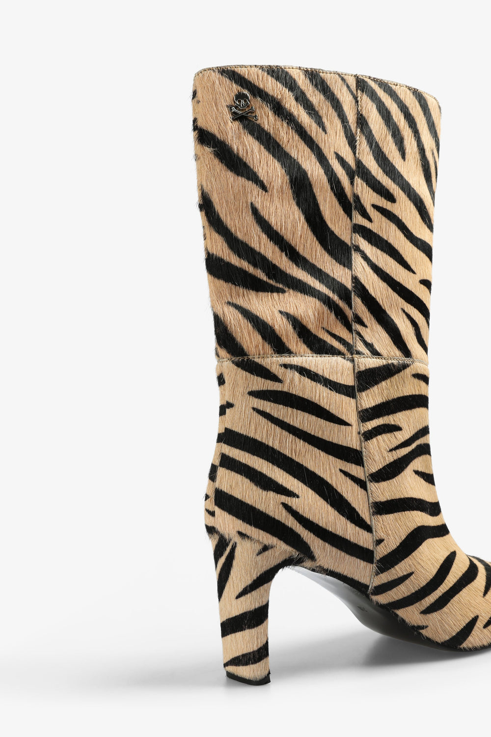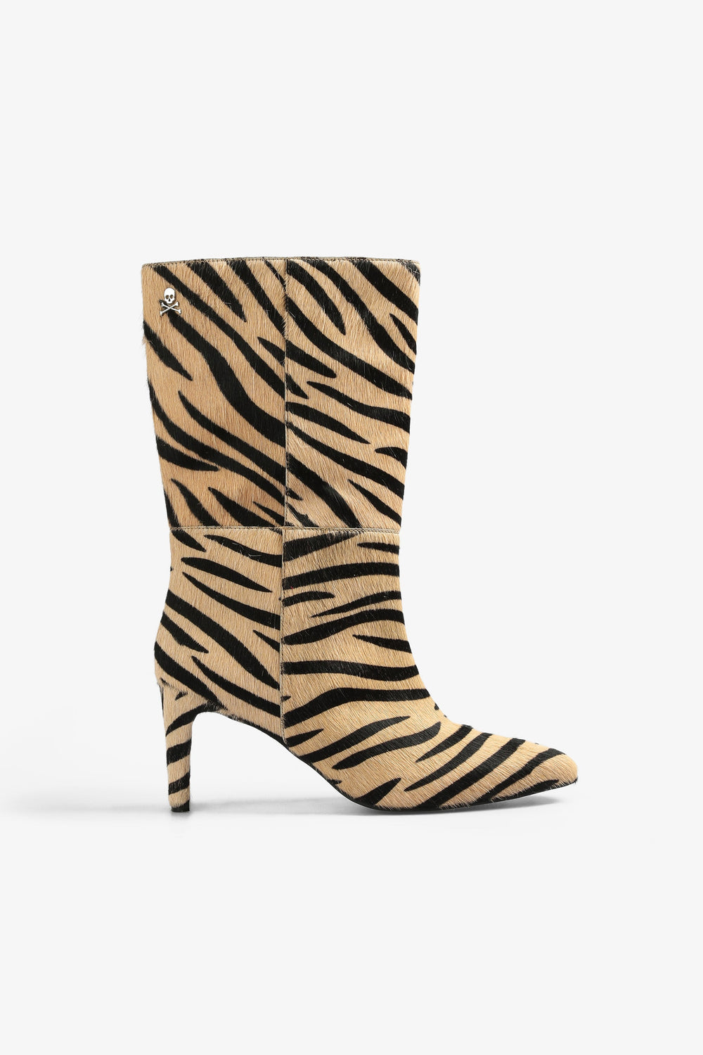 Botas de inspiración de cebra confeccionadas en 100% piel. Caña media, tacón alto y detalle de calavera metálica.
