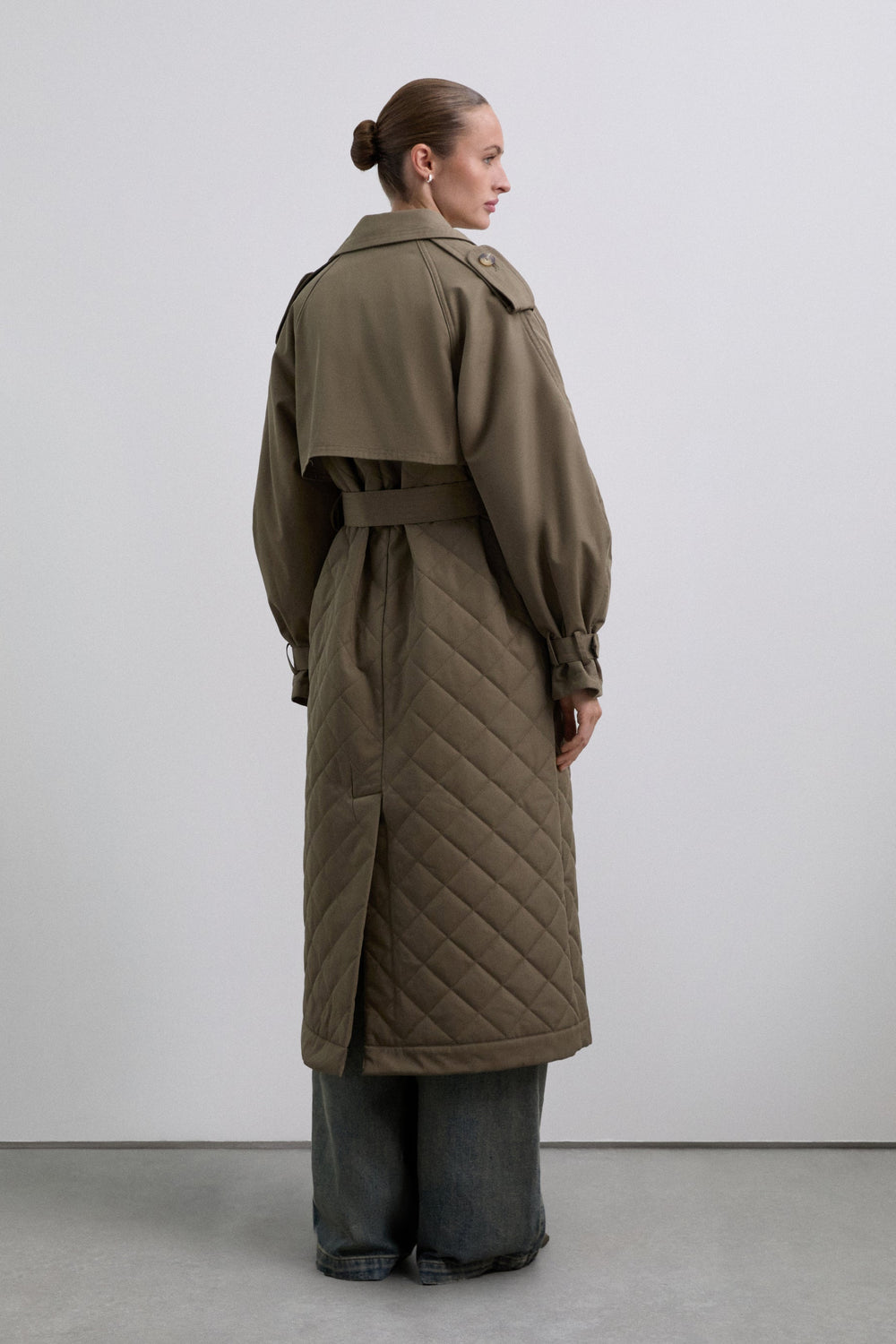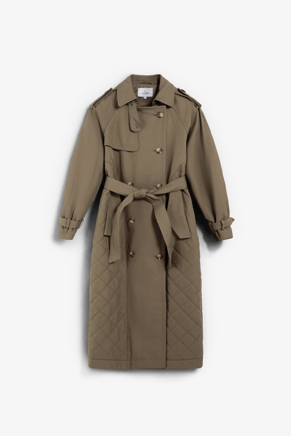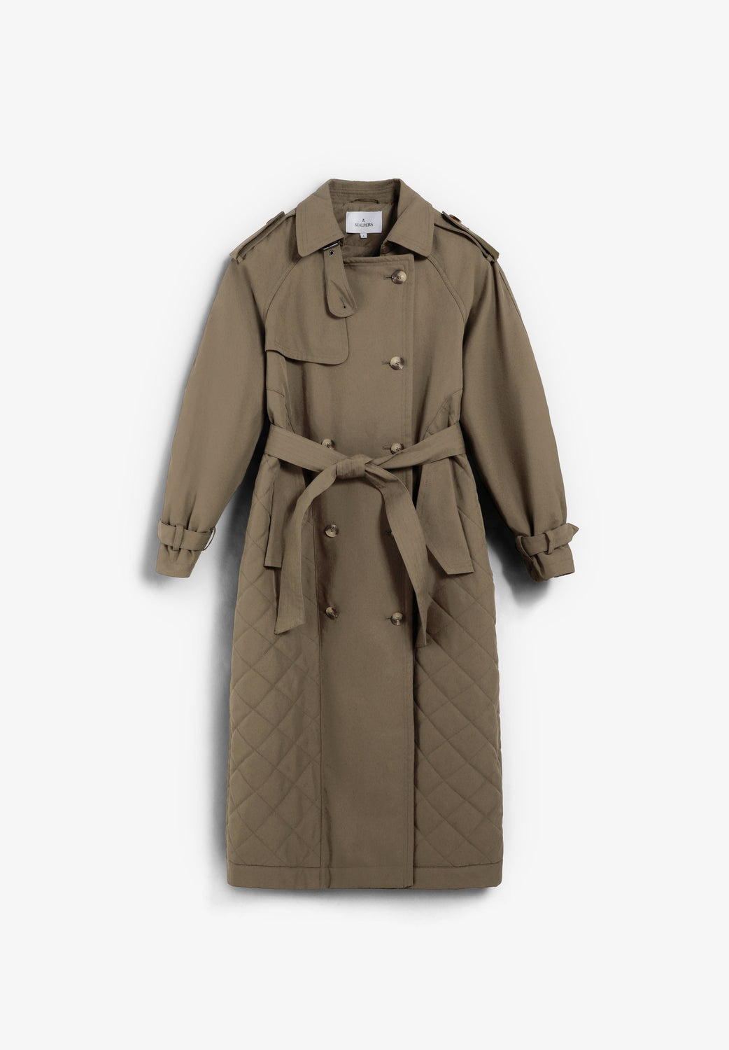 Abrigo trench acolchado e impermeable confeccionado en algodón. Detalle acolchado en la parte inferior. Mangas ligeramente oversize y trabillas en los puños. Cierre frontal con botones y cinturón ajustable.