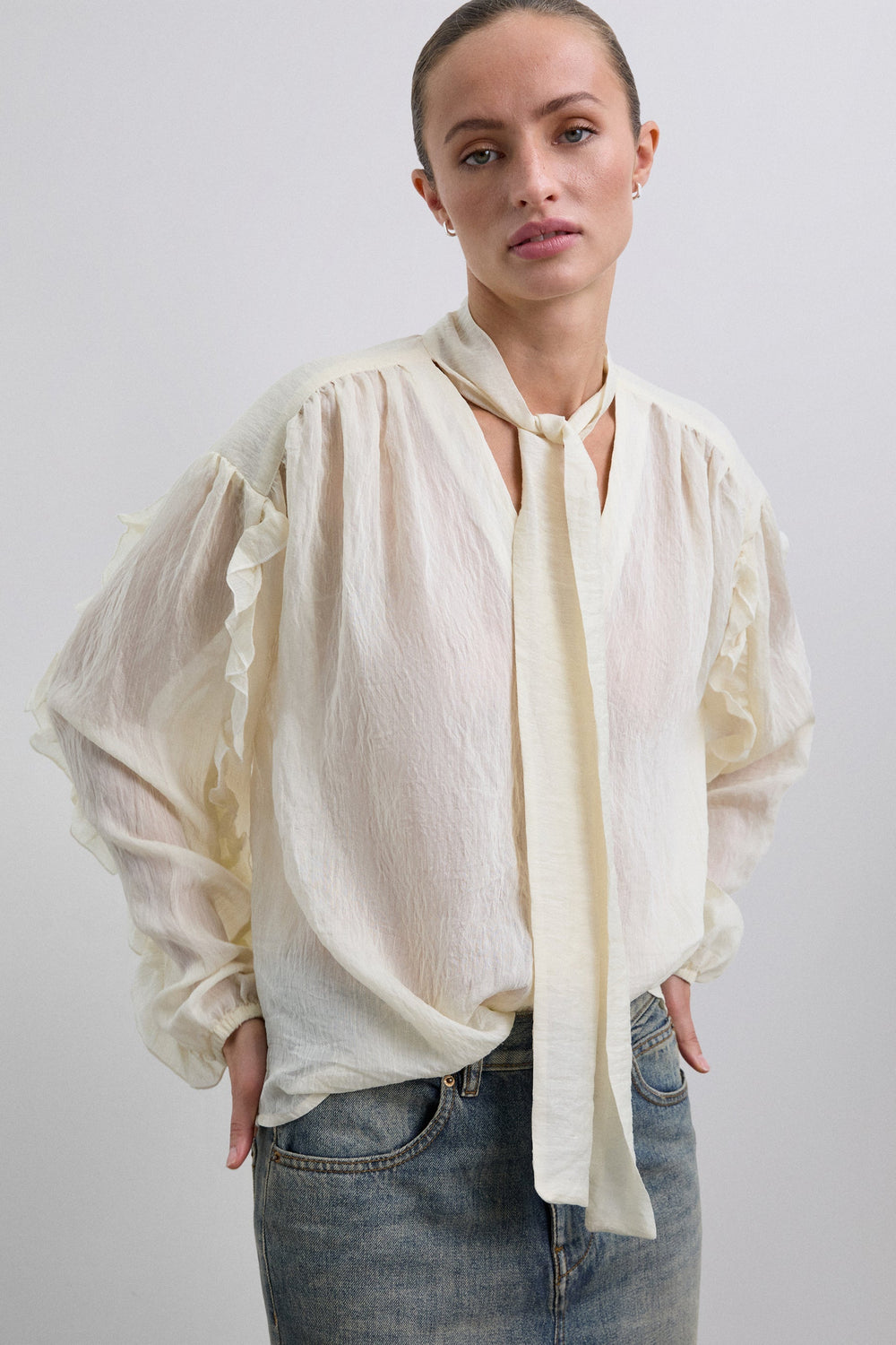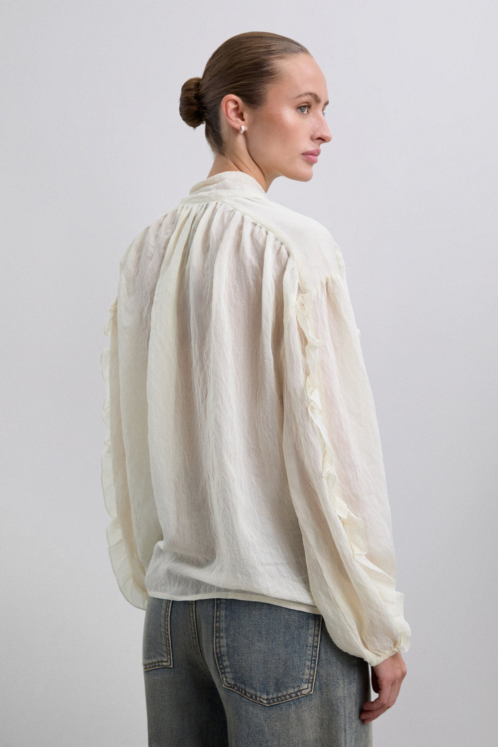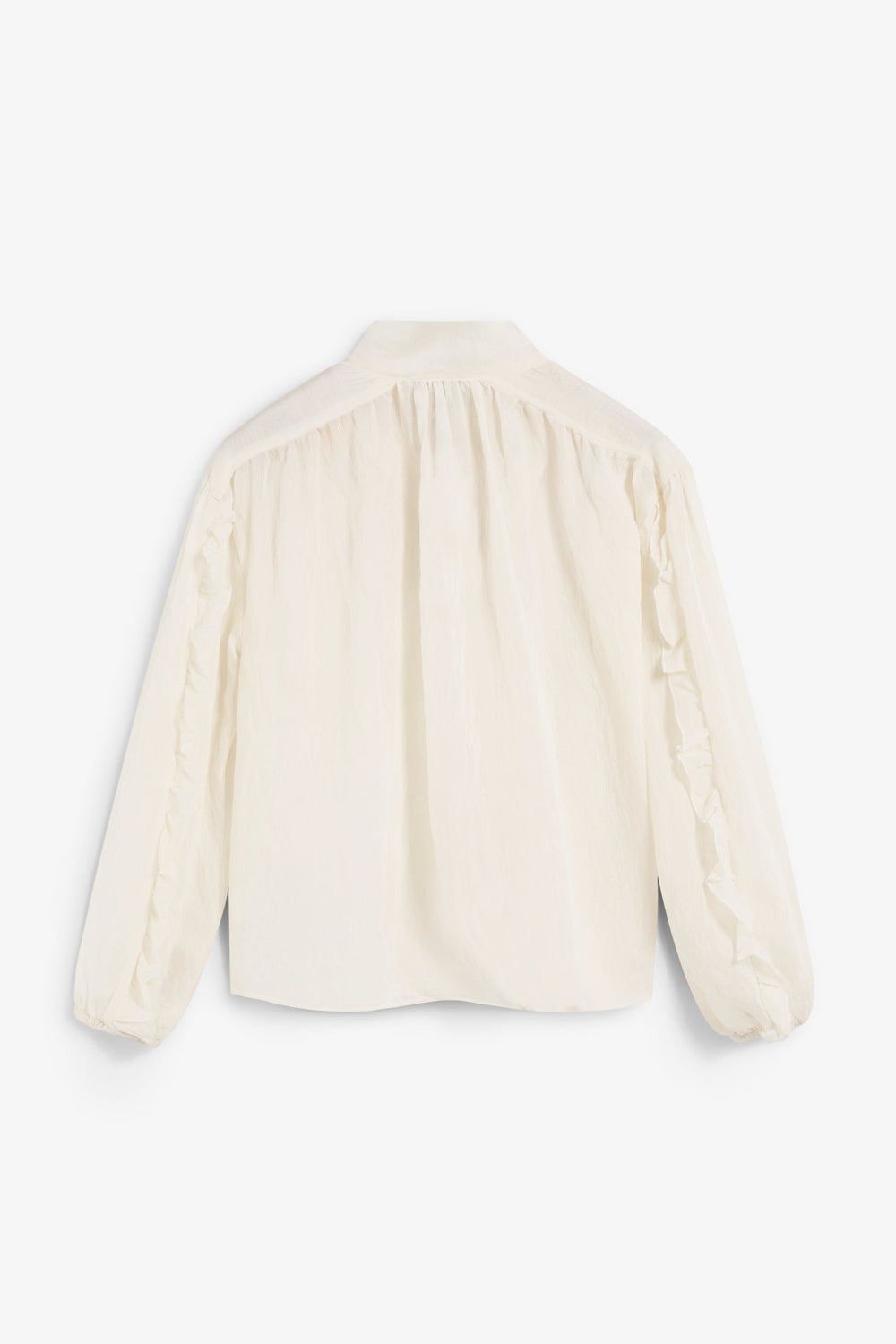 Blusa confeccionada en tejido fluido con lino y rayón. Regular Fit. Escote con detalle de lazo. Cierre con botones frontales. Manga larga ligeramente abullonada terminada en puños. Detalles de frunces en mangas.