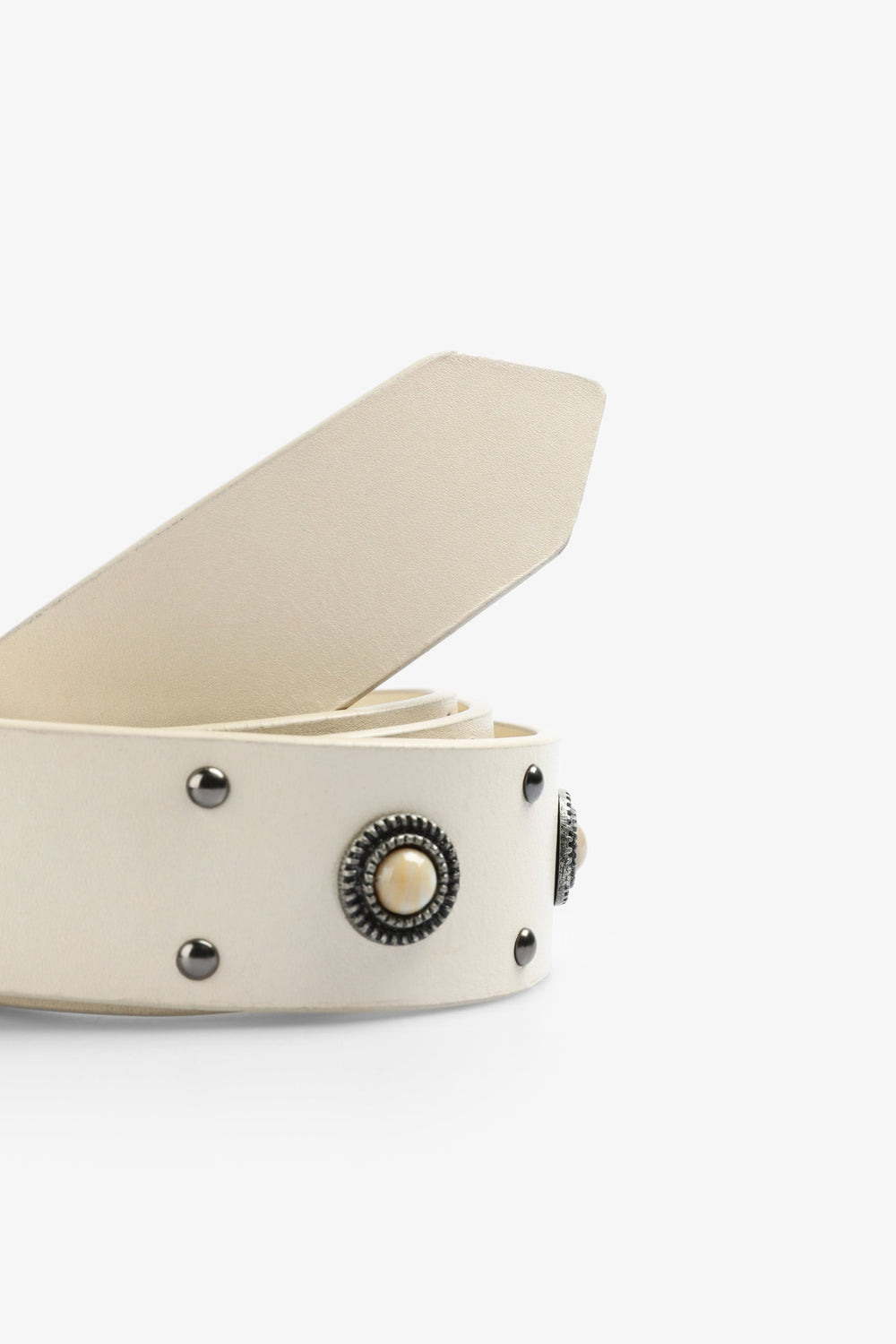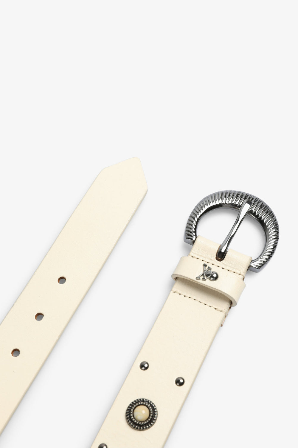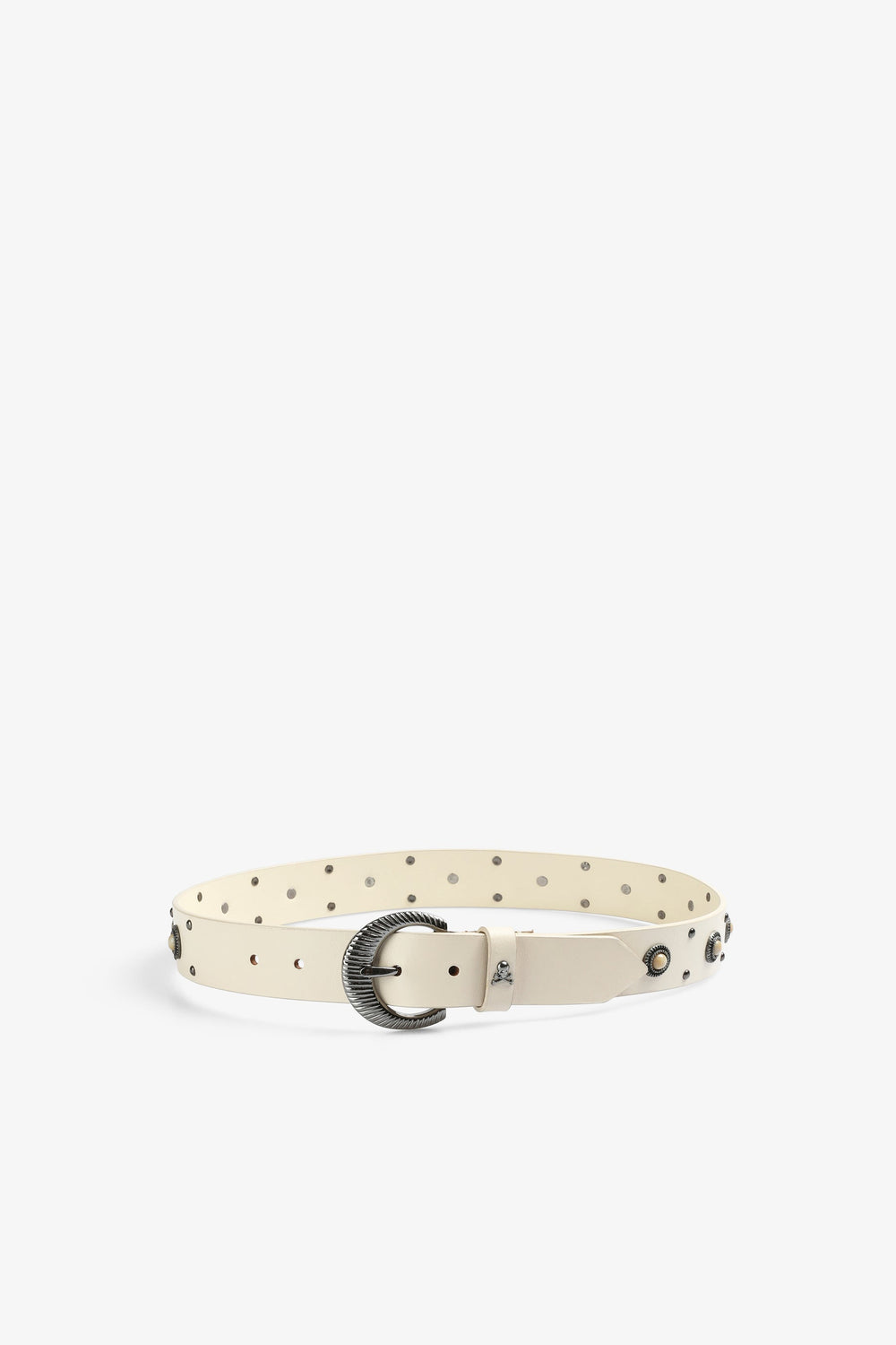 Cinturón con tachuelas confeccionado en 100% piel. Hebilla metálica con fantasía.