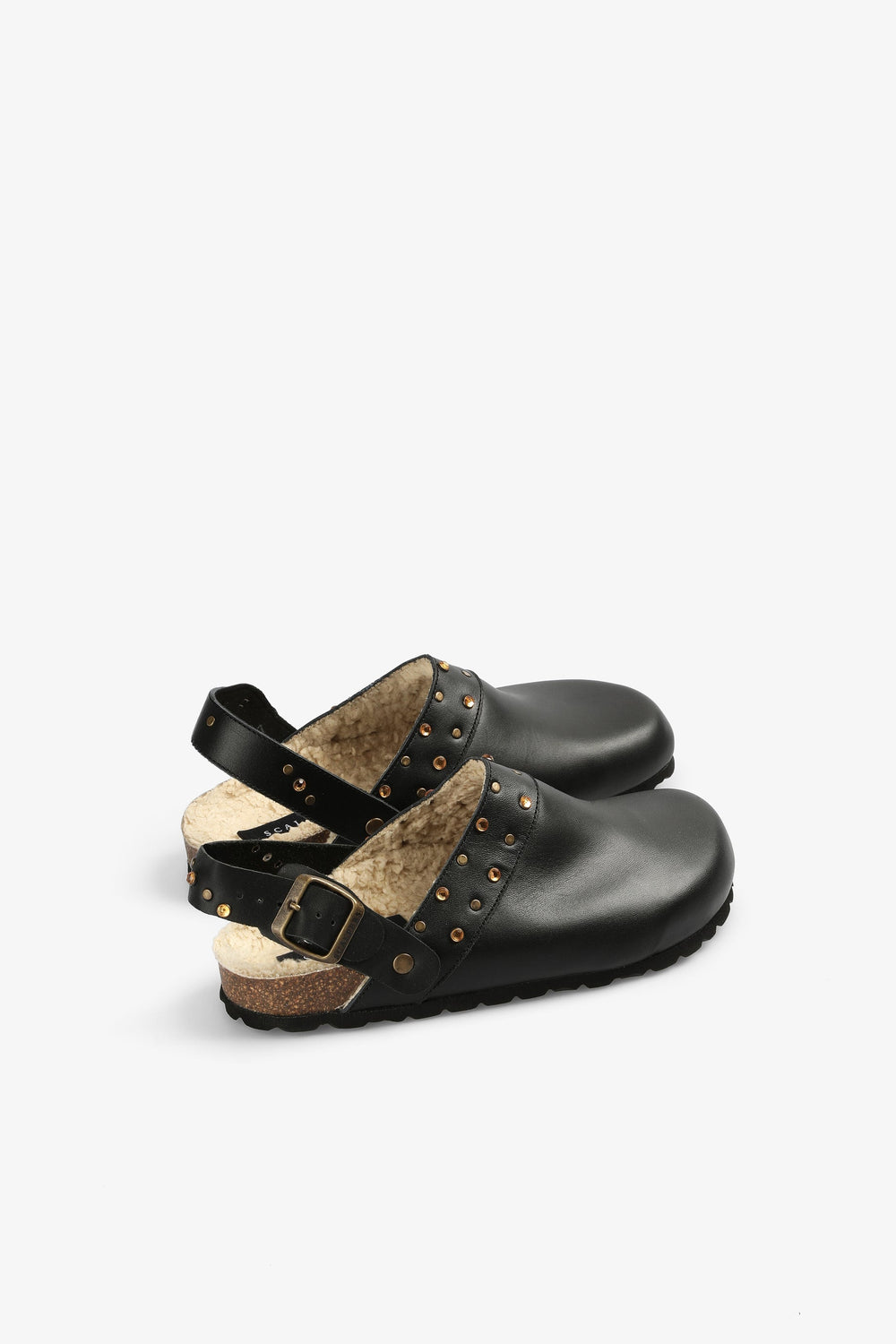 Zueco confeccionado en 100% piel. Cierre con tira trasera ajustable, suela de goma y corcho y tachuelas.