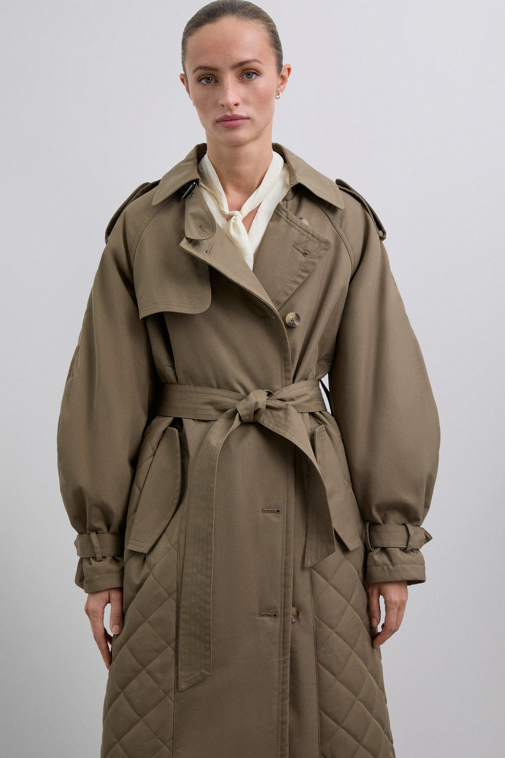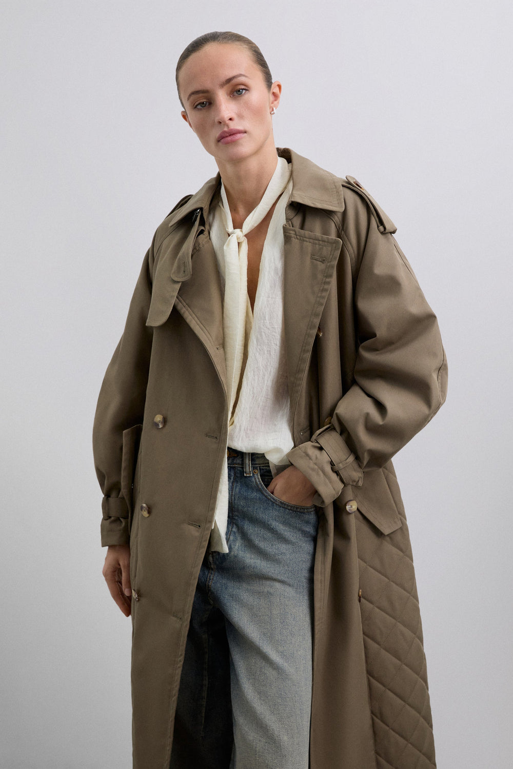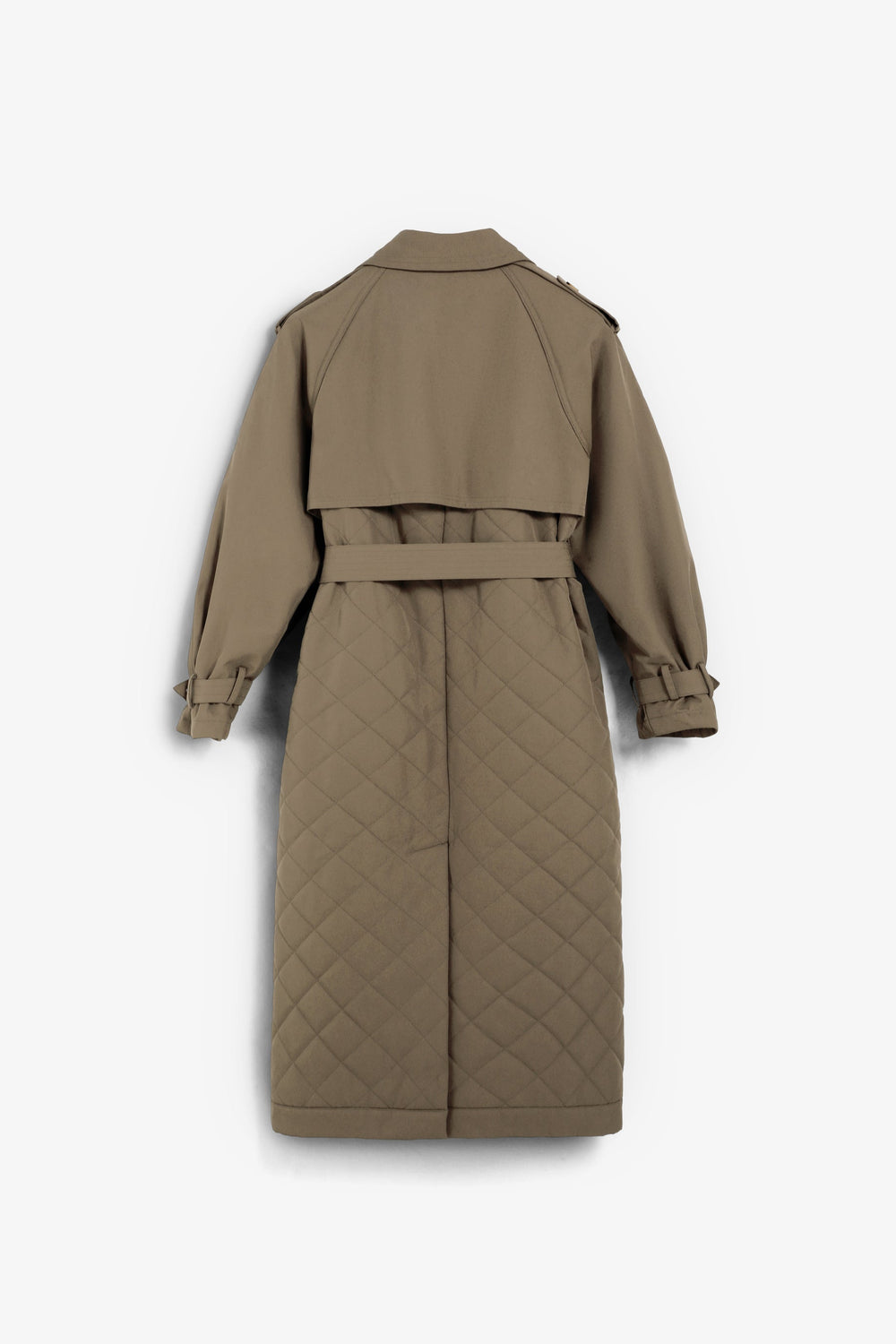 Abrigo trench acolchado e impermeable confeccionado en algodón. Detalle acolchado en la parte inferior. Mangas ligeramente oversize y trabillas en los puños. Cierre frontal con botones y cinturón ajustable.