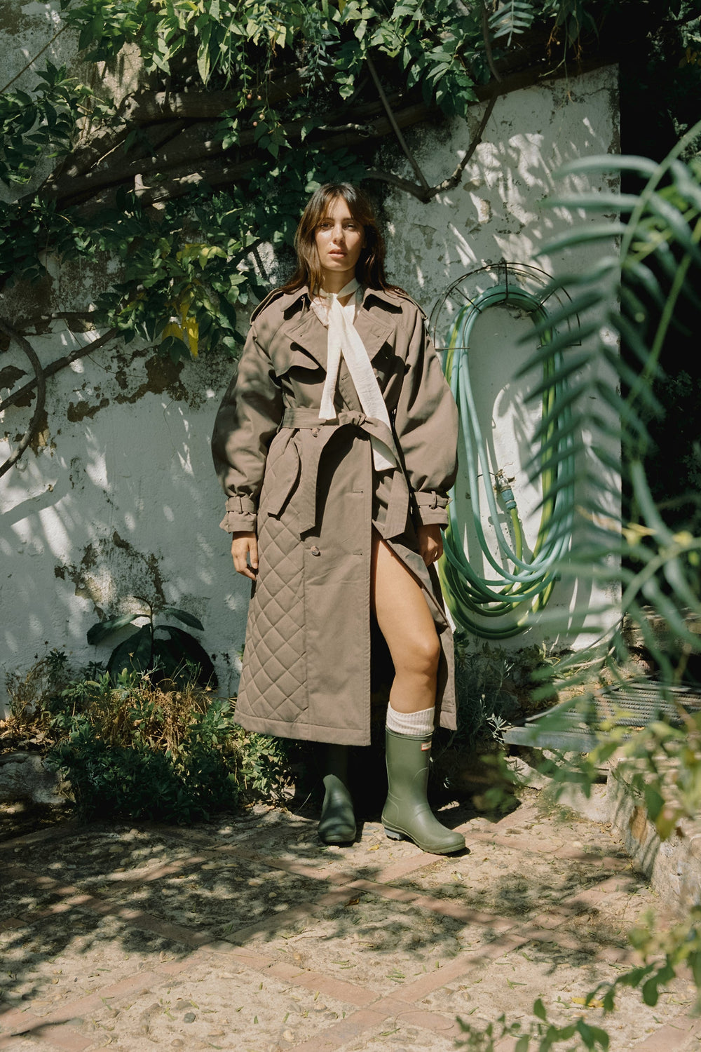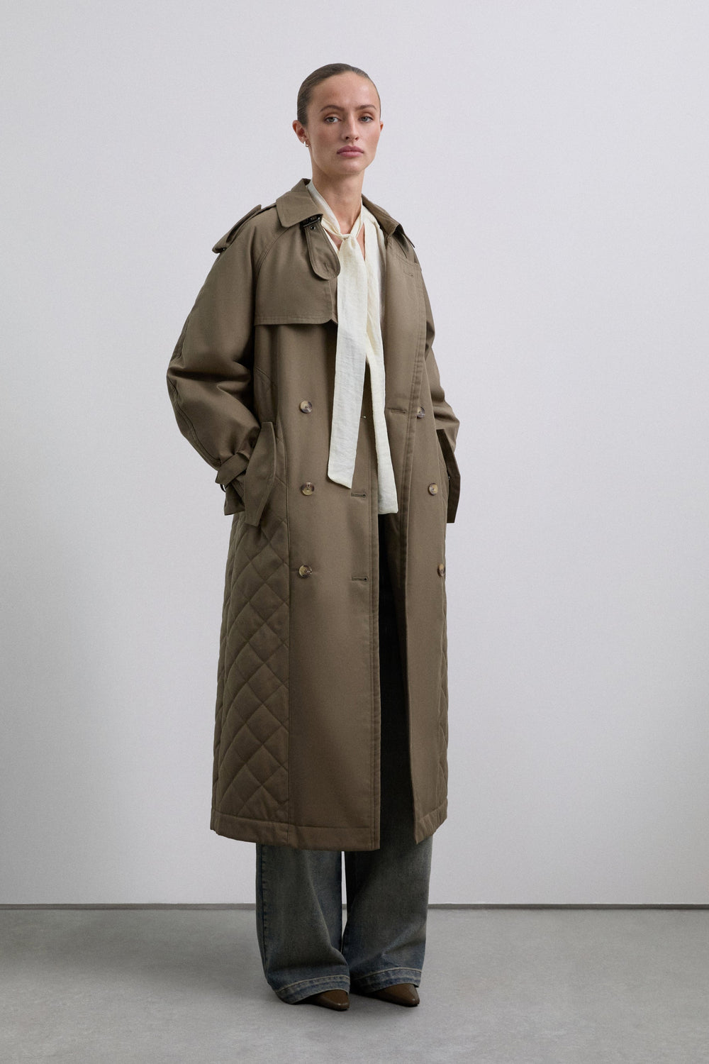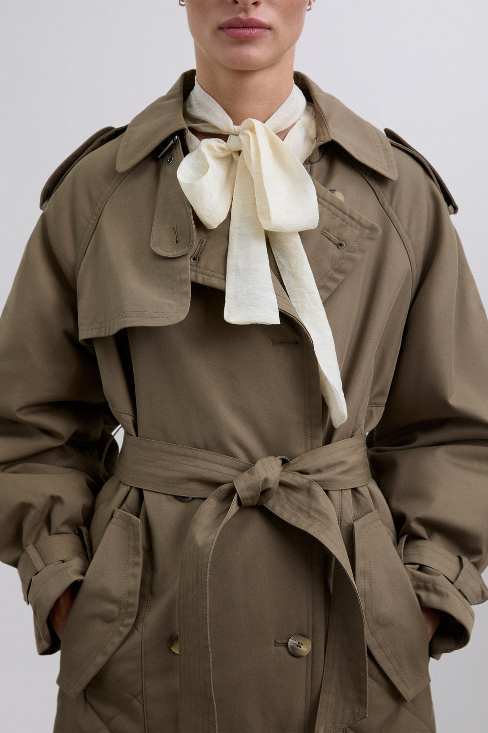 Abrigo trench acolchado e impermeable confeccionado en algodón. Detalle acolchado en la parte inferior. Mangas ligeramente oversize y trabillas en los puños. Cierre frontal con botones y cinturón ajustable.