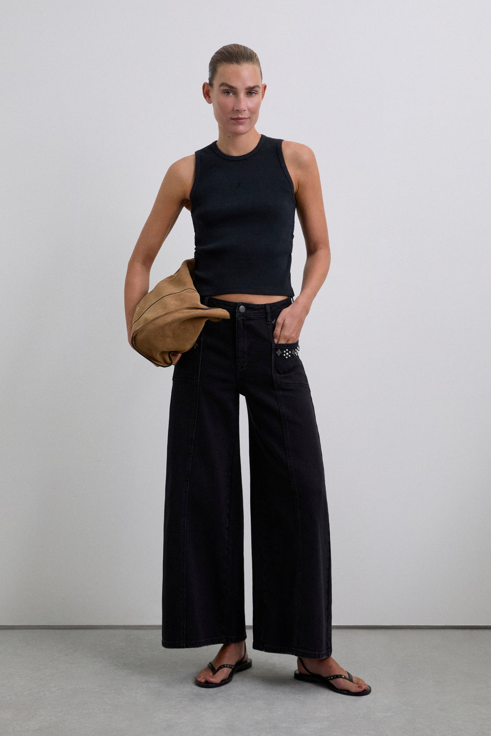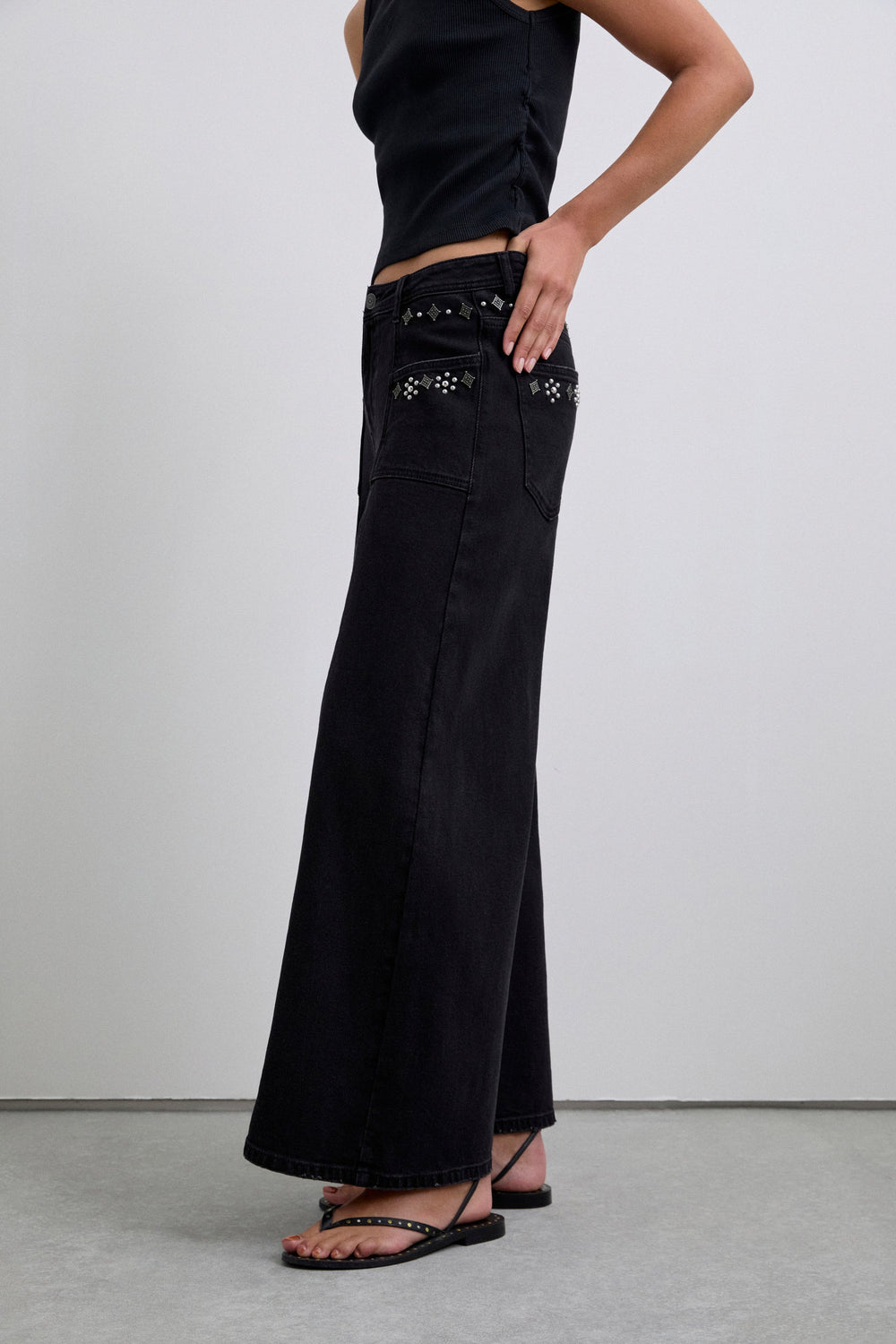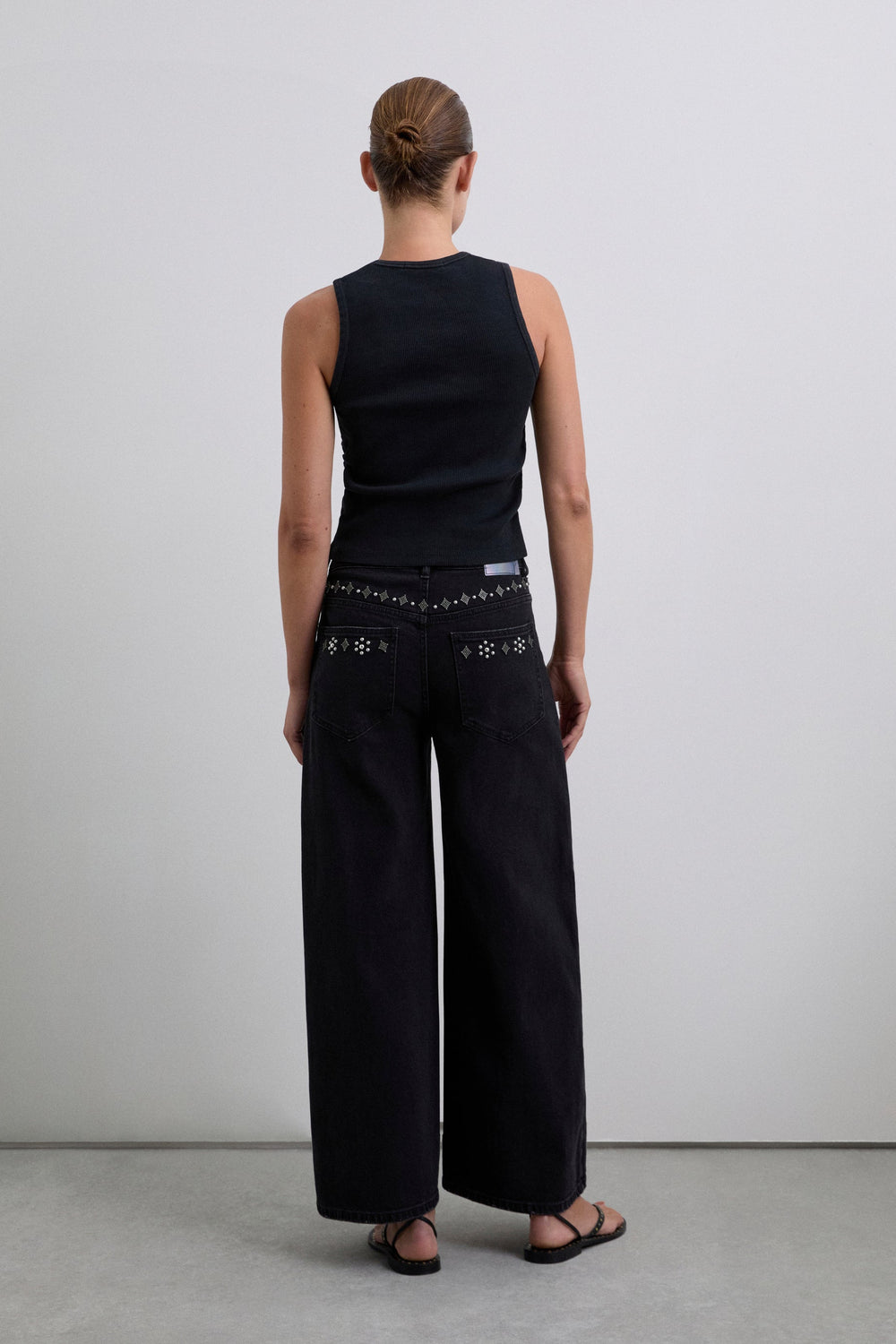 Pantalón Vaquero confeccionado en 99% Algodón. Cierre mediante botón y cremallera en frontal. Detalles tachuelas zona cintura por delante y por detrás.