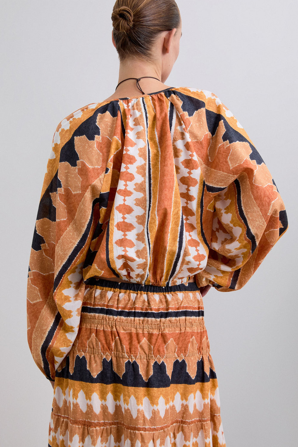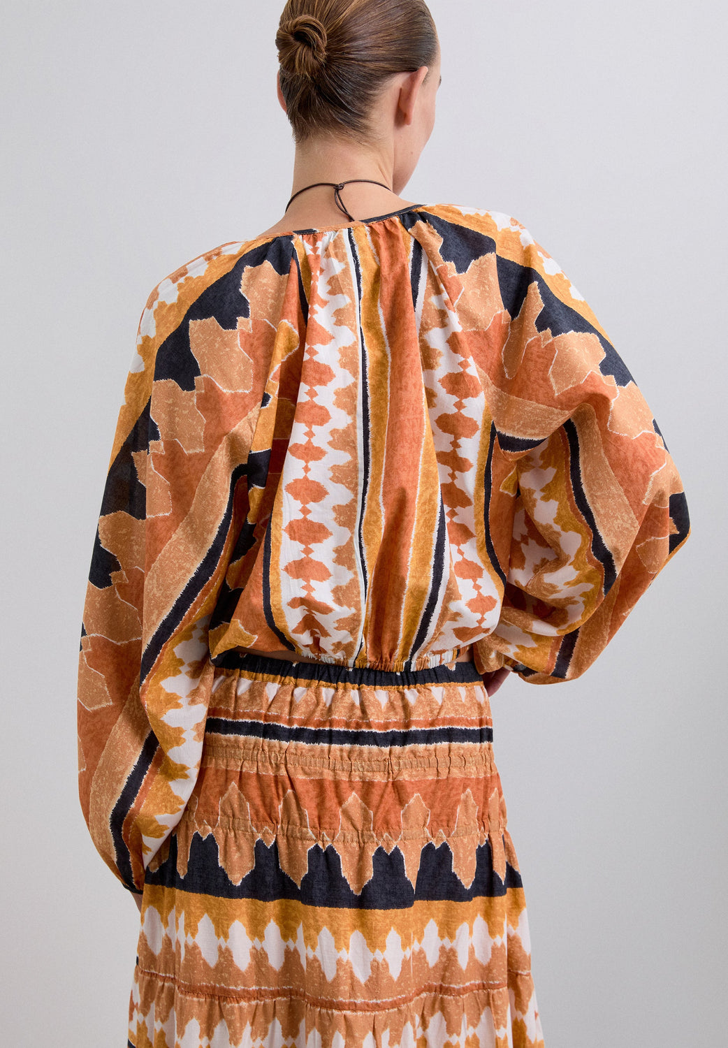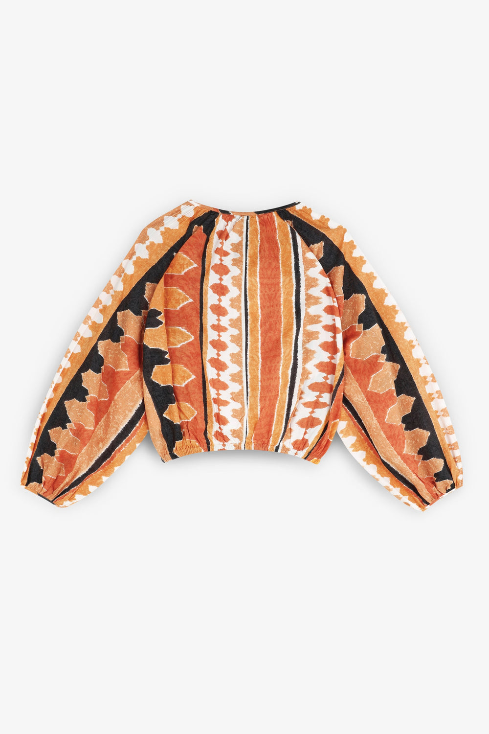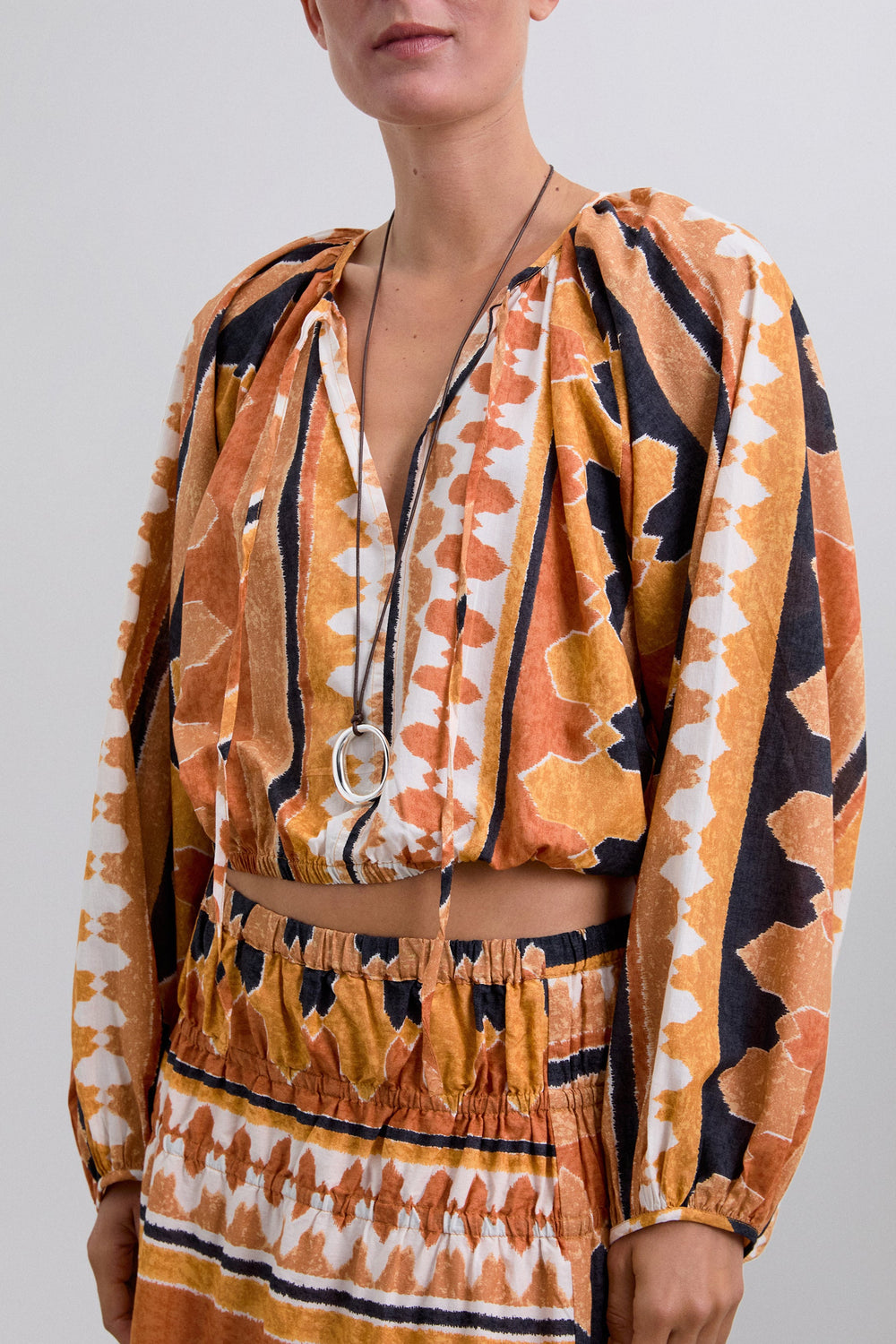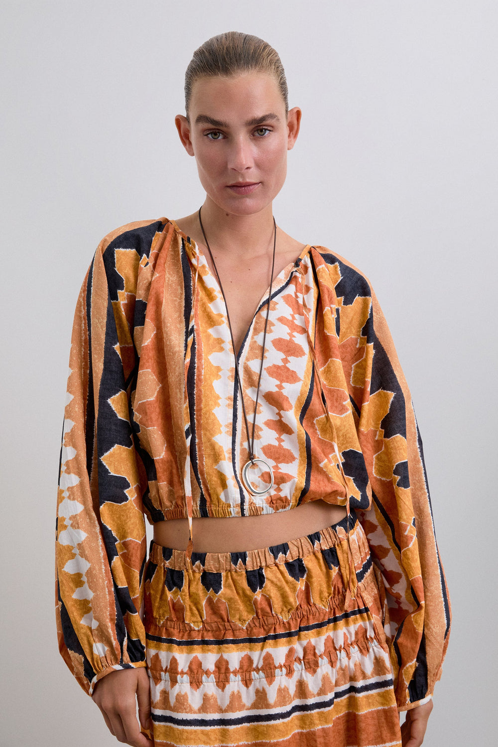 Camisa estampada confeccionada en 100% algodón orgánico BCI. Cropped. Escote en V ajustable mediante lazada. Manga larga abullonada. acabo de puño fruncido en mangas.