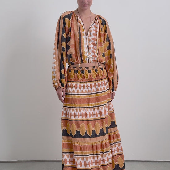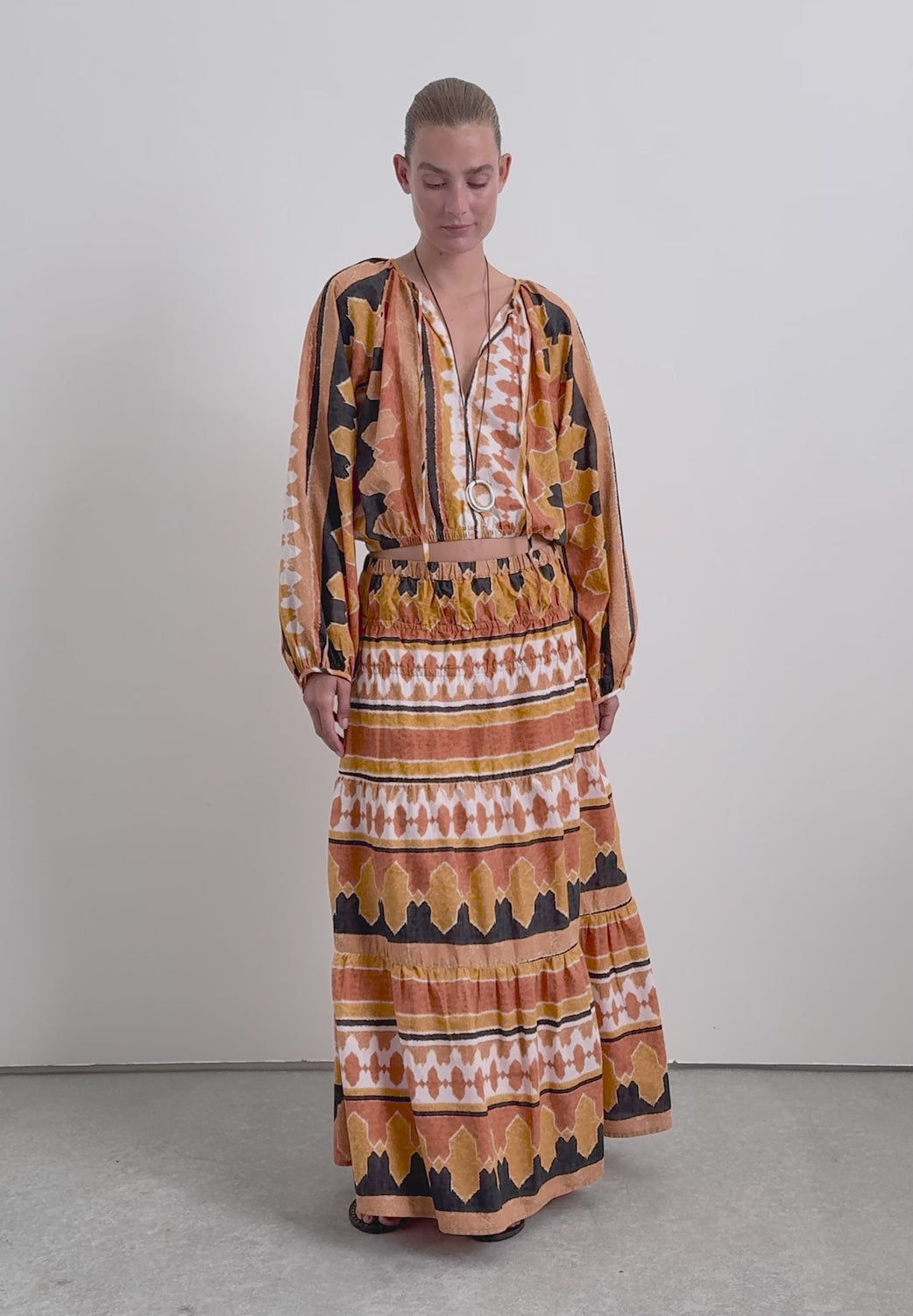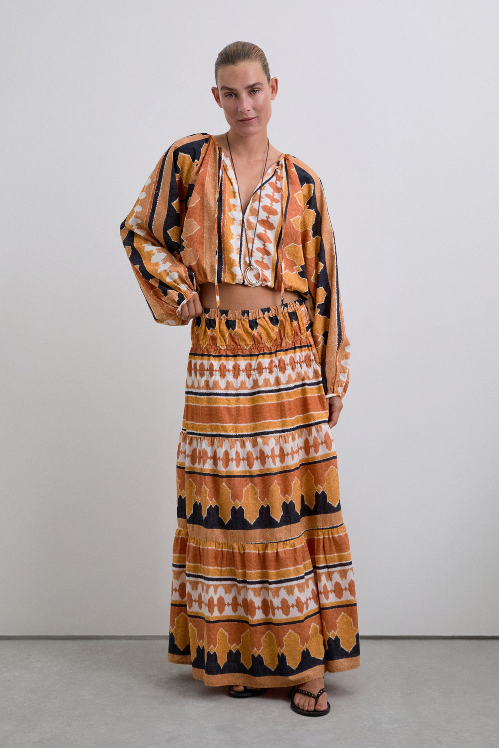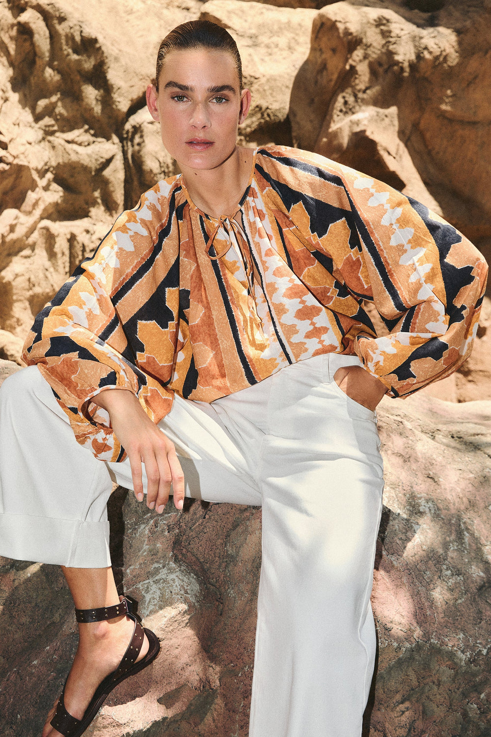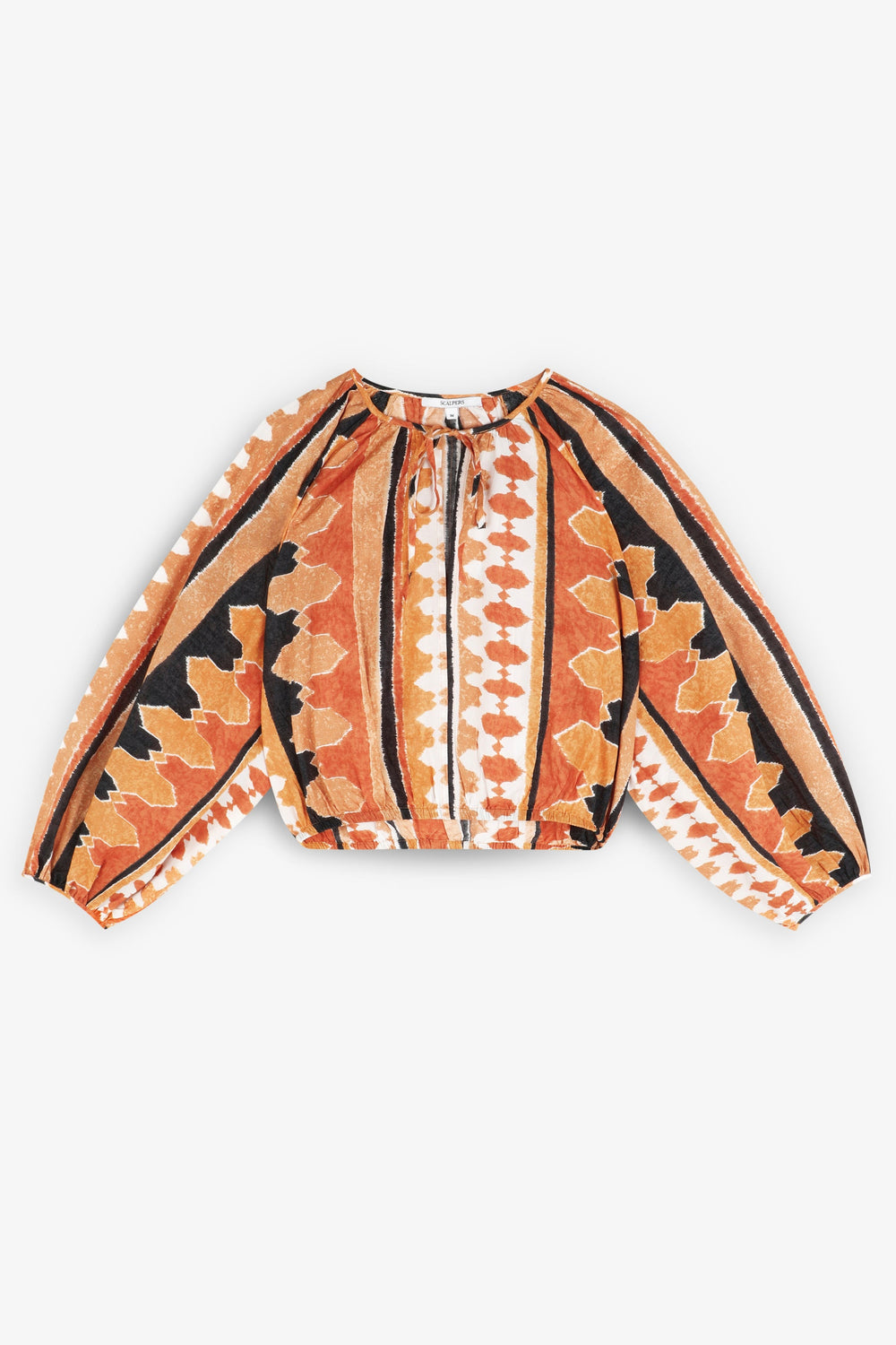 Camisa estampada confeccionada en 100% algodón orgánico BCI. Cropped. Escote en V ajustable mediante lazada. Manga larga abullonada. acabo de puño fruncido en mangas.
