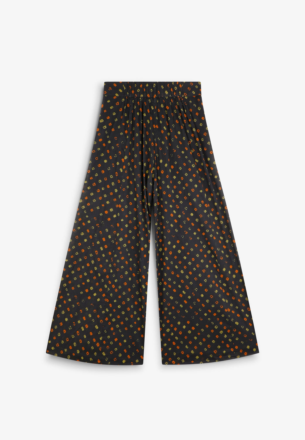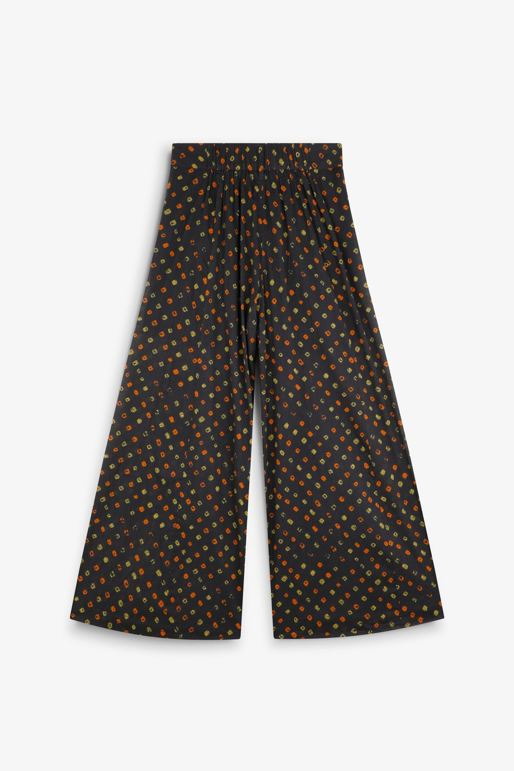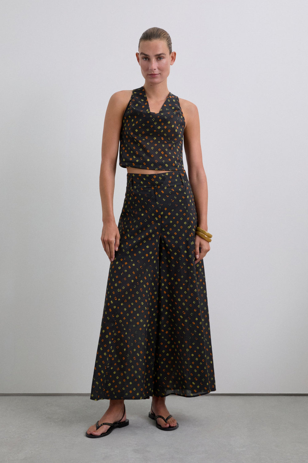Pantalón confeccionado en 100% algodón BCI con estampado. Corte culotte con cierre mediante cremallera lateral oculta y trabillas en cintura.