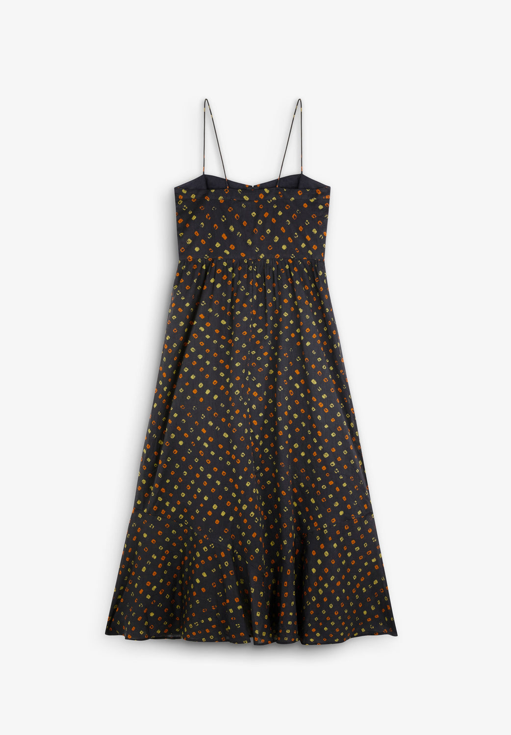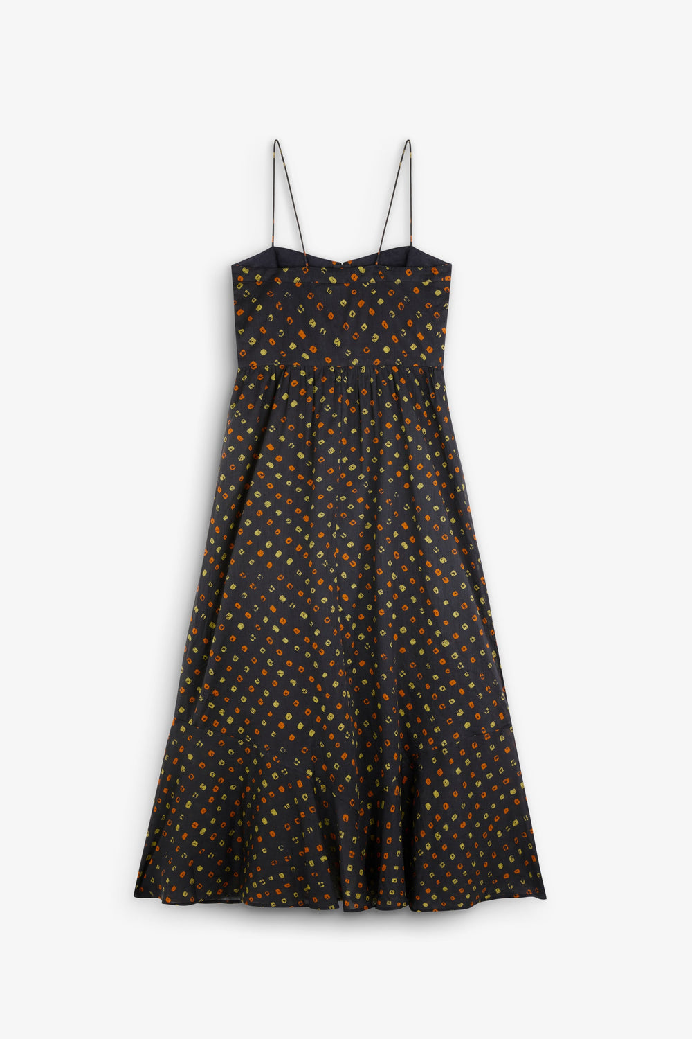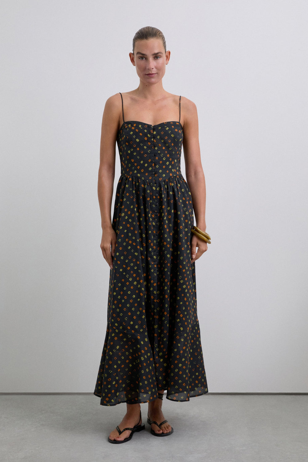 Vestido print confeccionado en tejido 100% Algodón BCI con estampado. Detalle de botones en frontal. Corte Regular Fit, silueta A Line y tirantes finos.