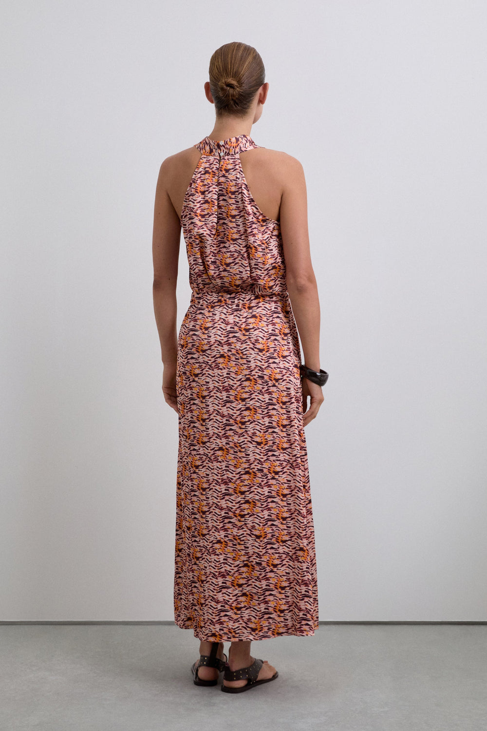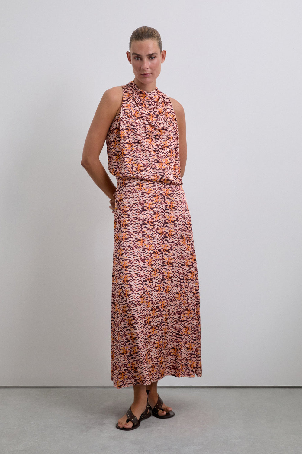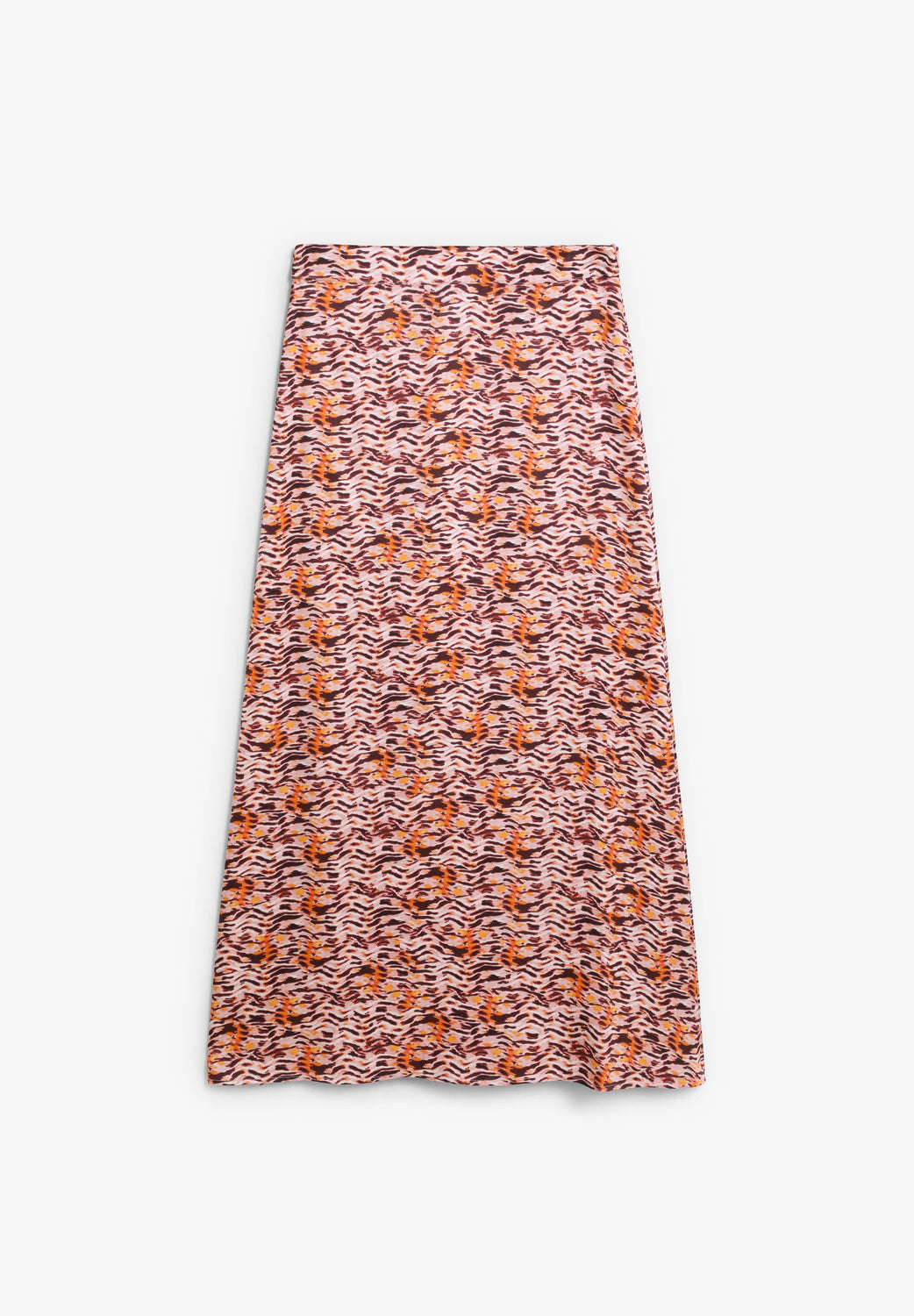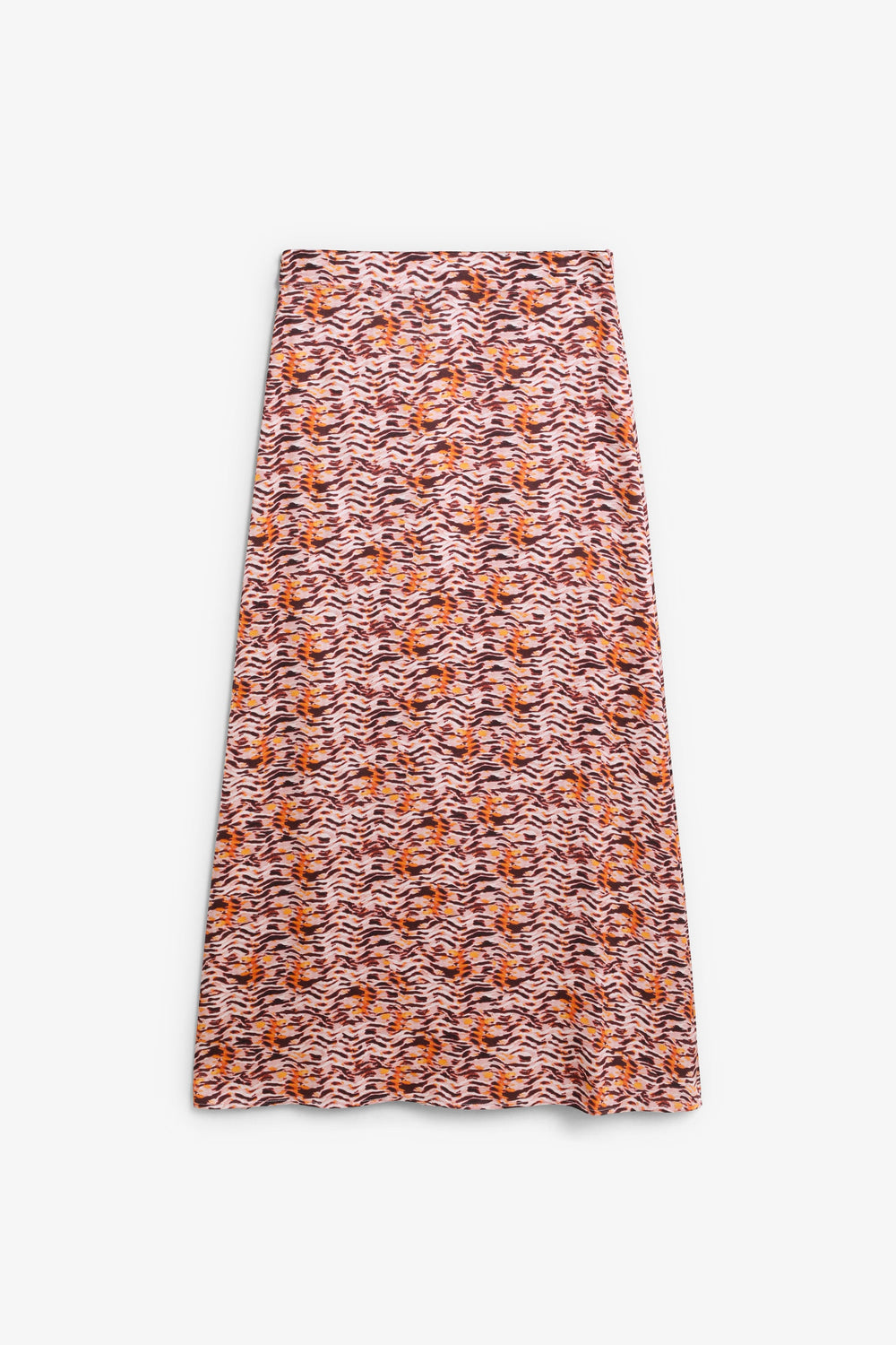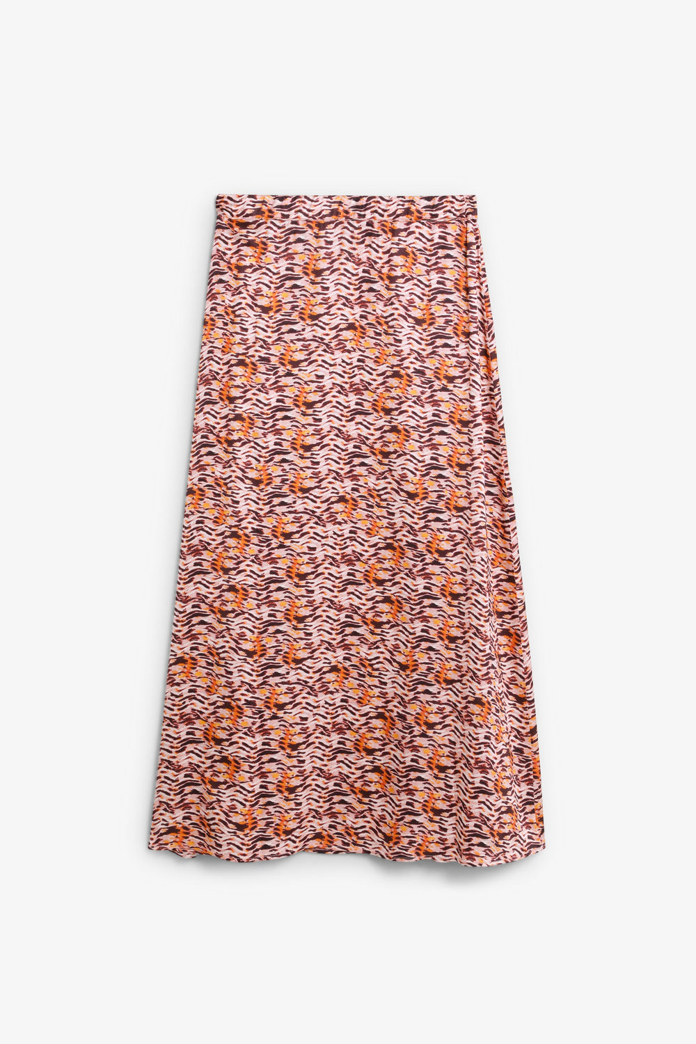 Falda midi confeccionada en 100% viscosa. Corte midi, estampada, fluida.
