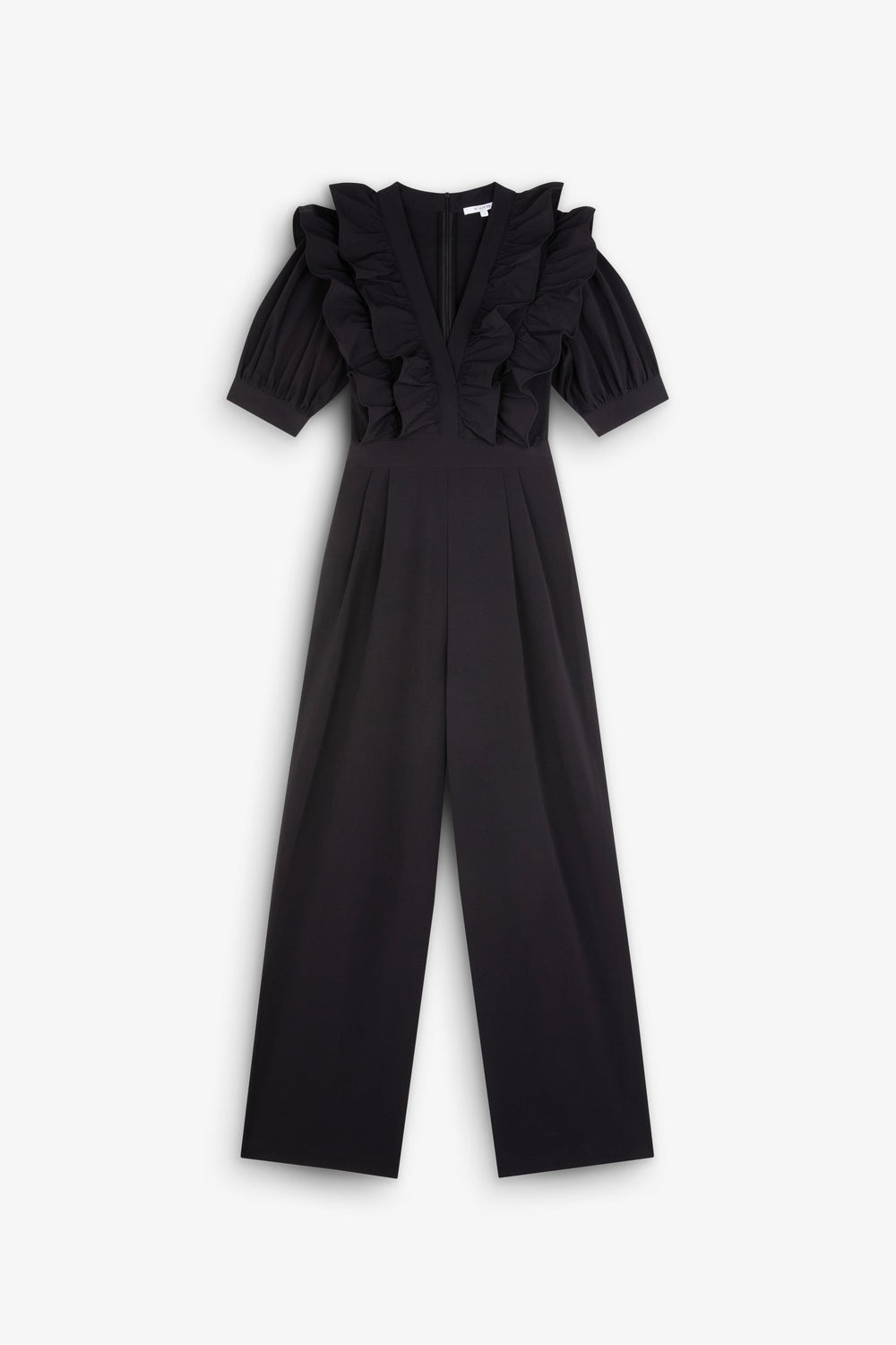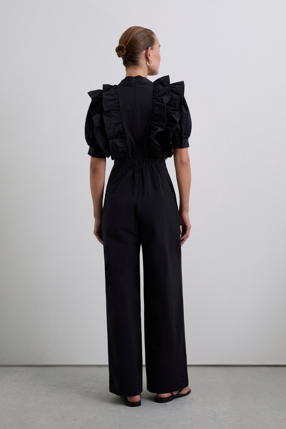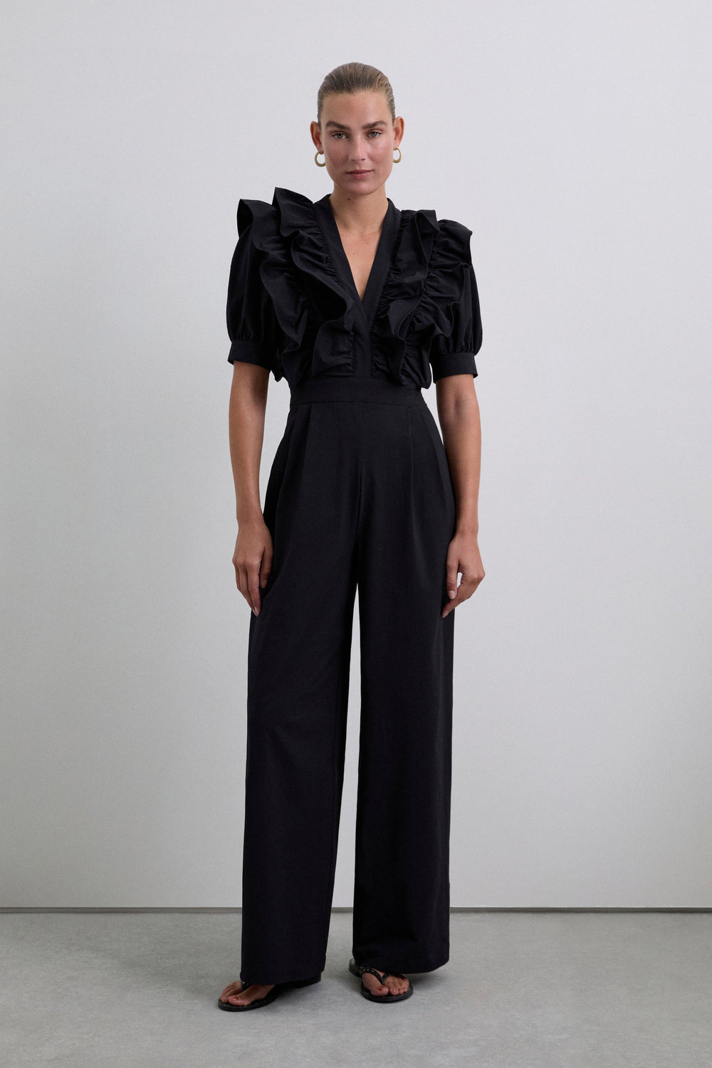 Mono negro confeccionado en mezcla de viscosa. Corte Regular fit, escote en V con detalle de volantes, manga abullonada con terminación, entallado en cintura y corte pantalón full length con pinzas. Cierre con cremallera trasera oculta.