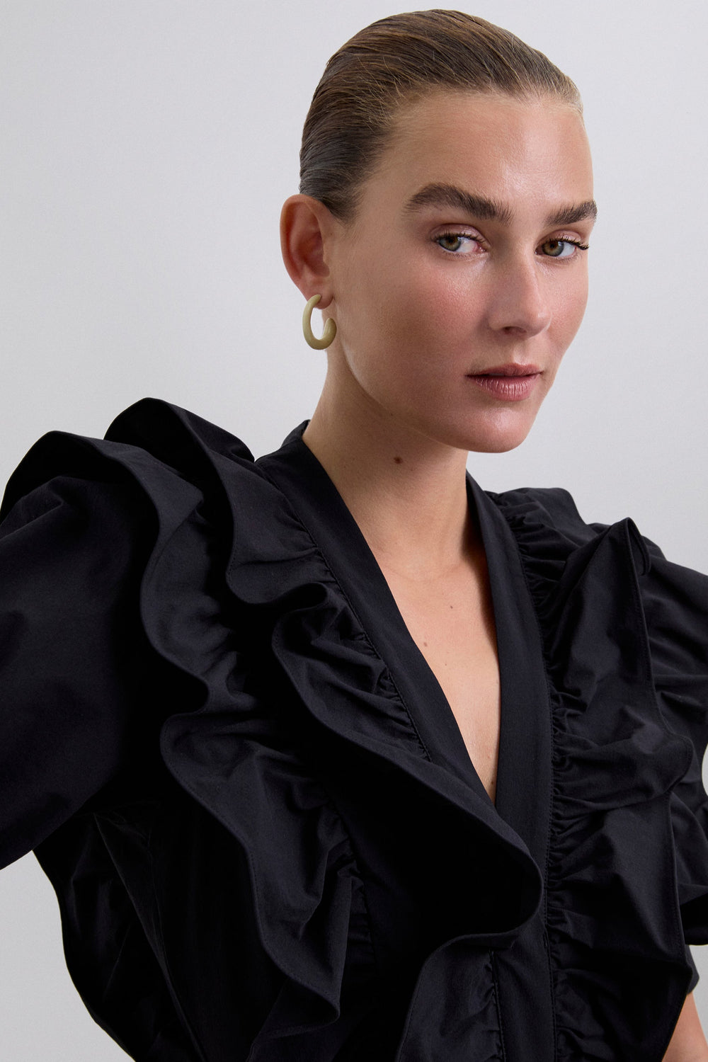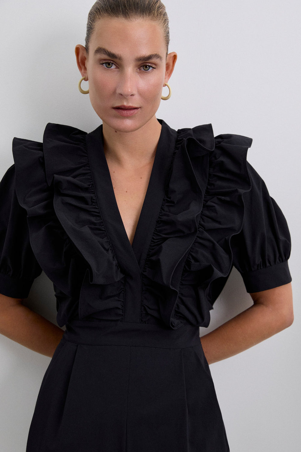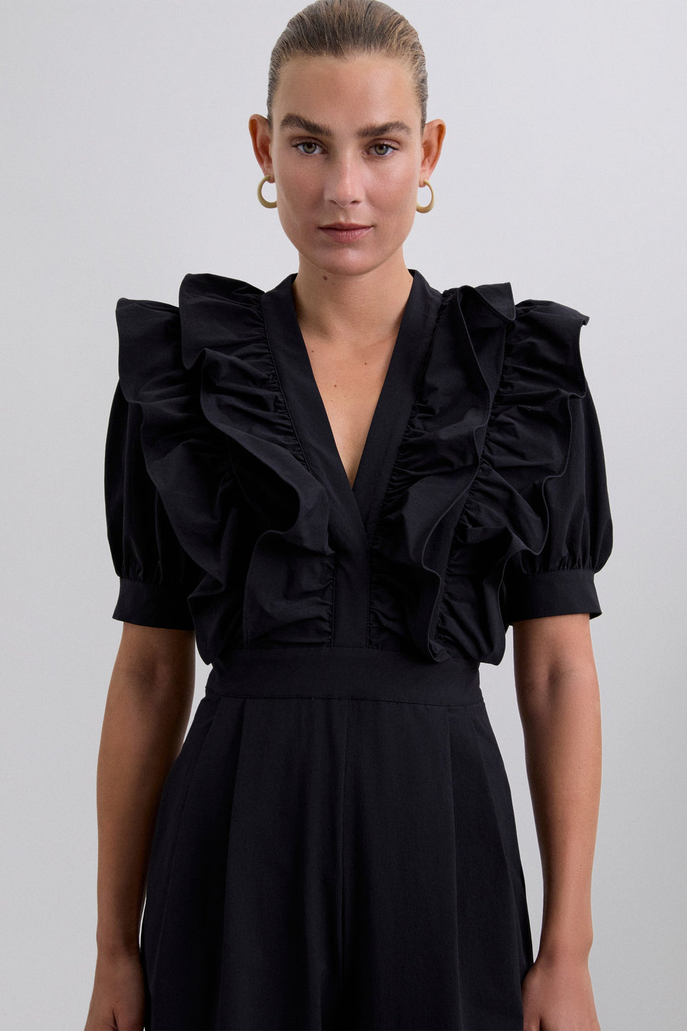 Mono negro confeccionado en mezcla de viscosa. Corte Regular fit, escote en V con detalle de volantes, manga abullonada con terminación, entallado en cintura y corte pantalón full length con pinzas. Cierre con cremallera trasera oculta.