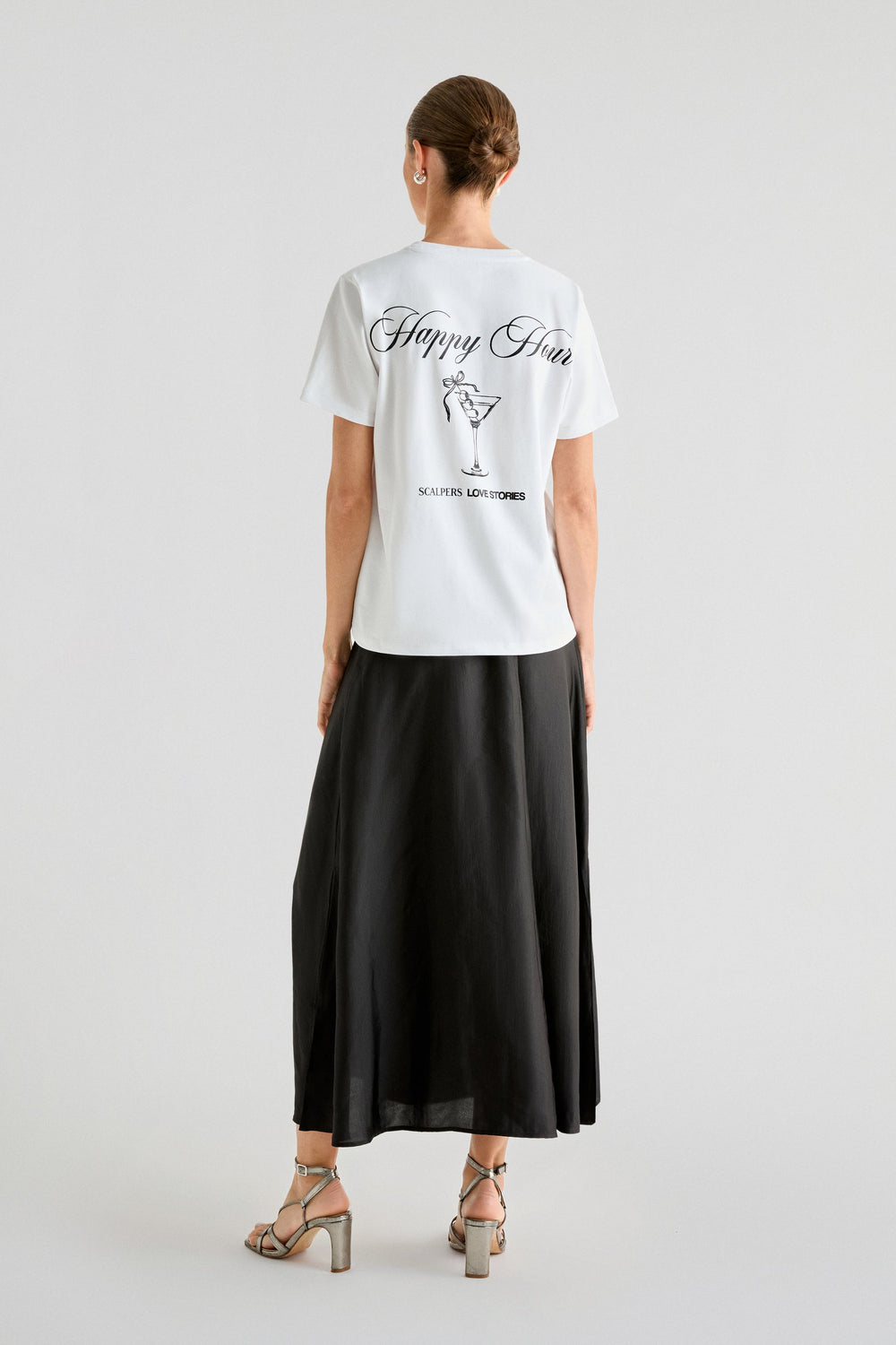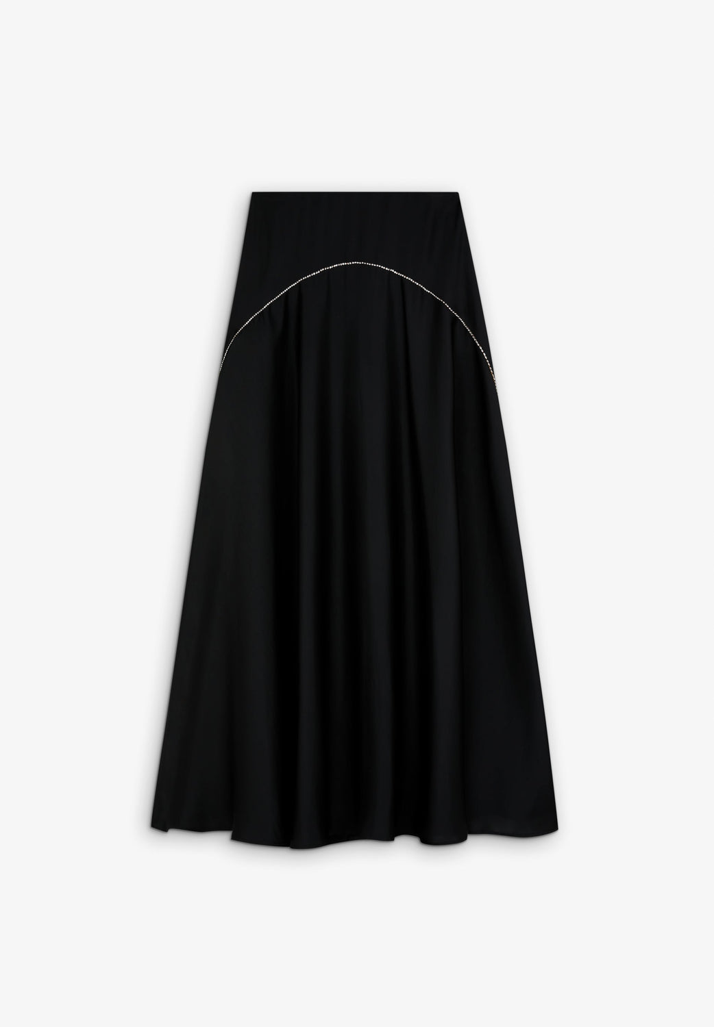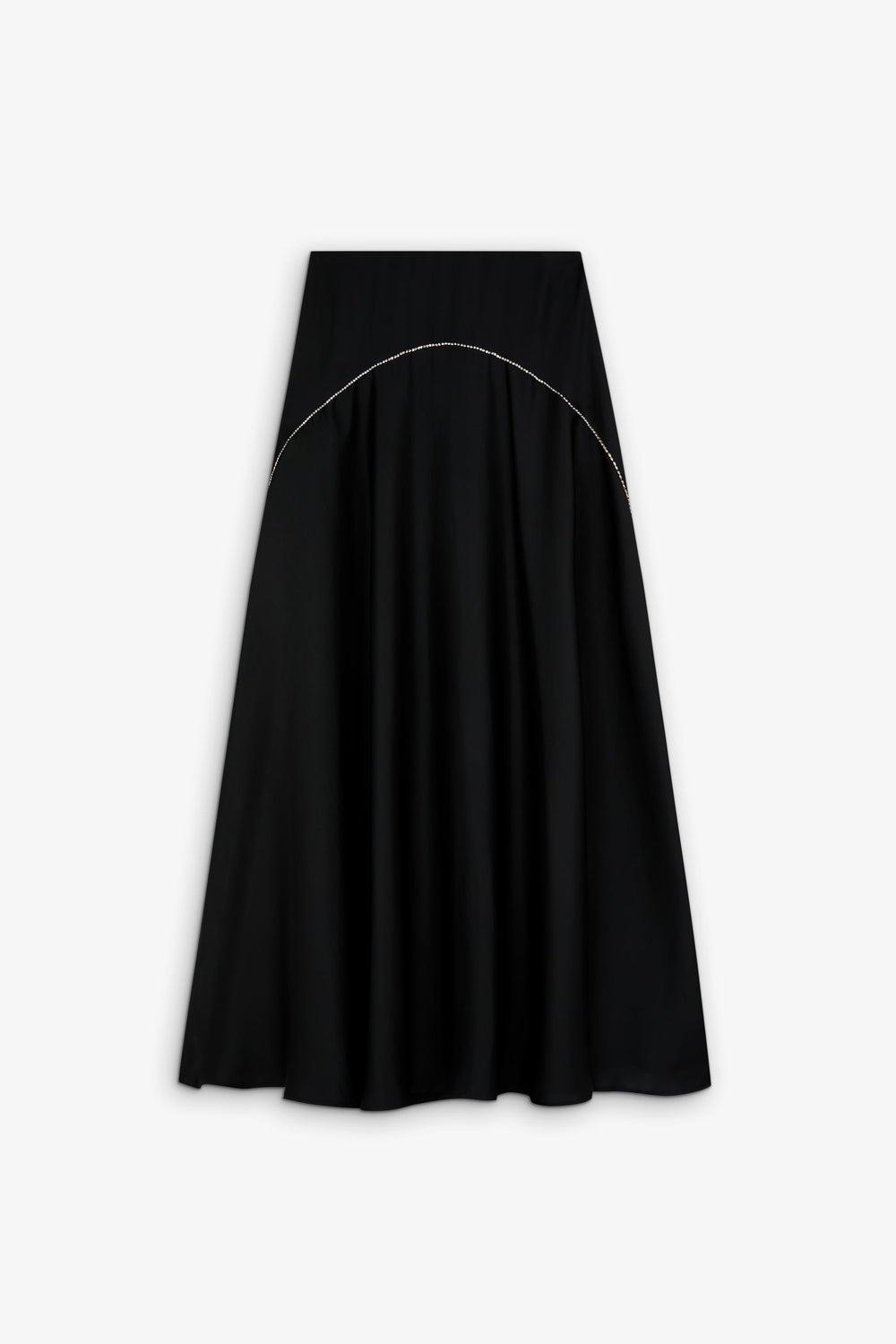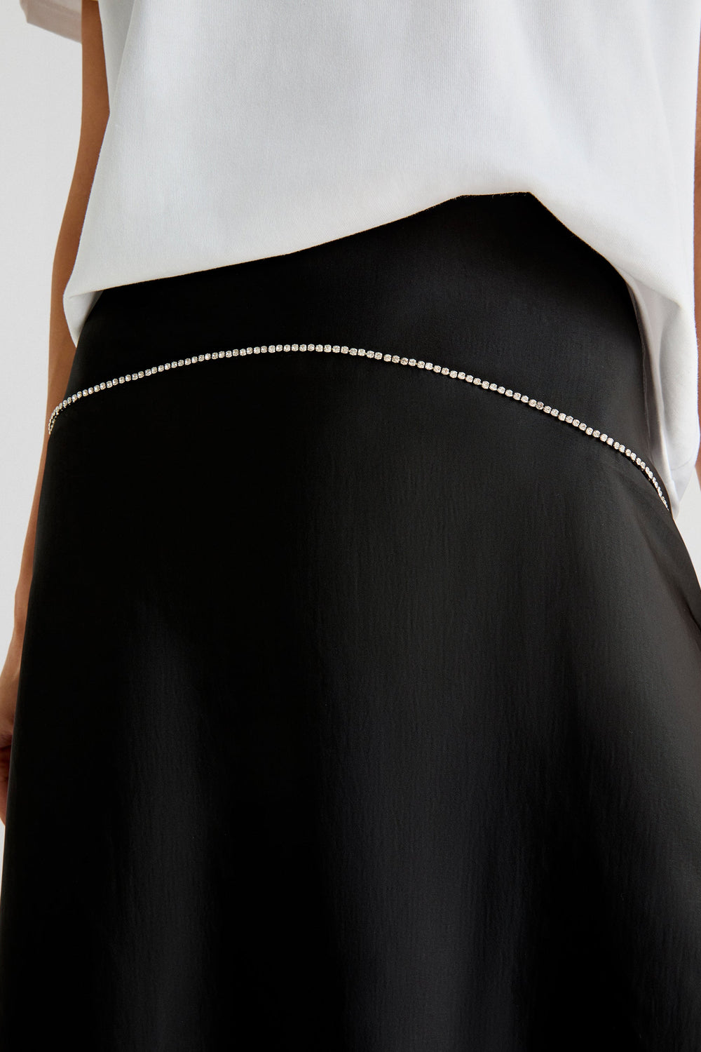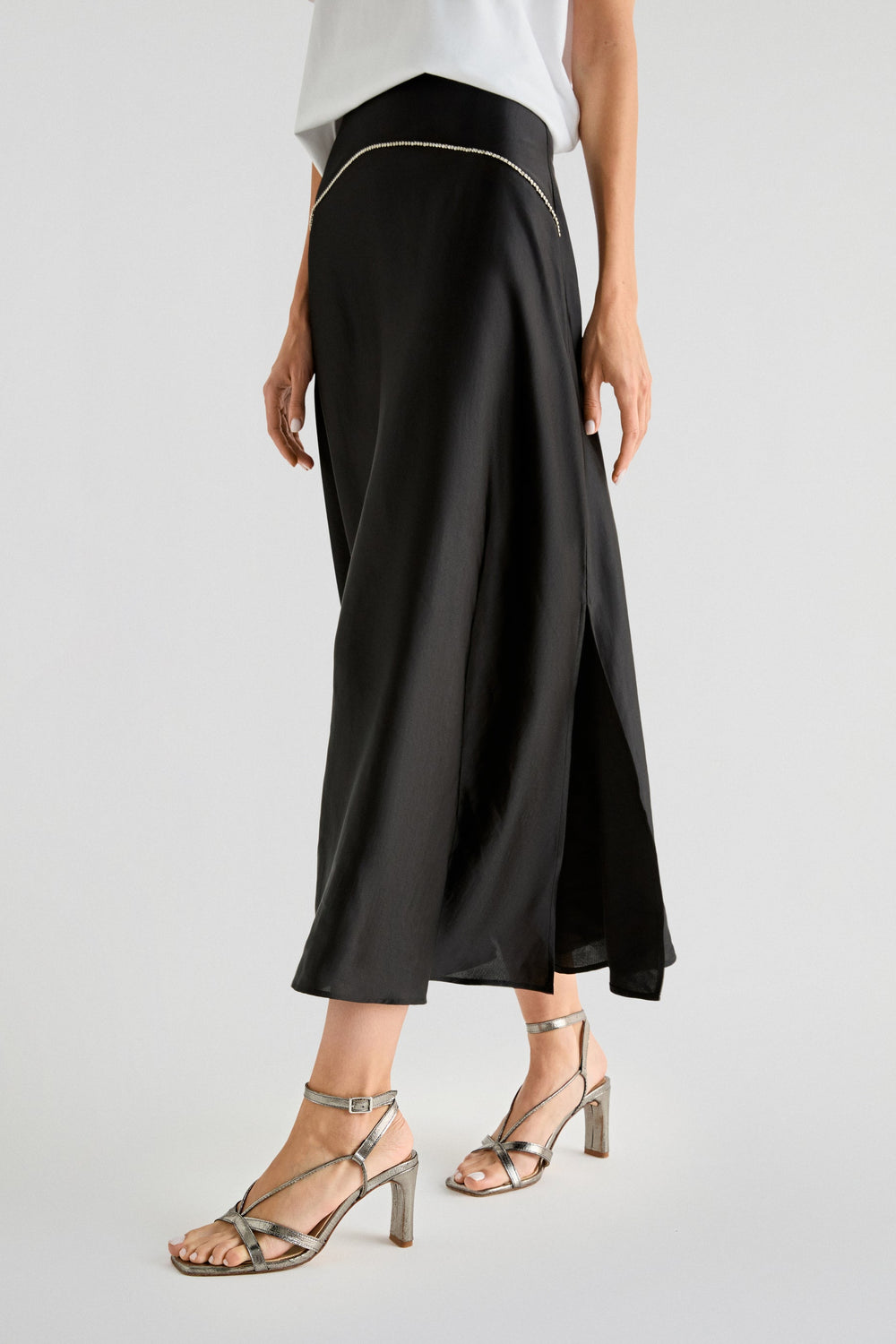 Falda midi confeccionada en tejido satinado. Regular fit, cierre con cremallera lateral y detalle de cristales.